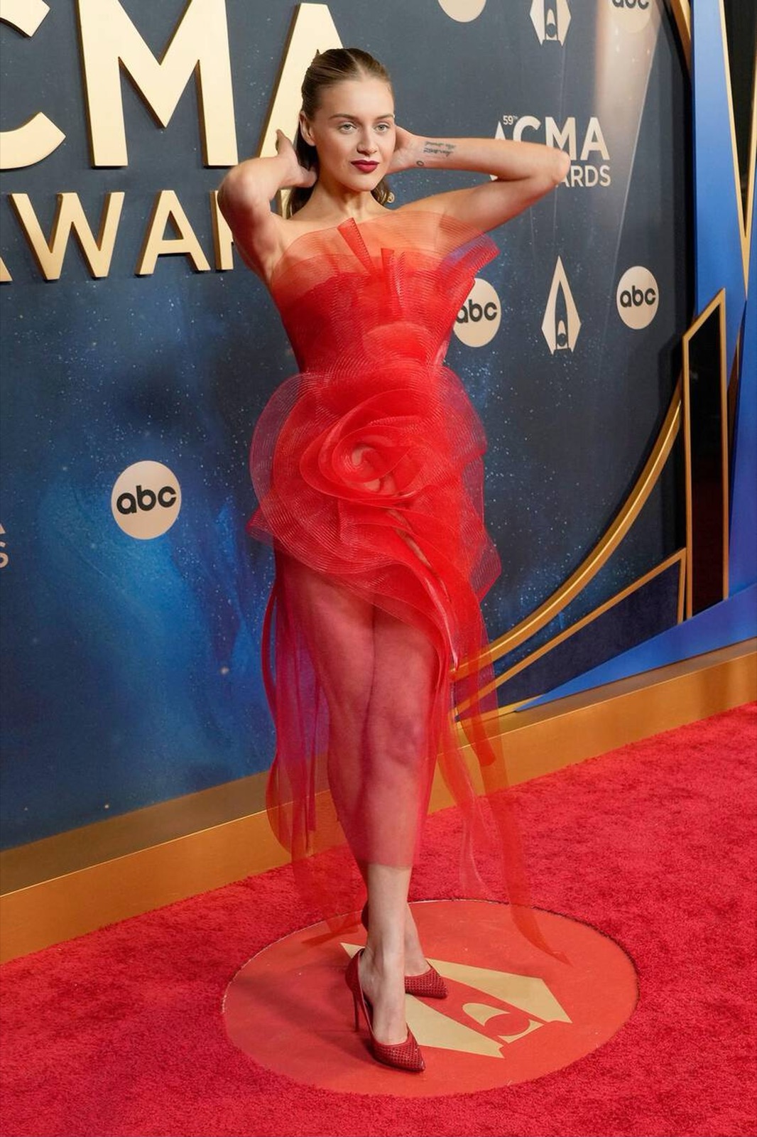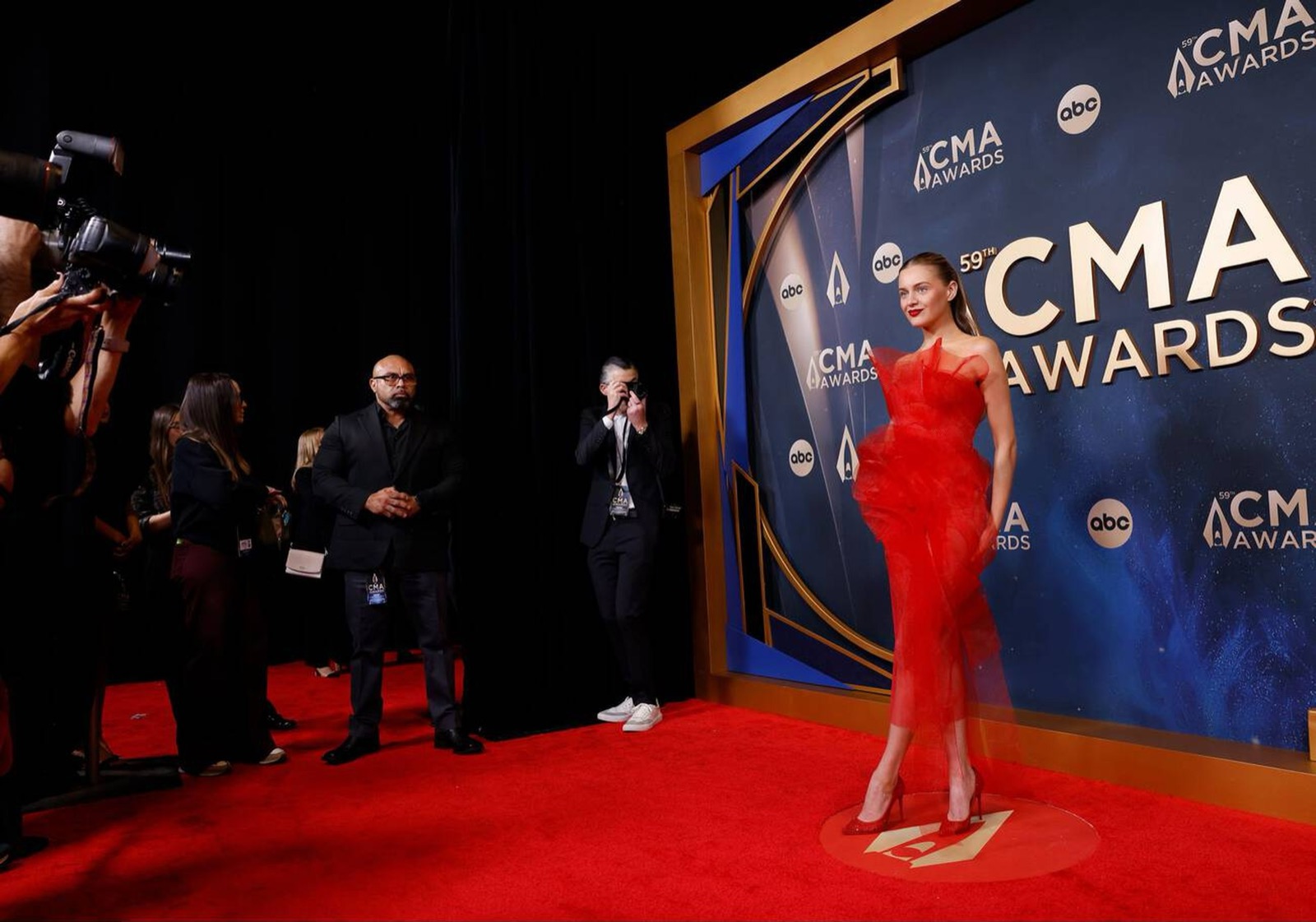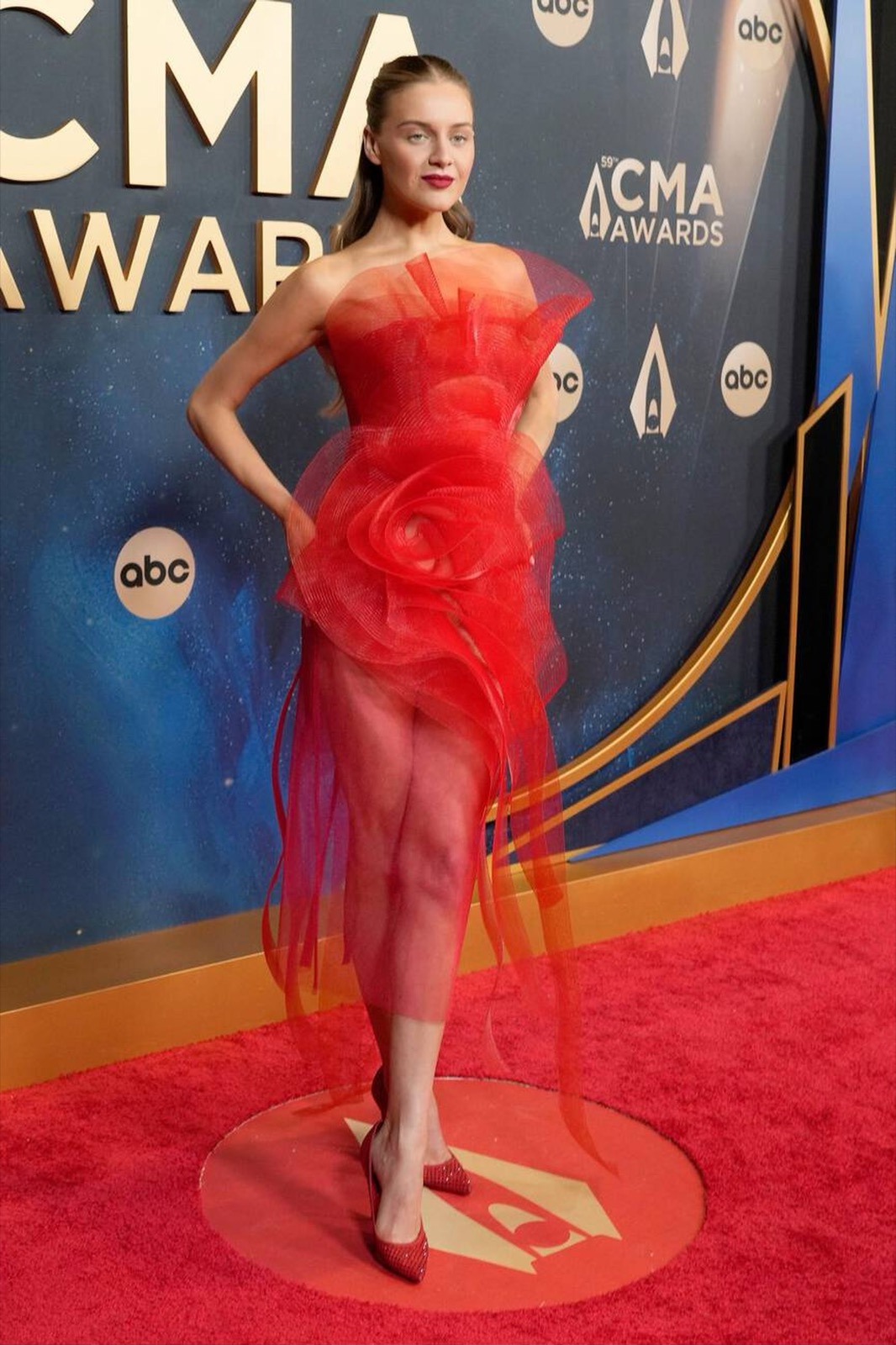 Sur le tapis rouge des CMA Awards, elle arrive en sculpture vivante, enfermée dans un tourbillon rouge transparent qui semble prêt à prendre feu. Chaque mouvement déclenche son propre effet spécial.