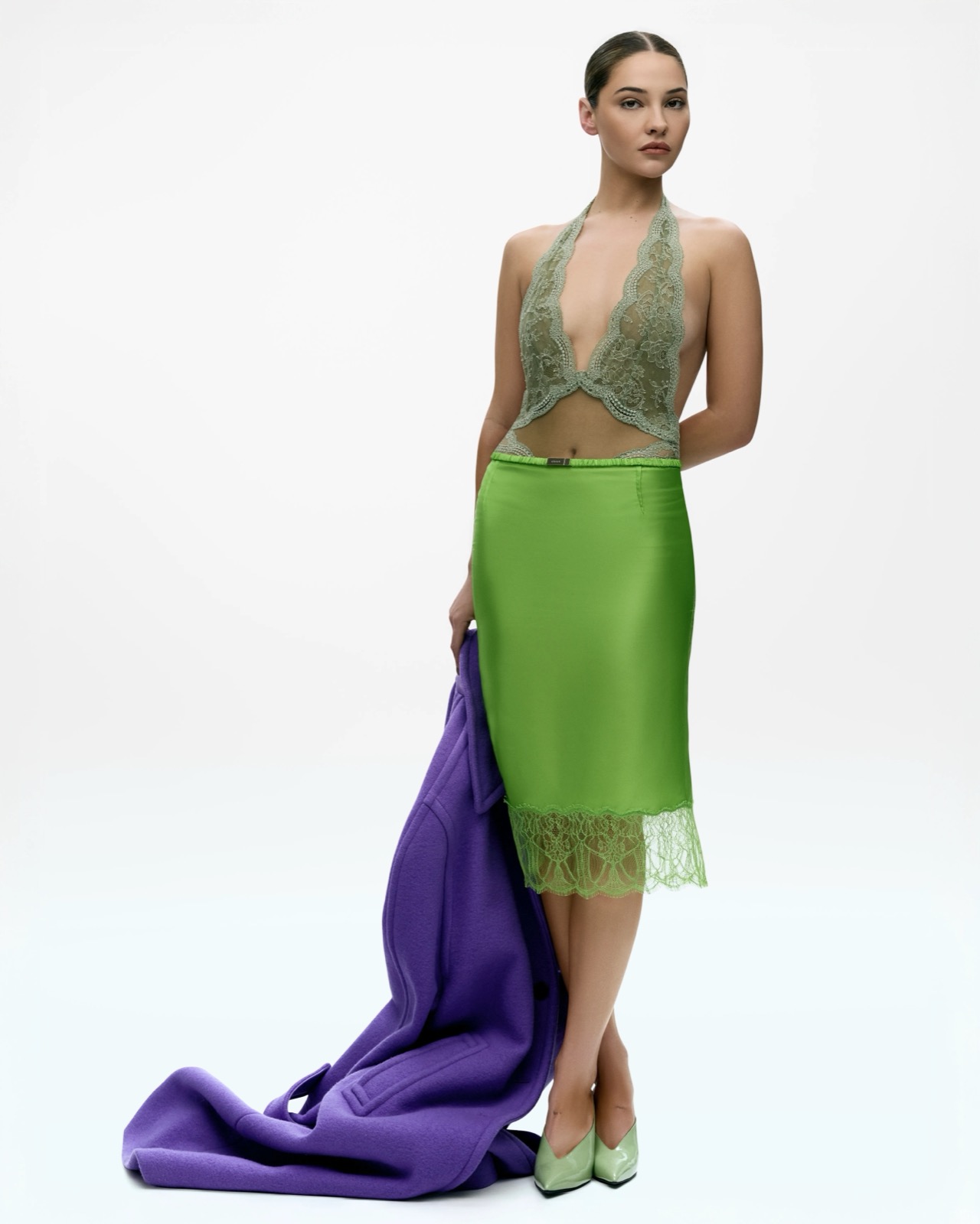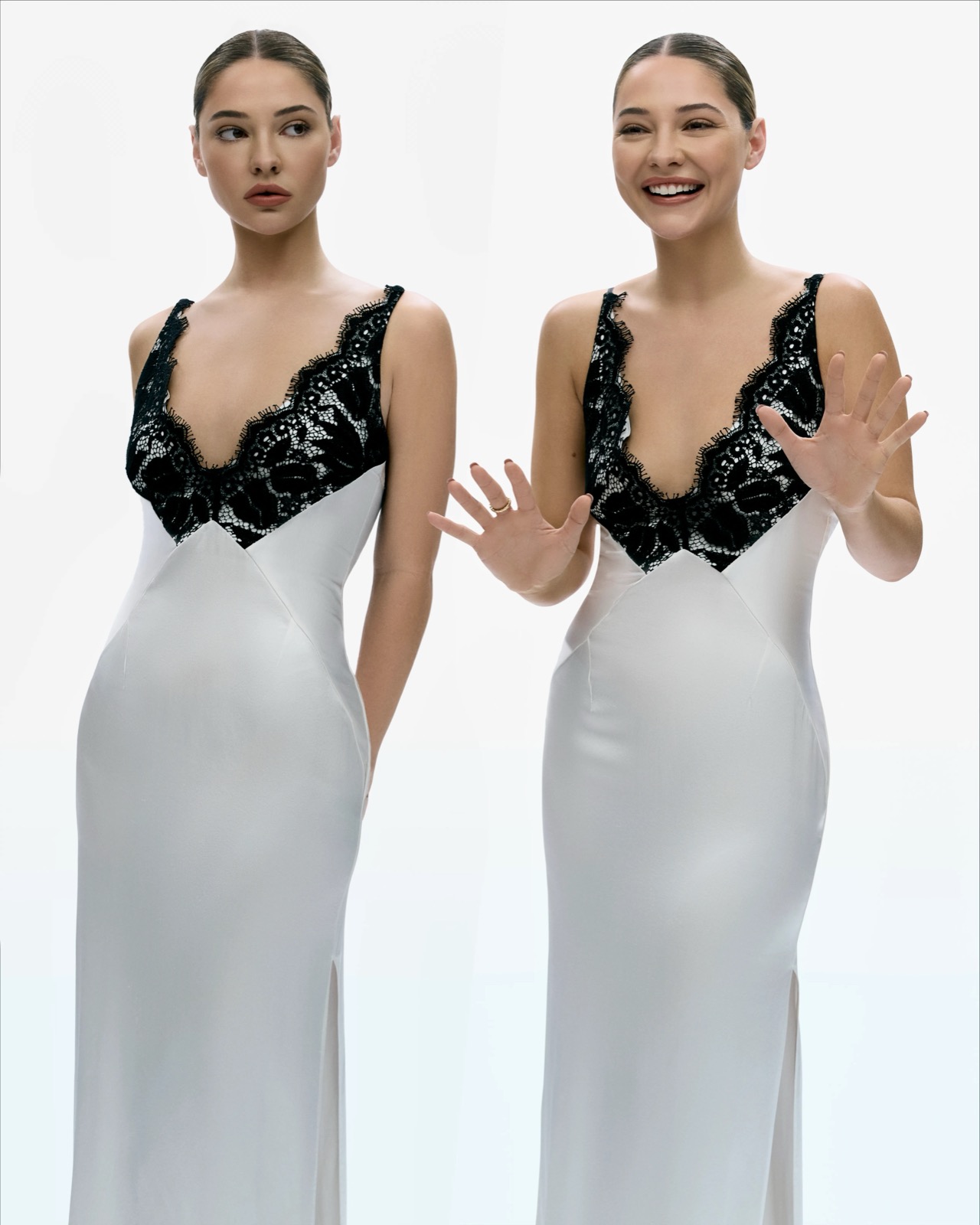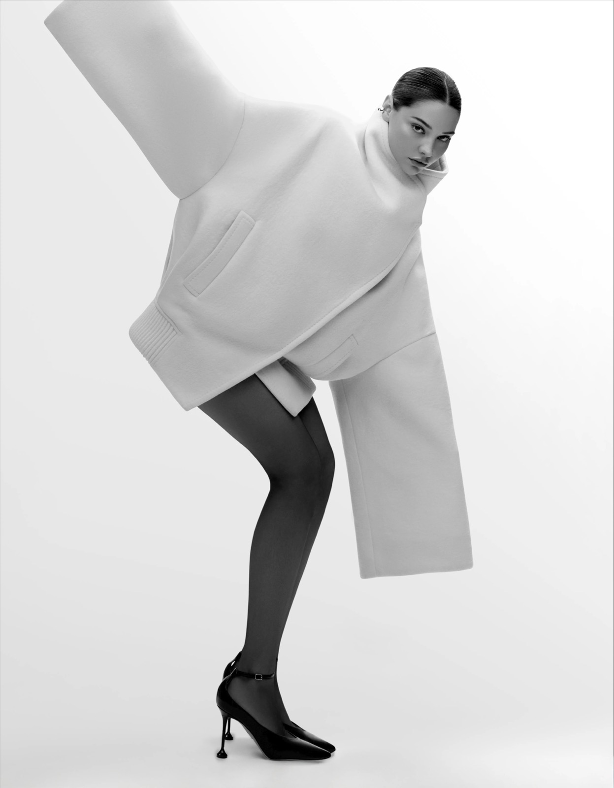 En manteau oversize immaculé, Madelyn Cline devient une statue mouvante : angles nets, regard laser, équilibre parfait entre froideur arty et chaleur mutine.