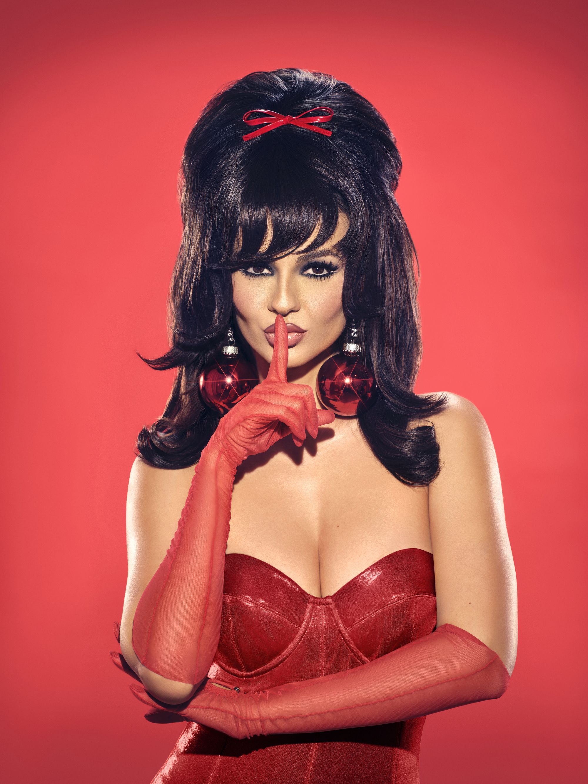 Ensuite, elle surgit d’une boîte géante comme si le Père Noël avait enfin décidé d’emballer le chaos glamour. Le body rouge, les gants brillants : on croirait voir une pin-up sortie d’un film vintage sous acide.