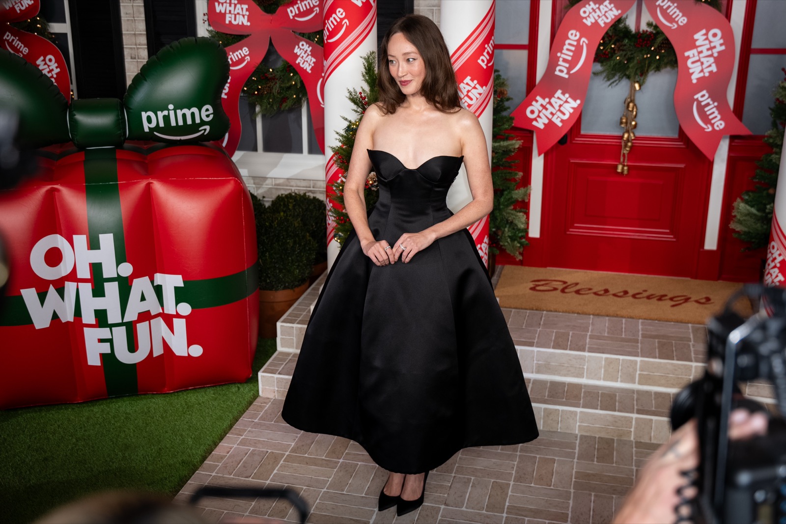 Sur le tapis rouge de Joyeux Noël, Maman !, Havana Rose Liu fait briller sa robe noire plus fort que les guirlandes XXL derrière elle. Le bustier sculpté défie la gravité, pendant que son calme impeccable défie l’ambiance “fête de bureau sous stéroïdes”.