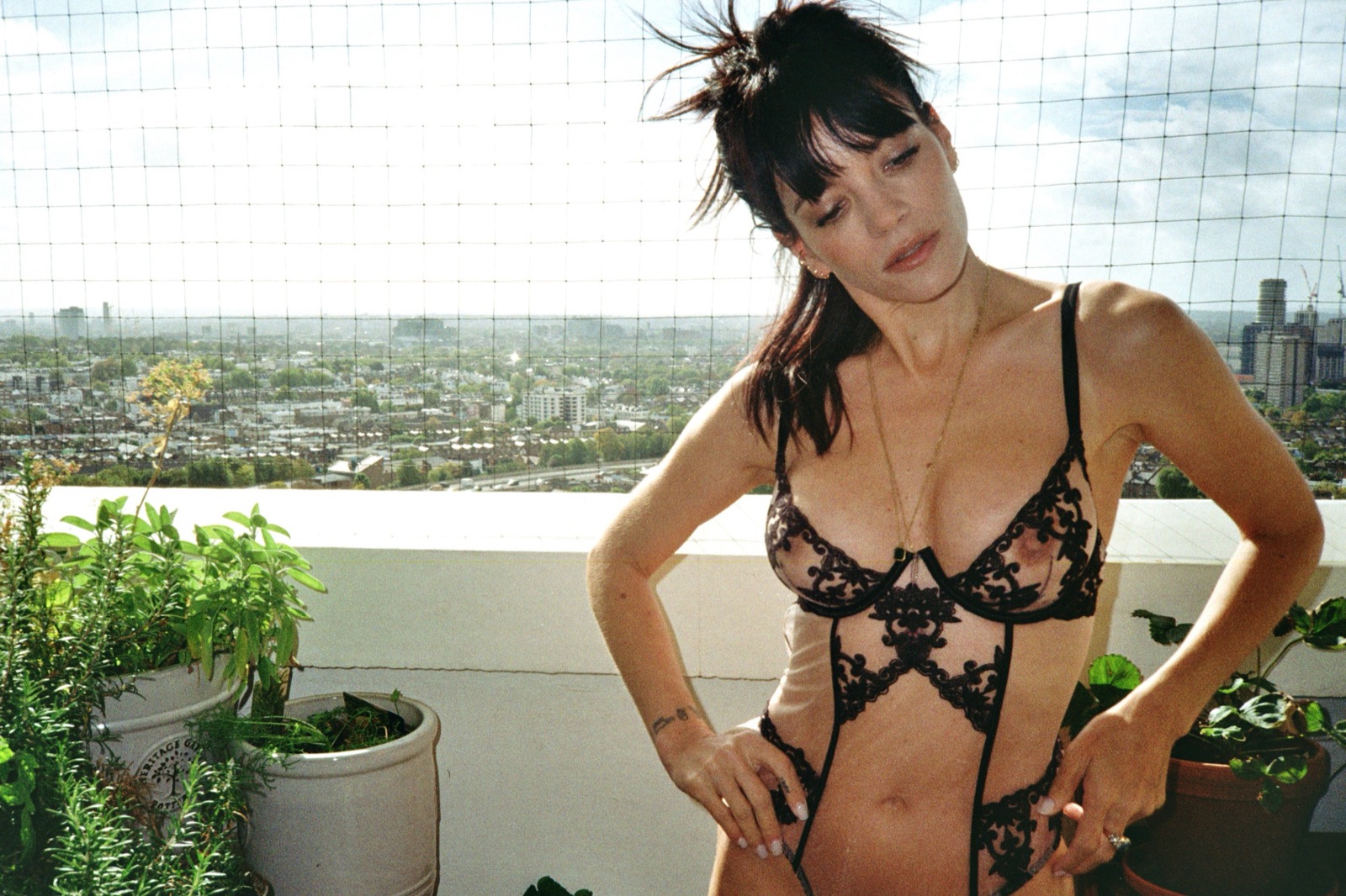 Adossée au bois verni, Lily Allen consulte son téléphone avec le calme d’une reine qui sait que toute la pièce travaille pour elle. Lingerie florale, posture distraite : l’art de faire semblant de ne pas poser.