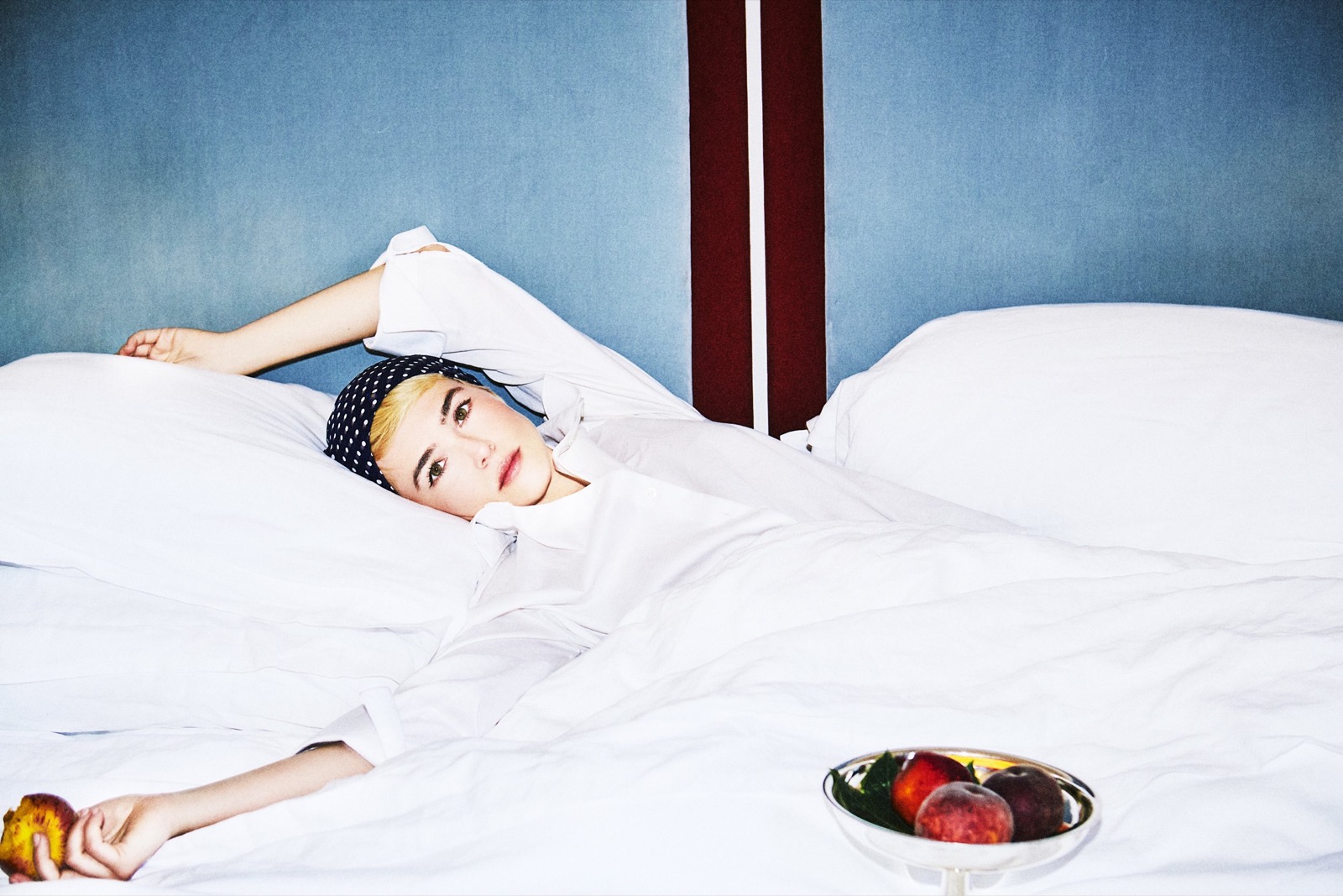 Coupe courte, bouche rouge, regard frontal : Zoey retire tout le superflu et laisse le silence faire le sale boulot.