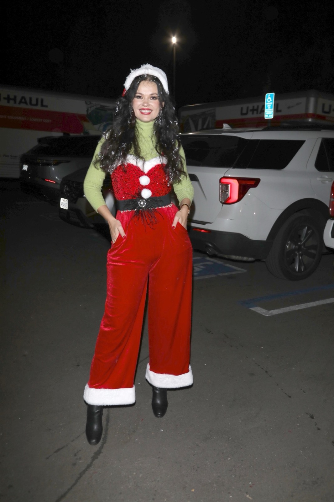 Entre le bonnet festif et la ceinture qui serre la taille, elle ressemble à un cadeau déjà déballé. Le genre de look qui dit : oui c’est Noël, oui il fait nuit, et oui je suis clairement la meilleure déco du coin.