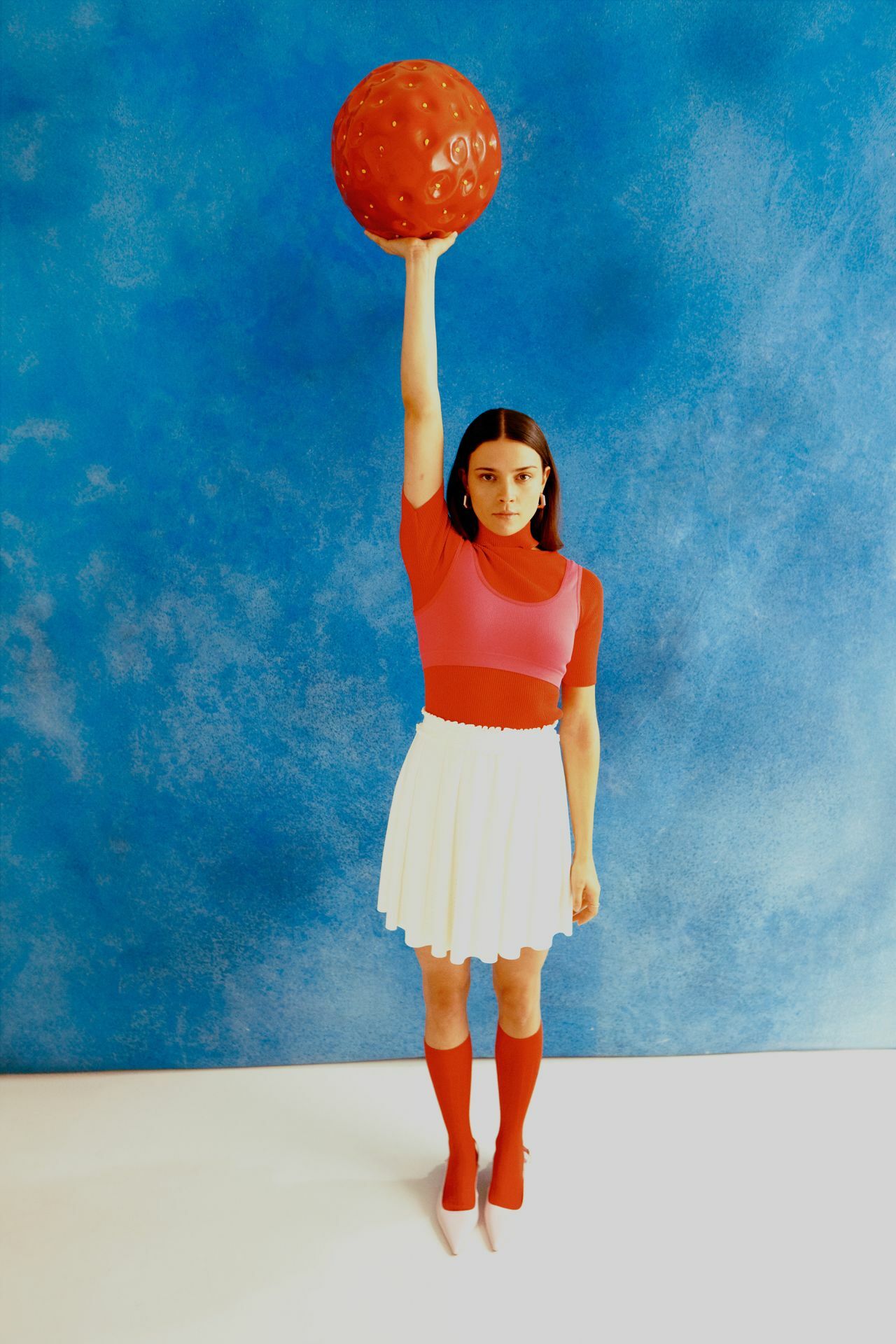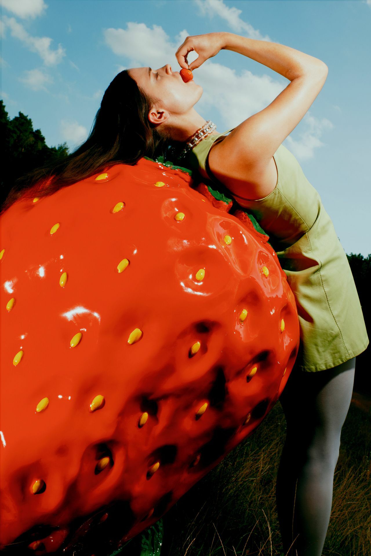 Entre fraise pop géante et poses ultra composées, la série flirte avec l’absurde chic. Les couleurs claquent, le styling provoque, et Harriet garde ce calme insolent qui rend tout crédible.