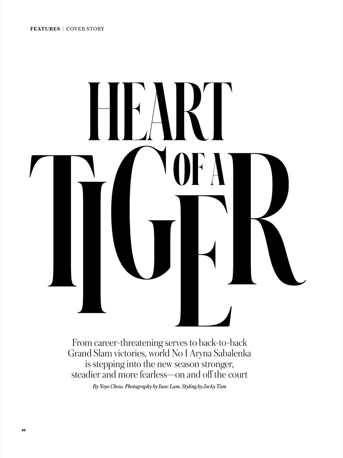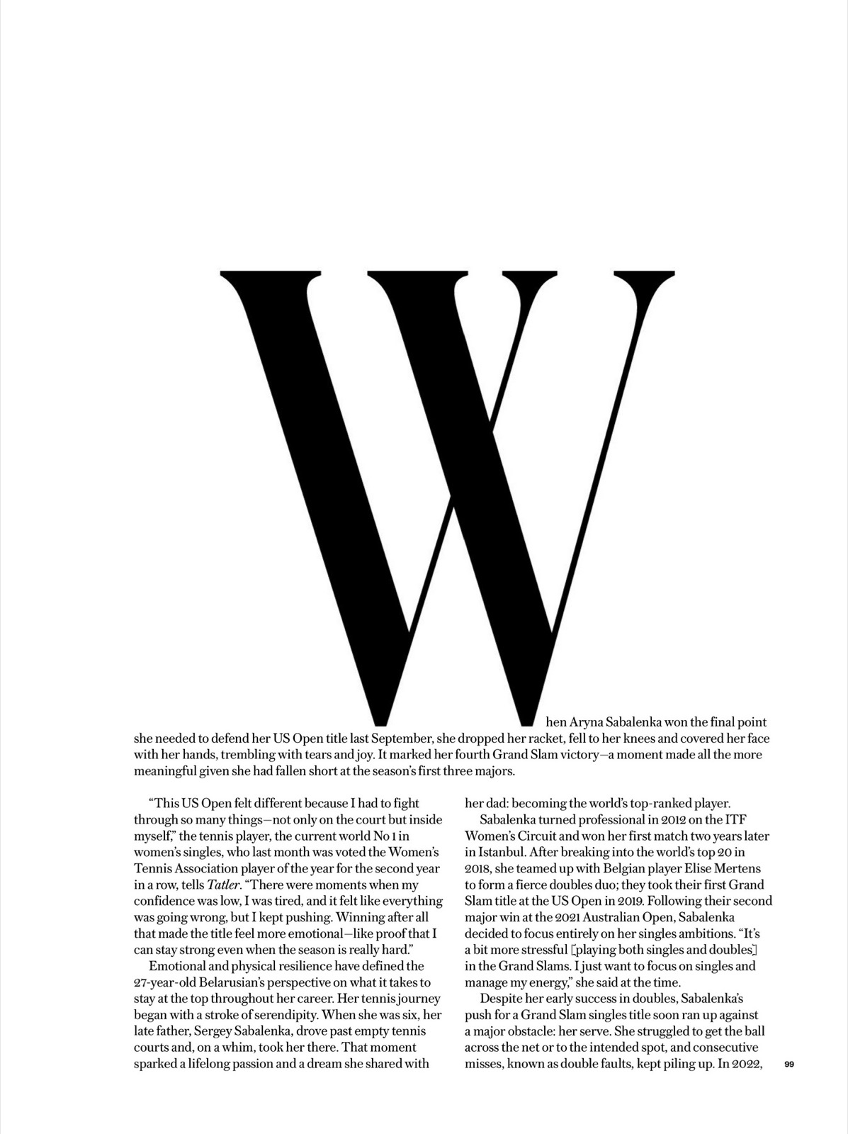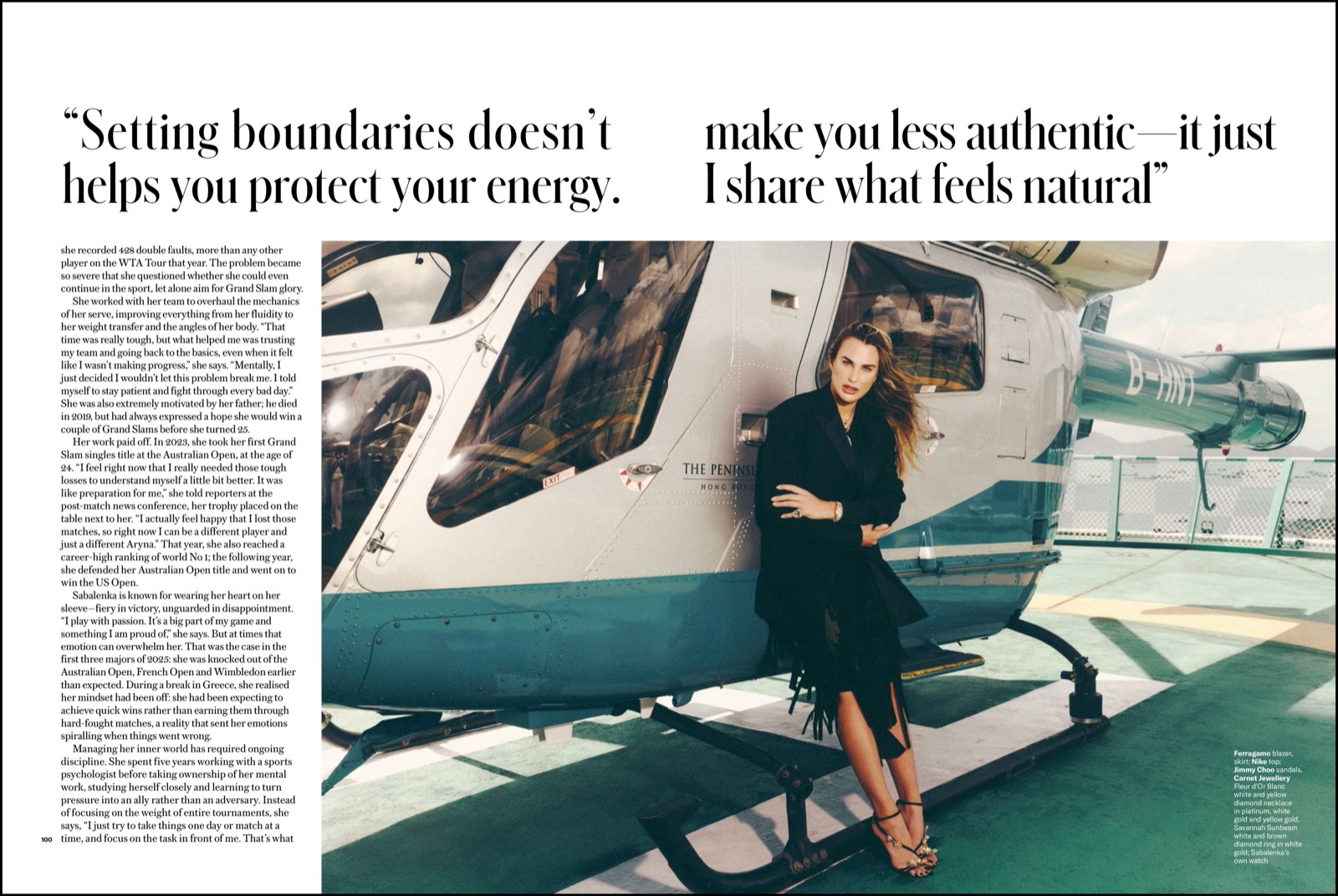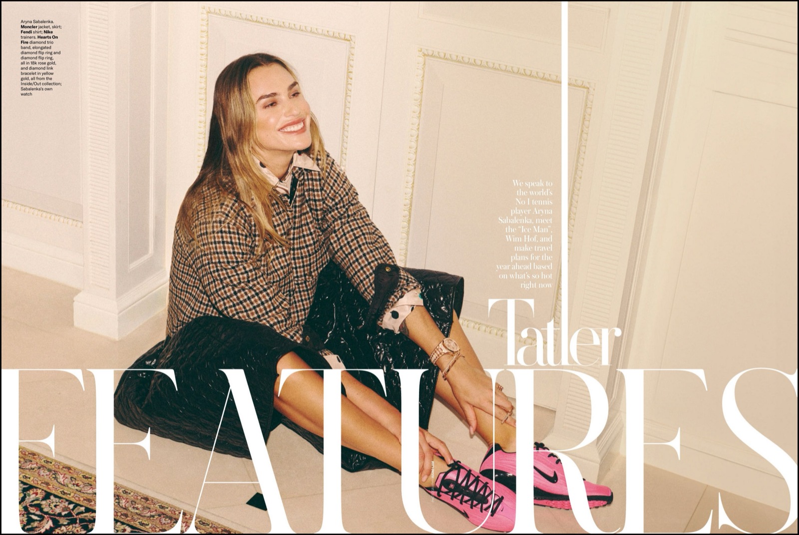 Aryna Sabalenka en couverture de Tatler Hong Kong, tennis posé sur tapis chic