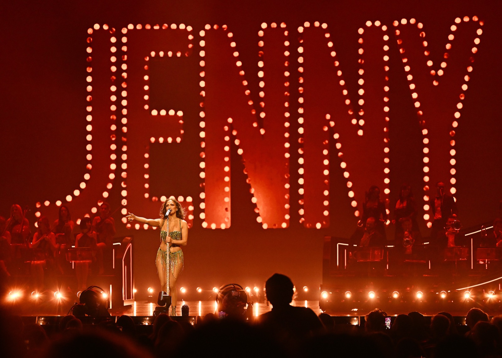 Jennifer Lopez s’étale sur scène comme un bijou trop bien rangé : corset nude, franges dorées, poses millimétrées. Même allongée, tout semble répété, vérifié, validé par Las Vegas. Les bras s’ouvrent, le sourire s’allume, la robe rose caresse le décor comme une promesse parfaitement emballée. Rien ne dépasse, surtout pas l’imprévu.