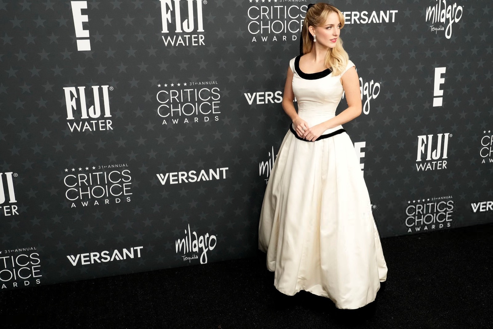 Mckenna Grace arrive aux 31e Critics Choice Awards à Santa Monica avec une robe qui récite la leçon : blanc propret, noir discipliné, volume bien élevé. Tout est à sa place, même le regard, soigneusement calibré entre “je souris” et “je me tiens droite”. On sent l’effort, la tenue surveillée, le glamour tenu en laisse comme un animal trop jeune pour mordre.