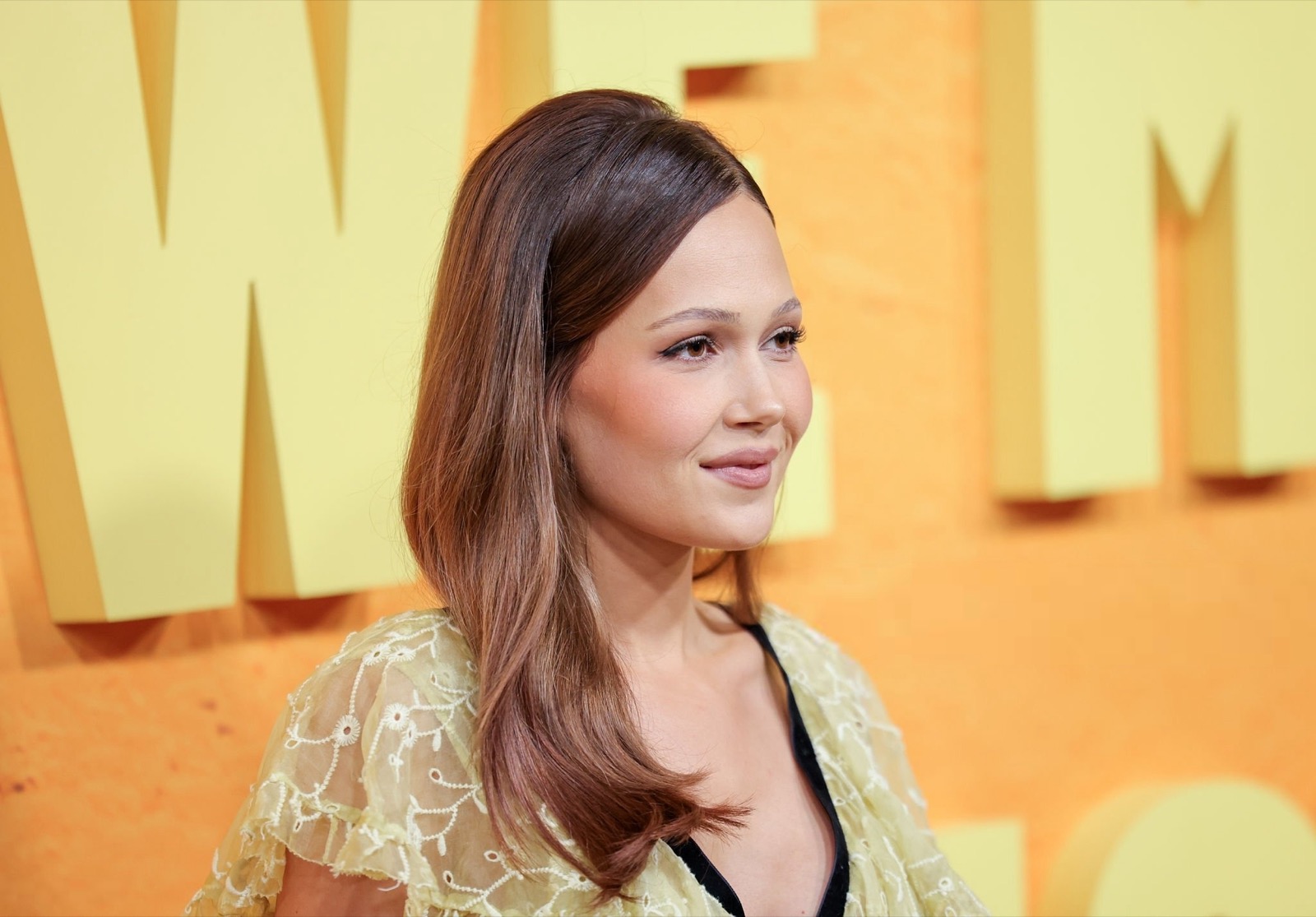 Kelli Berglund débarque à la première Netflix en robe jaune pâle façon nappe de baptême premium. Dentelle partout, nœud noir sérieux, regard poli. Elle pose comme si on lui avait dit élégante oui, drôle non. Le fond orange hurle vacances pendant que la tenue murmure réunion de famille.