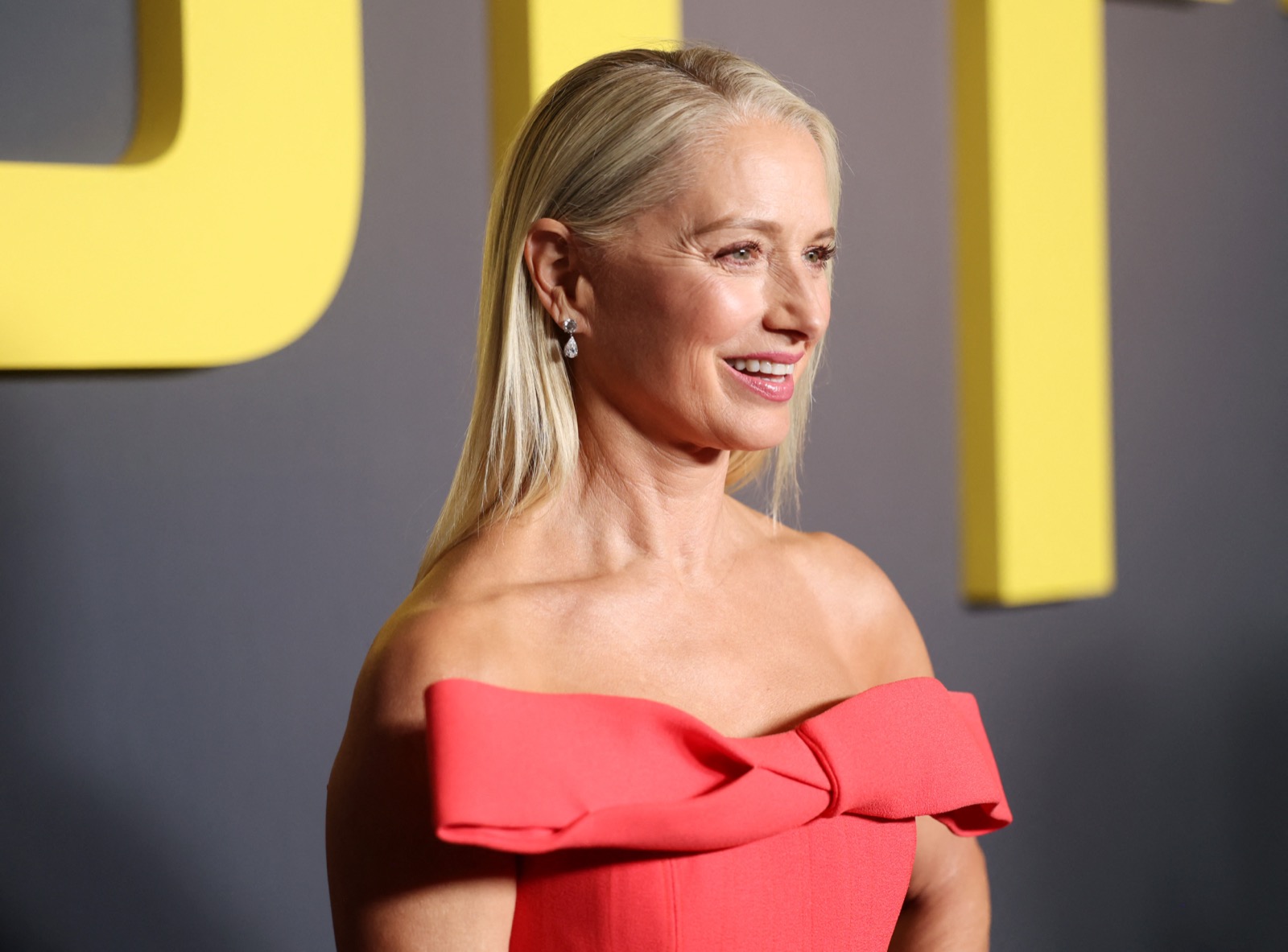 Robe corail ultra-flash, sourire laser et mur jaune géant : on dirait une alarme incendie qui a pris des talons.