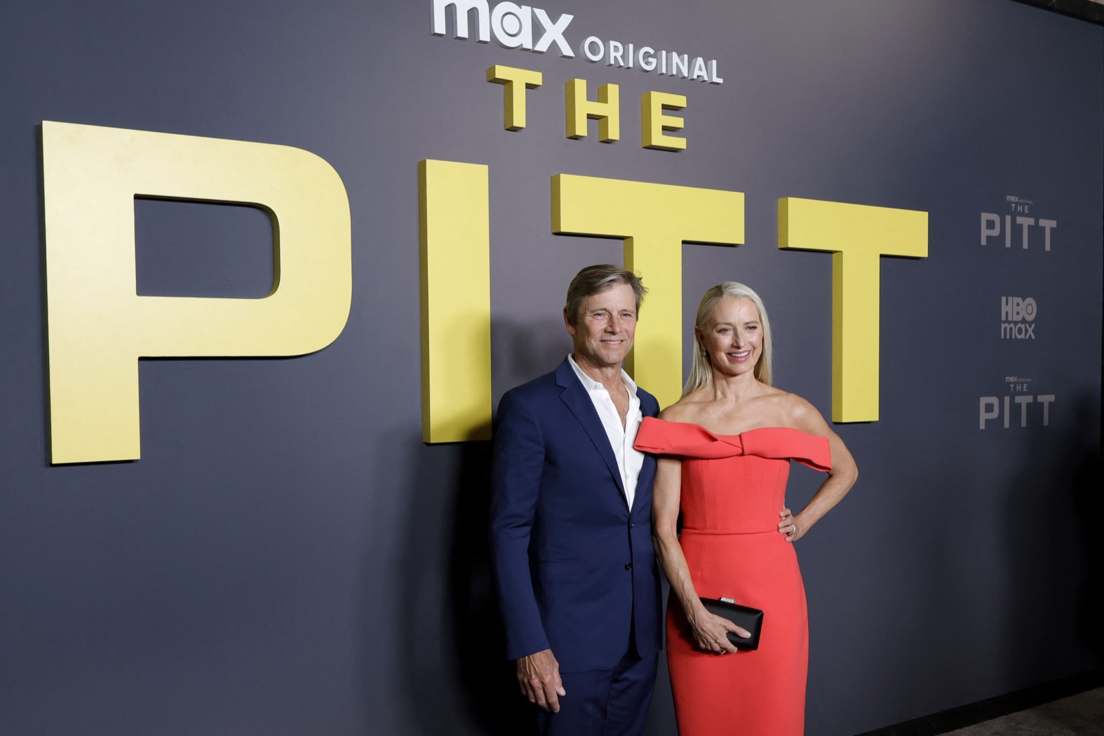 Katherine LaNasa débarque à la première L.A. de The Pitt, série dramatique diffusée sur HBO Max, gainée dans une robe corail qui hurle plus fort que l’affiche géante derrière elle.
