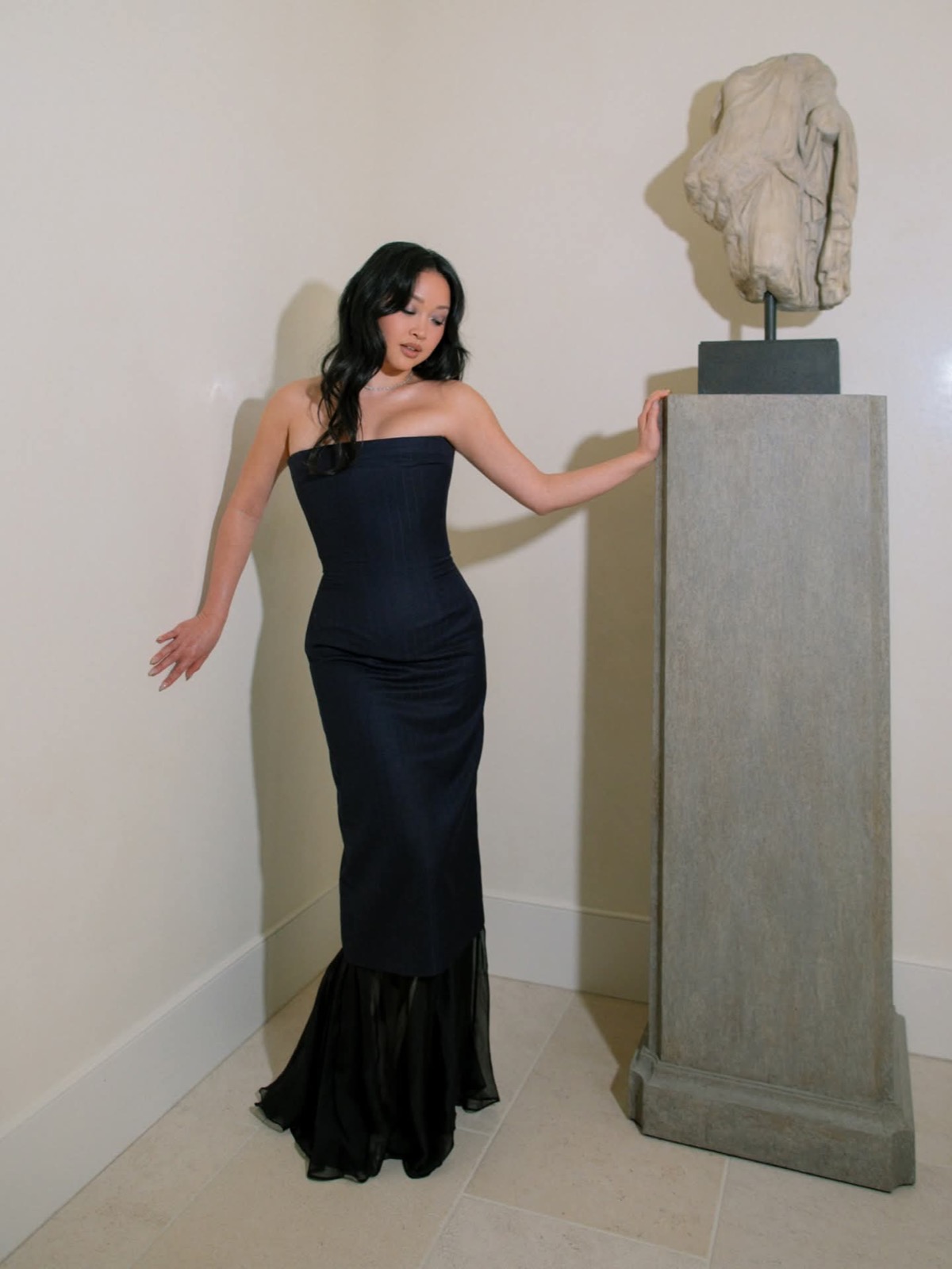 Cette robe noire joue les pensionnaires modèles pendant que son regard promet des bêtises aux photographes déjà en sueur.