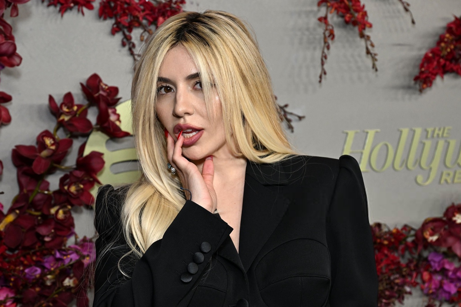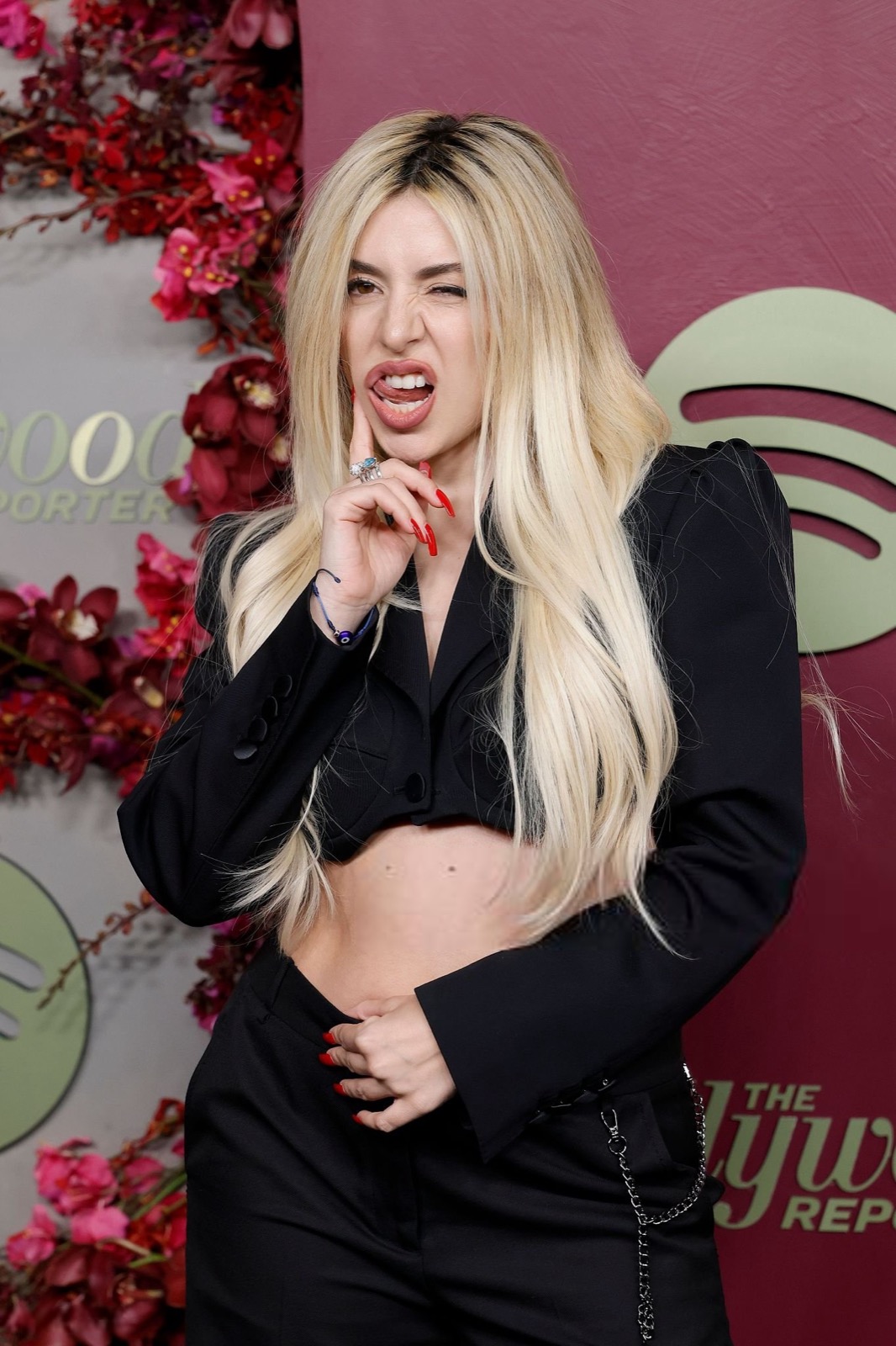 Ava Max arrive à la Golden Week de The Hollywood Reporter et Spotify en costume noir ultra pro, sauf là où ça déborde. Son ventre s’invite comme un gag visuel pendant que ses poses passent du mannequin à la blague ratée.
