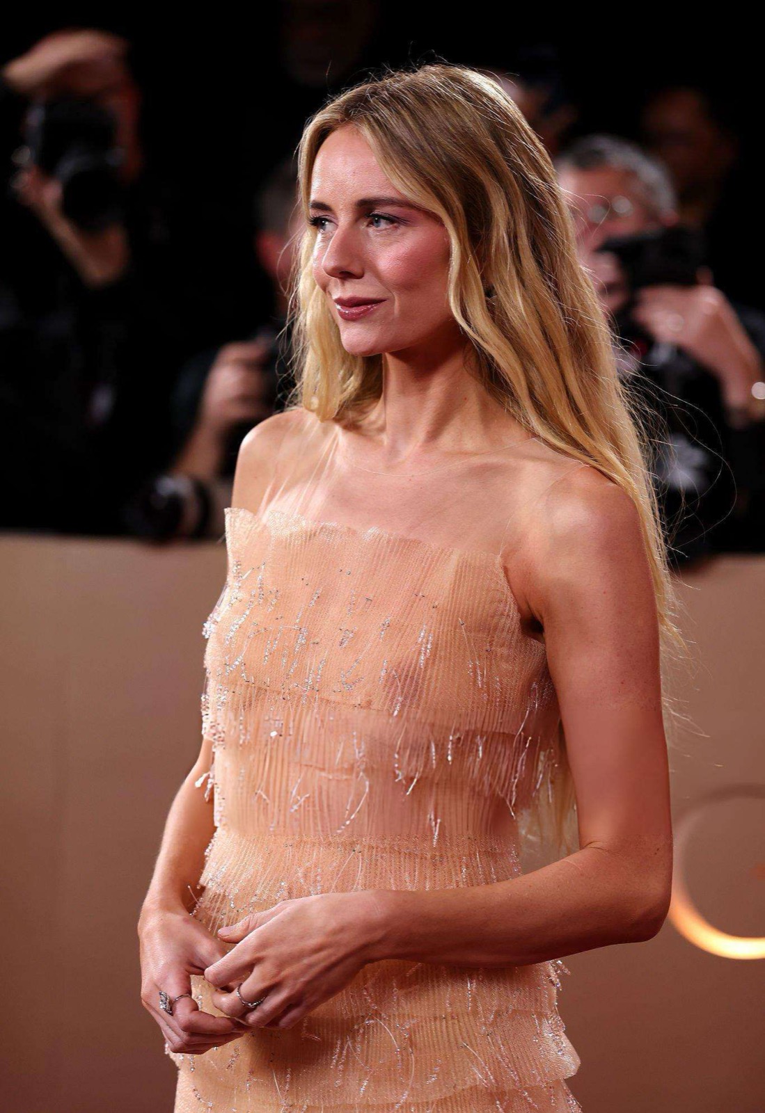 Robe couleur peau, étages de tulle frémissant, elle avance comme un millefeuille très chic qui aurait oublié le four, sous les flashs mondains sans sourciller.