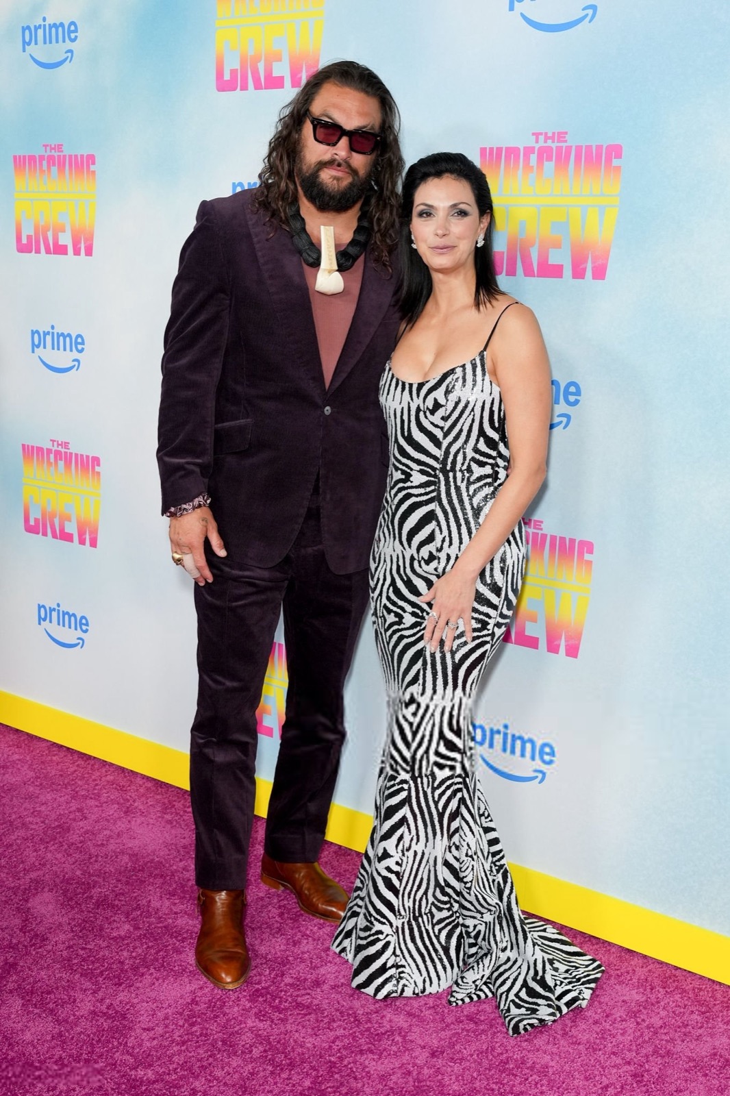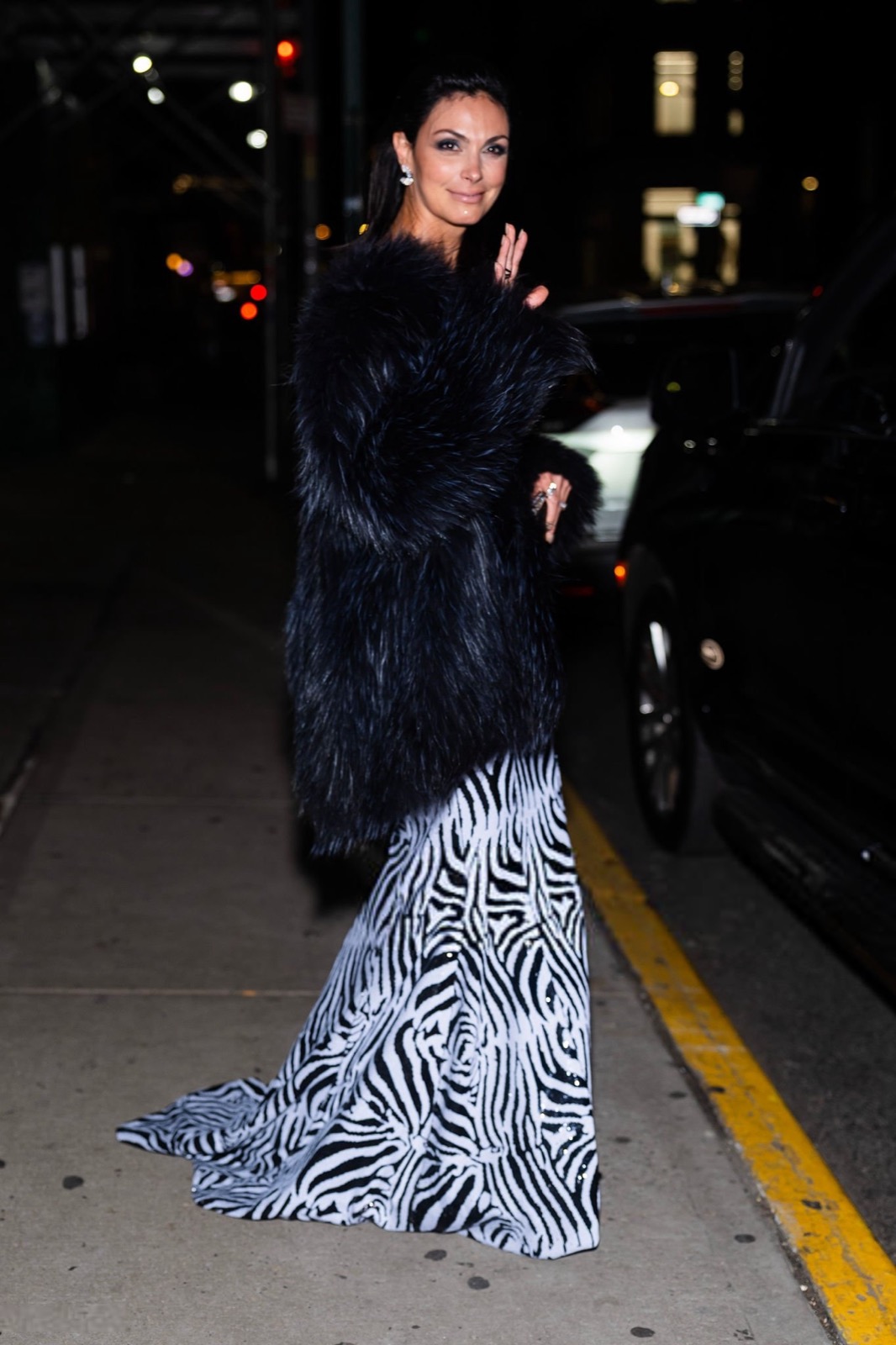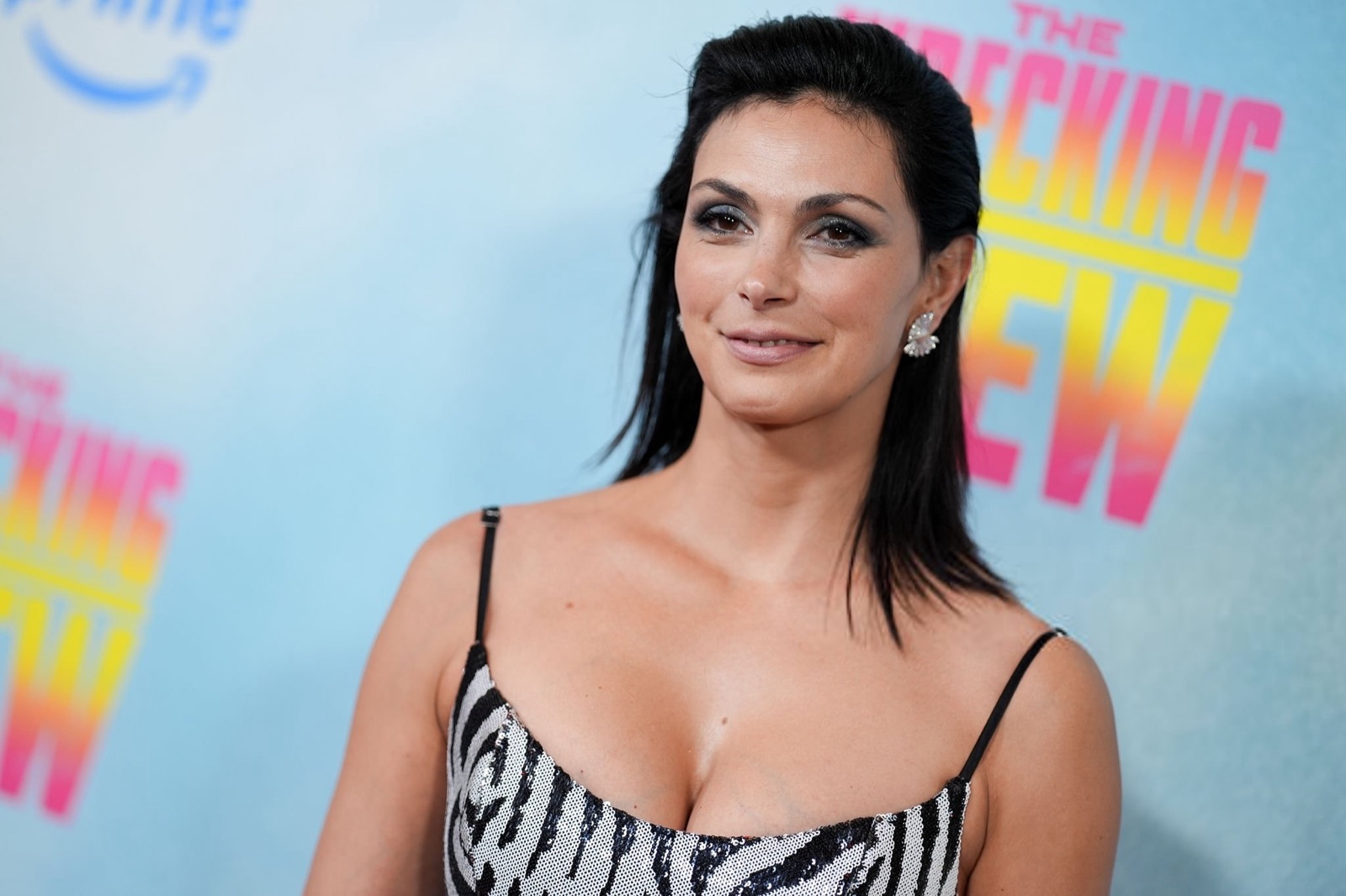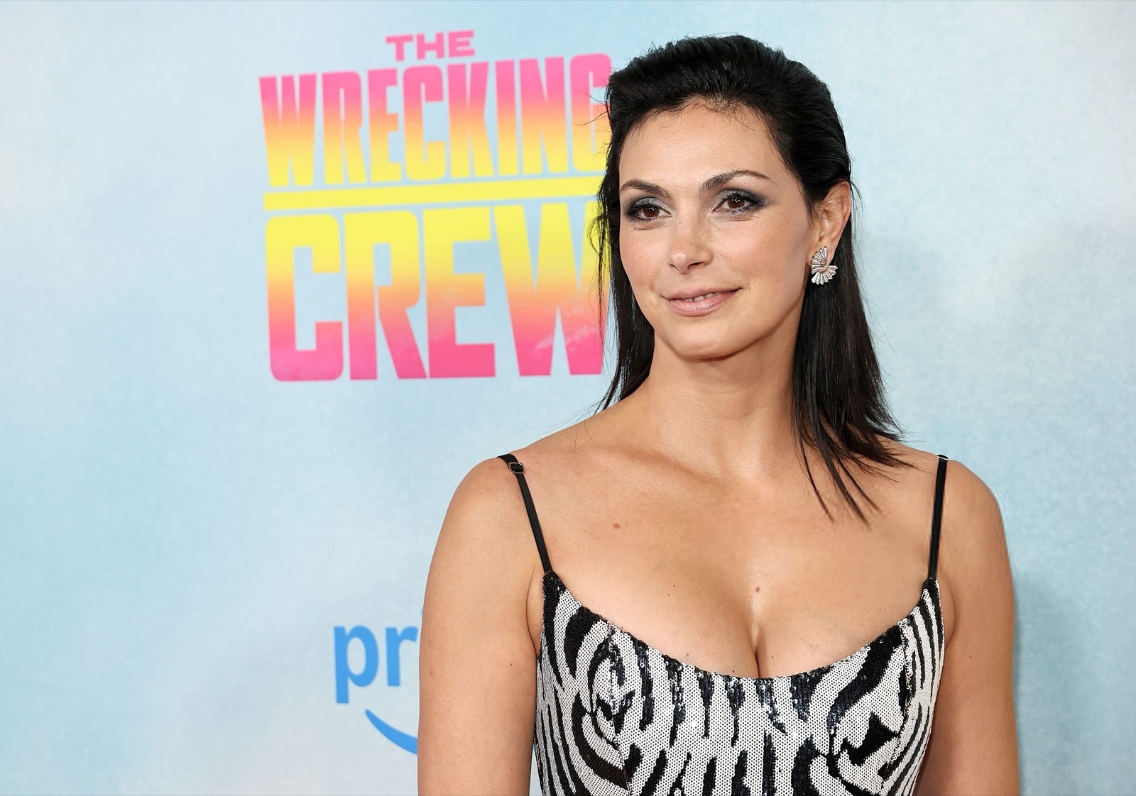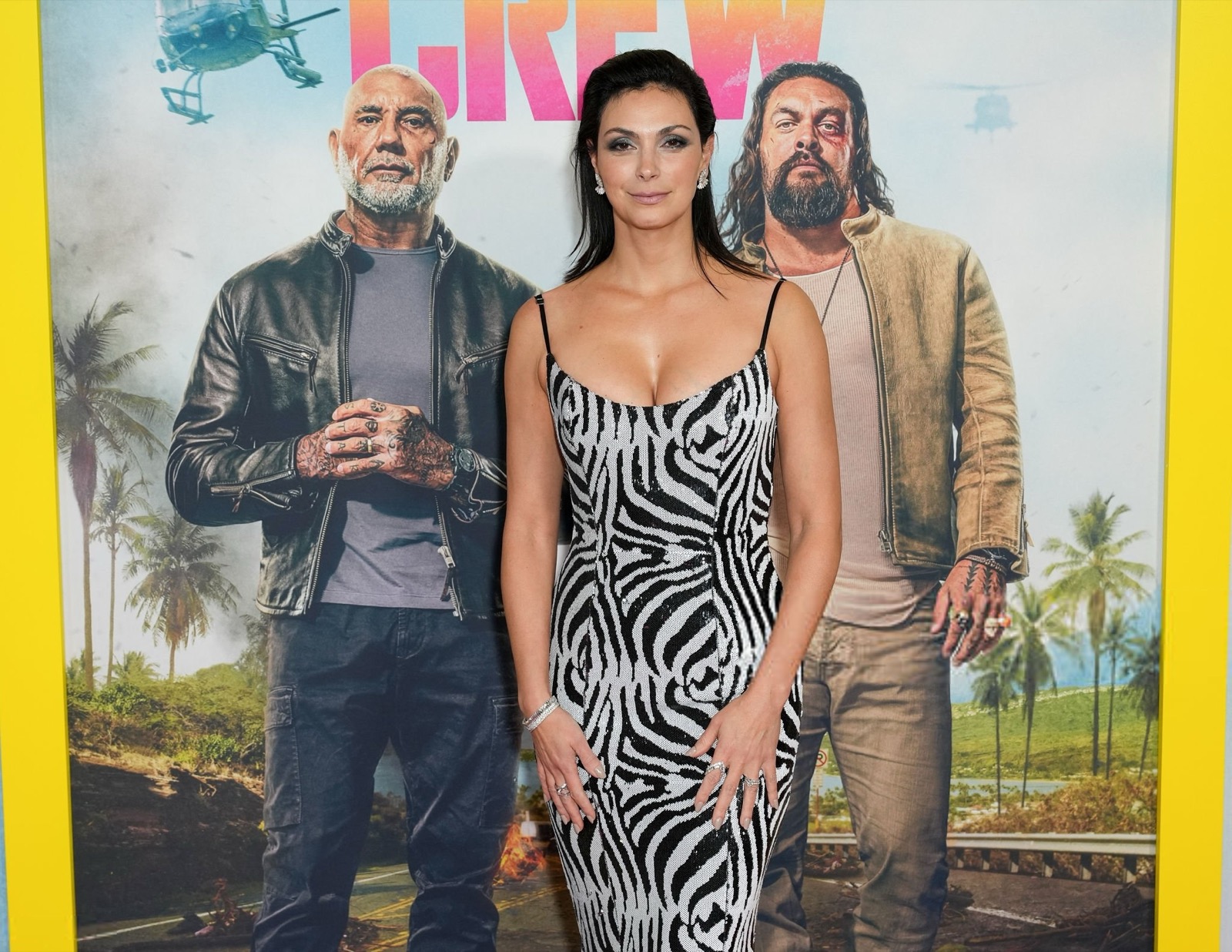 Robe zébrée ultra moulante, bretelles fines et maintien héroïque, Morena Baccarin joue la jungle chic, version tapis rouge, comme si le dress code disait animal sauvage, sourire parfaitement dompté devant les flashes surexcités du soir.