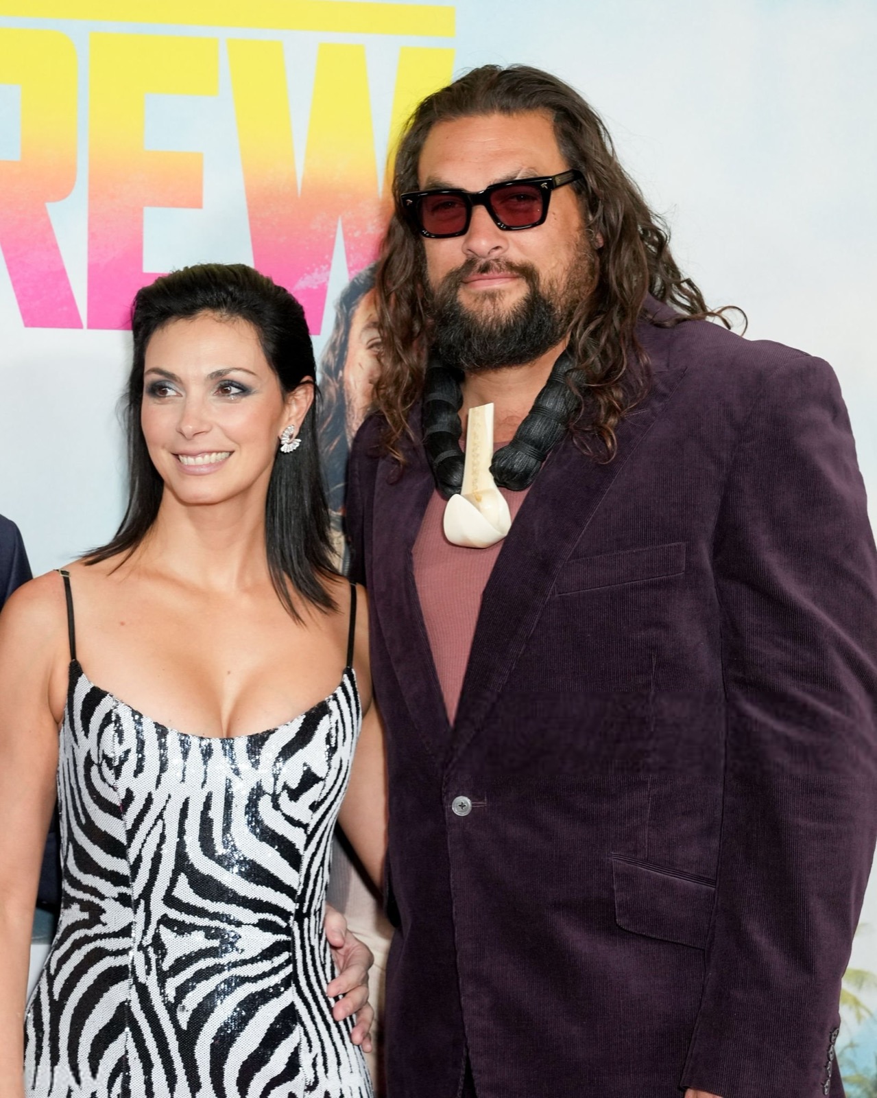 Devant l’affiche musclée, elle arrive en robe zébrée très disciplinée, sourire calme, décolleté concentré, comme si la soirée exigeait du sérieux… mais pas trop.