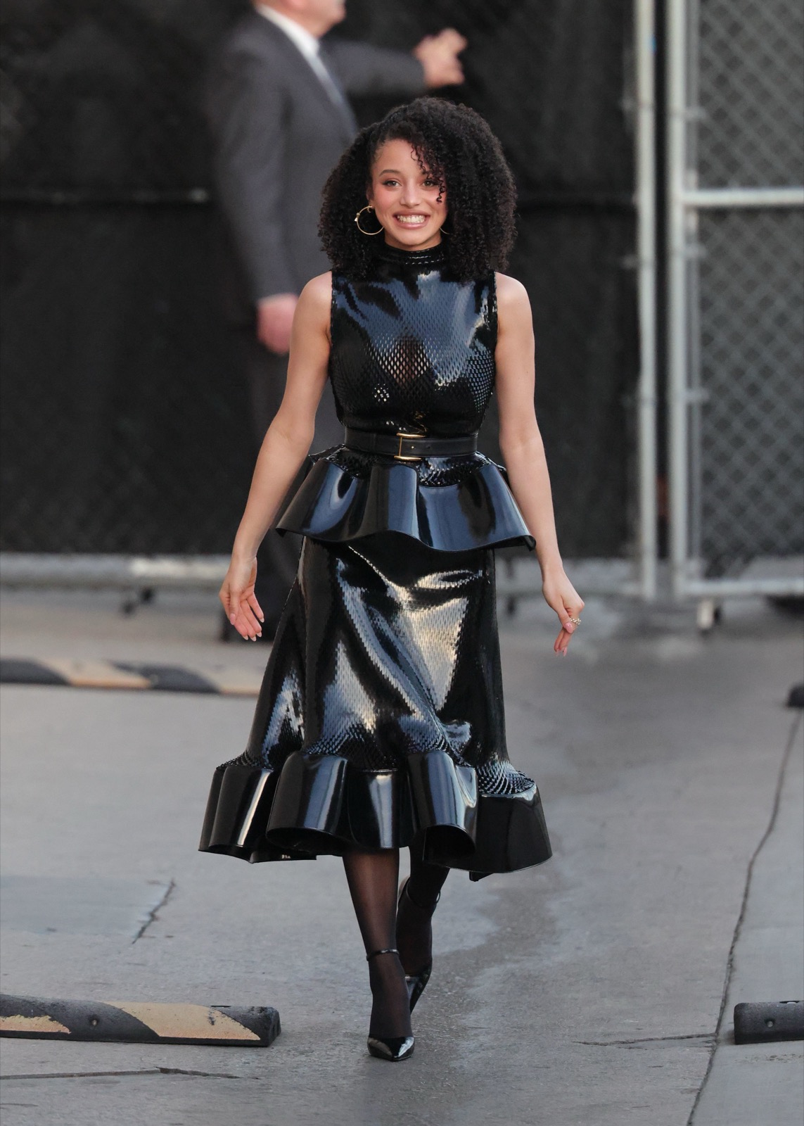 Robe noire laquée, taille ceinturée, mains levées, Chase Infiniti sourit large, tellement brillante que la lumière glisse, et la jupe semble prête à applaudir avant le public assis.