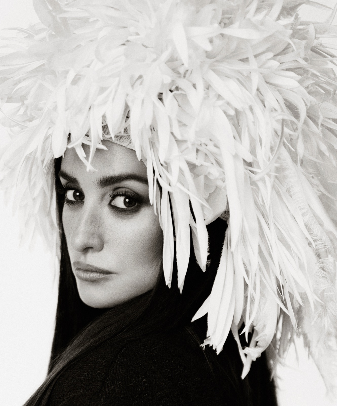 Penélope Cruz couvre W China, plume, jambe, regard dangereux