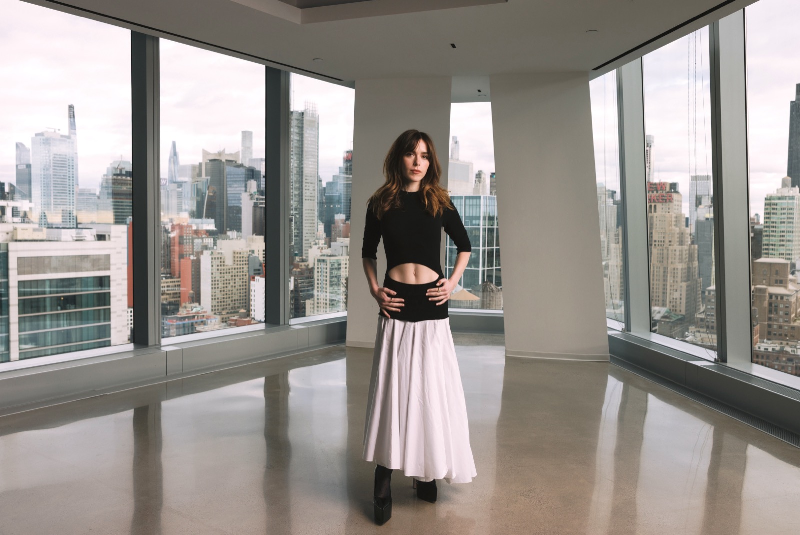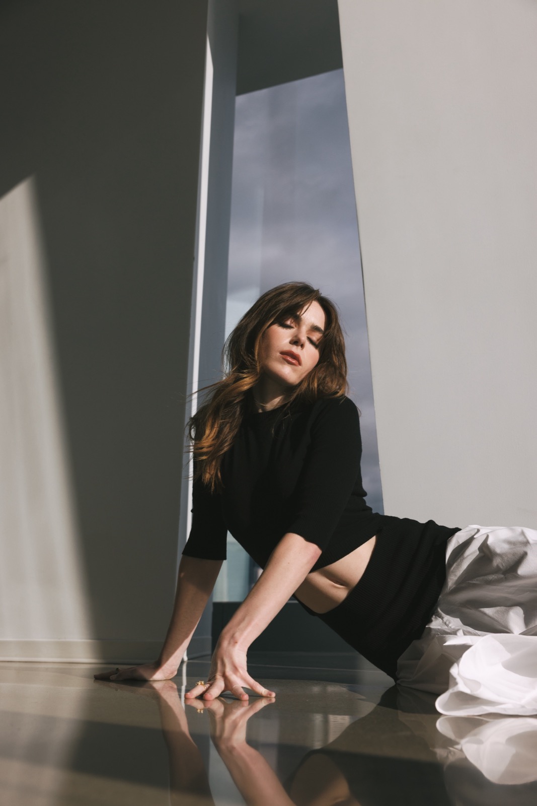 Allongée de biais, Kiernan Shipka joue la détente totale, mais tout est millimétré. Son top noir ouvre une petite fenêtre sur le ventre, comme une note en bas de page très visible. Elle a l’air sage, puis la découpe rappelle qu’elle sait exactement où attirer l’œil. Une seule ouverture, et la photo parle toute seule.