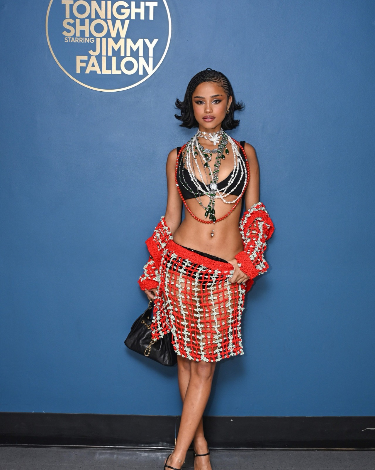 Soutien noir minimal, collier en avalanche et jupe filet rouge qui laisse tout deviner : on hésite entre tenue de scène et matériel de pêche chic. Elle tire dessus l’air de rien, comme si le tissu allait demander une augmentation.