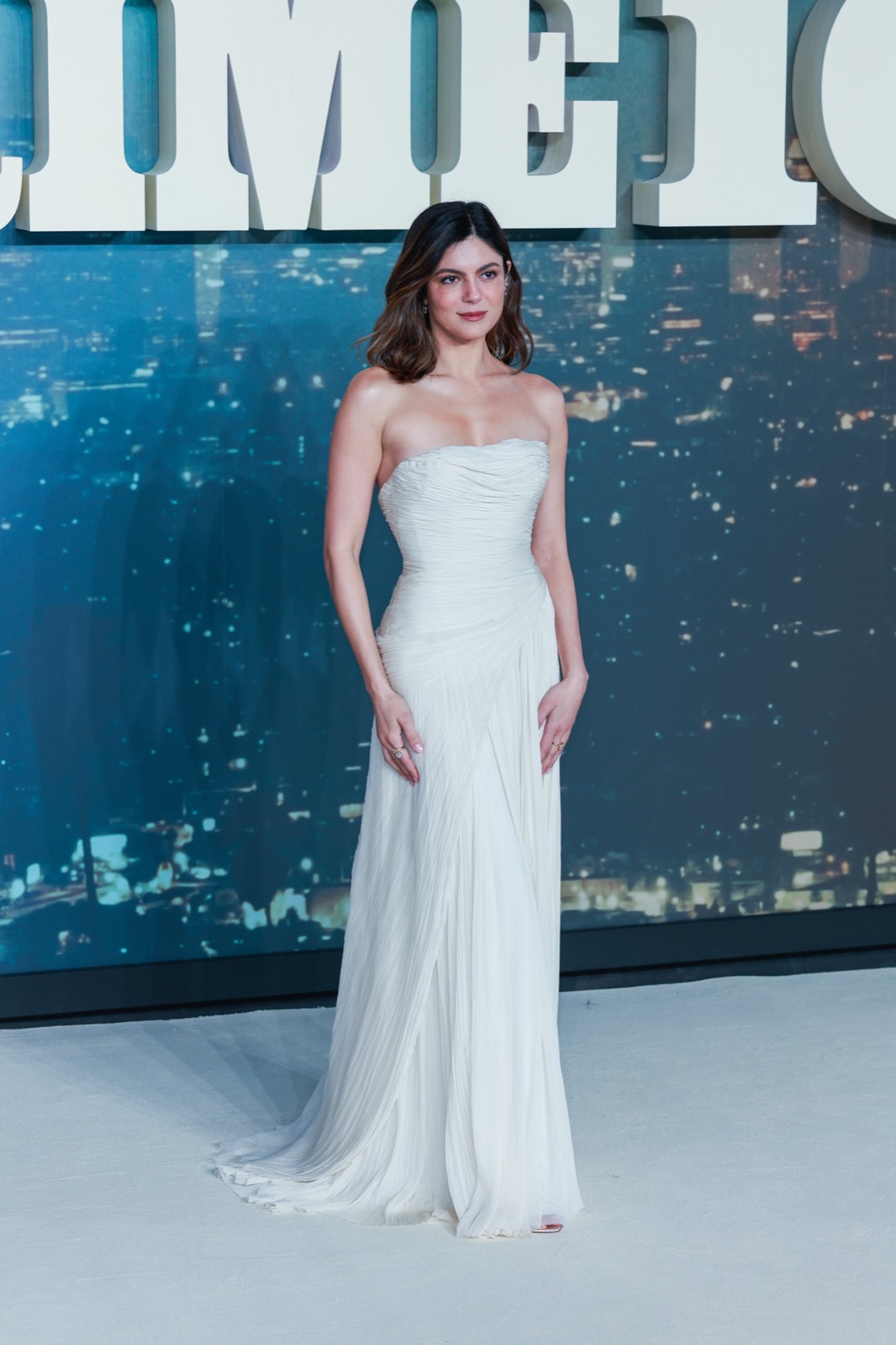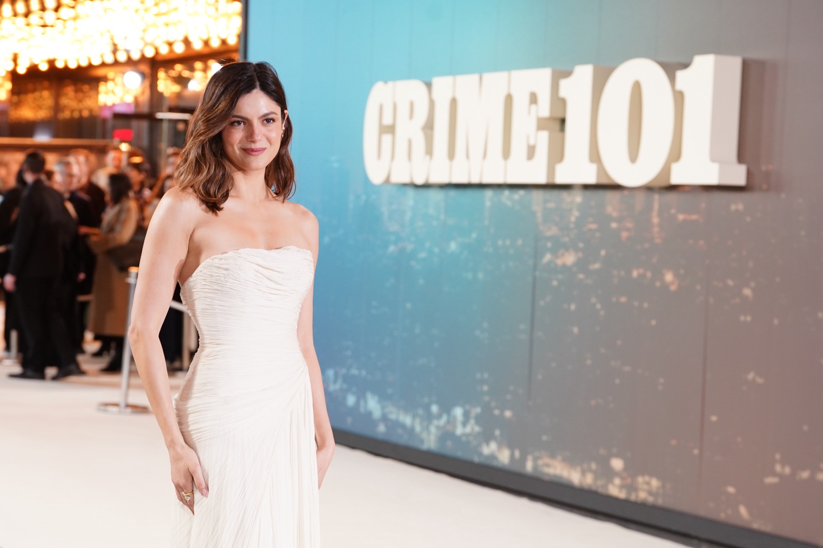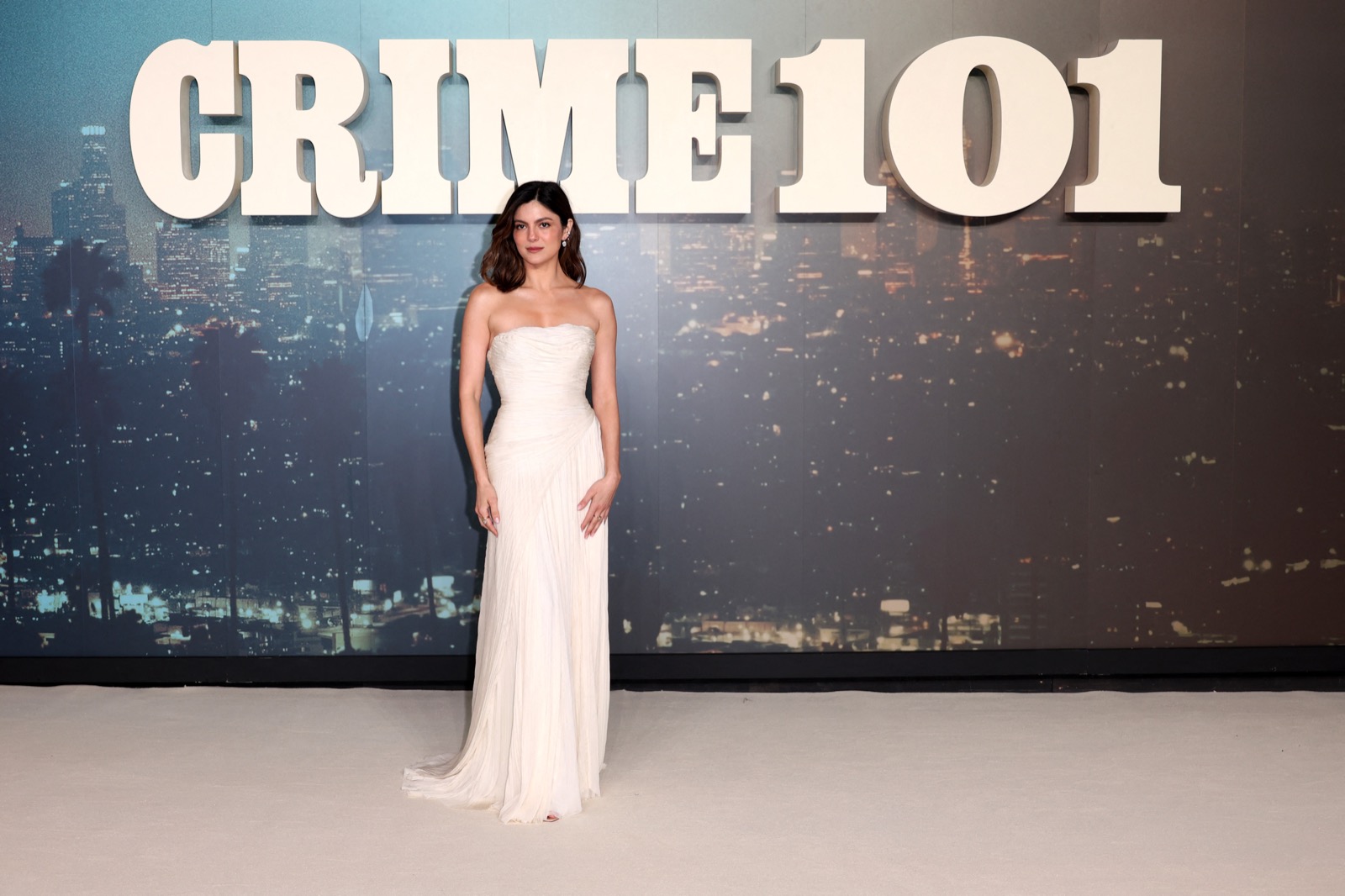 Bustier ivoire moulé, épaules nues et air très sage : à Londres pour la projection européenne de CRIME 101, elle a visiblement décidé que le vrai suspense serait sa robe.