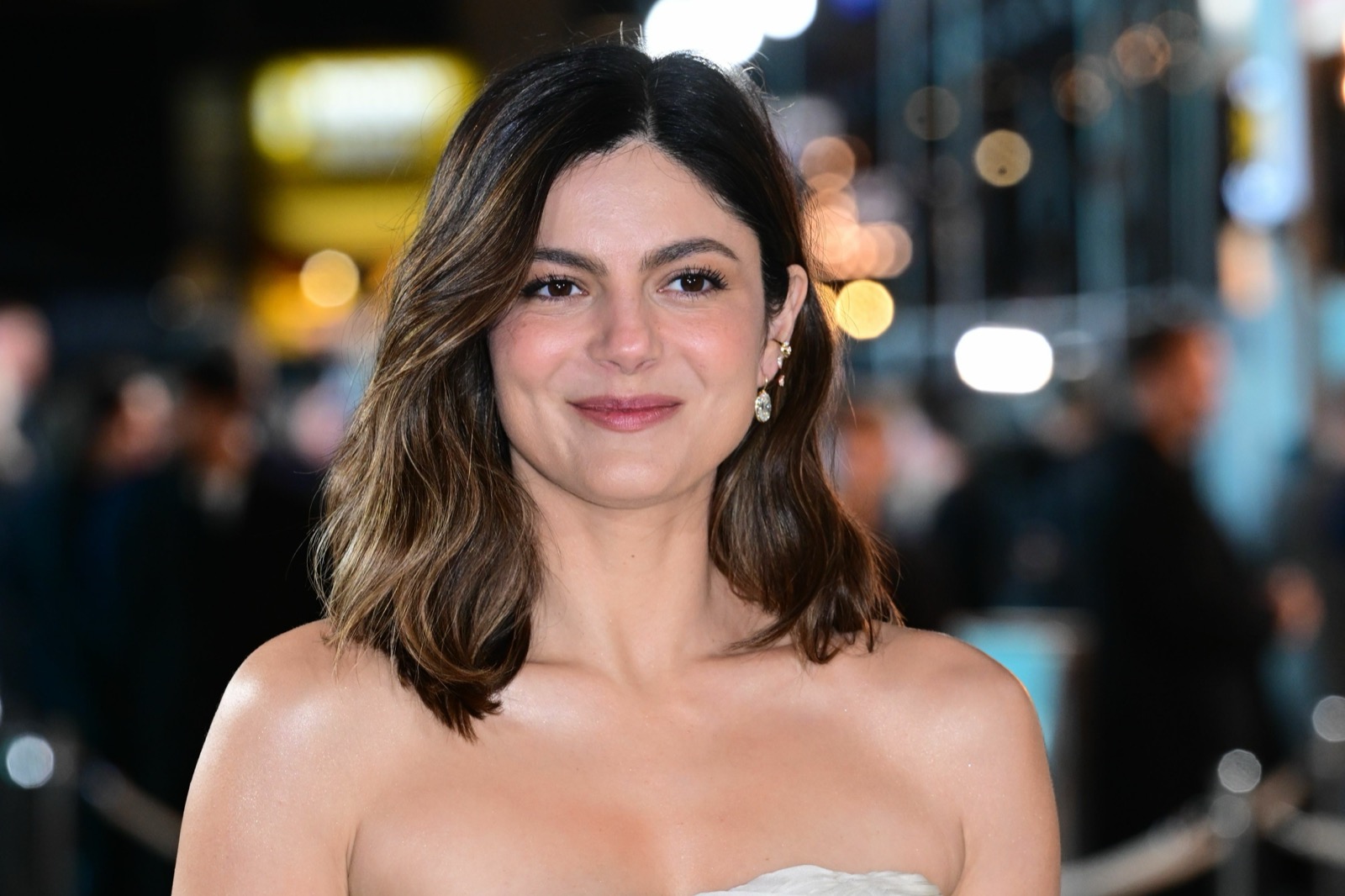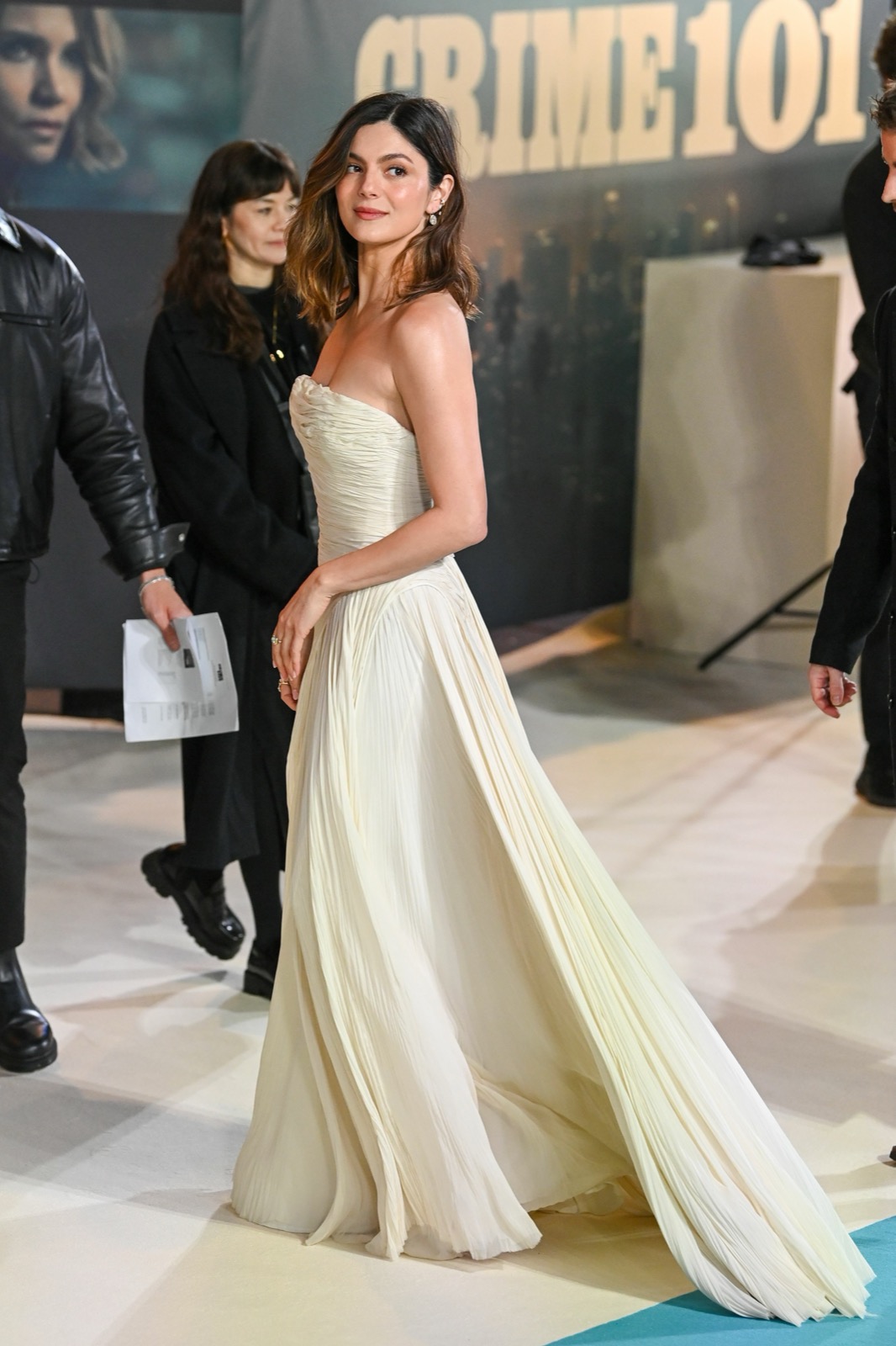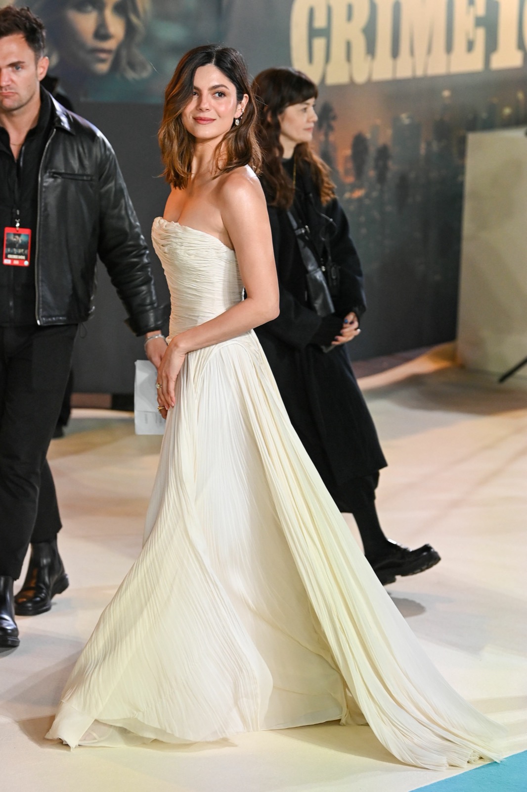 Bustier ivoire moulé, épaules nues et air très sage : à Londres pour la projection européenne de CRIME 101, elle a visiblement décidé que le vrai suspense serait sa robe.