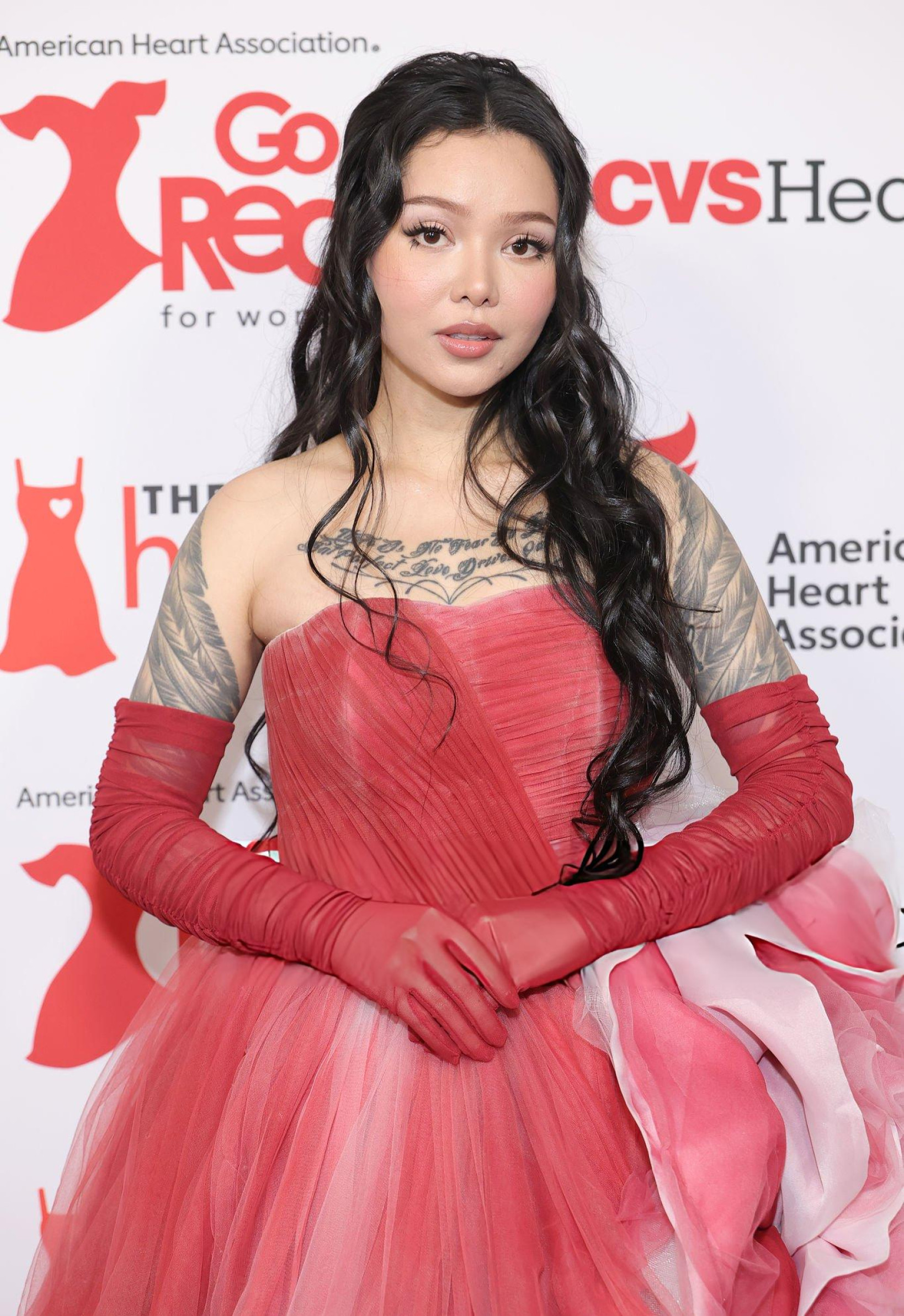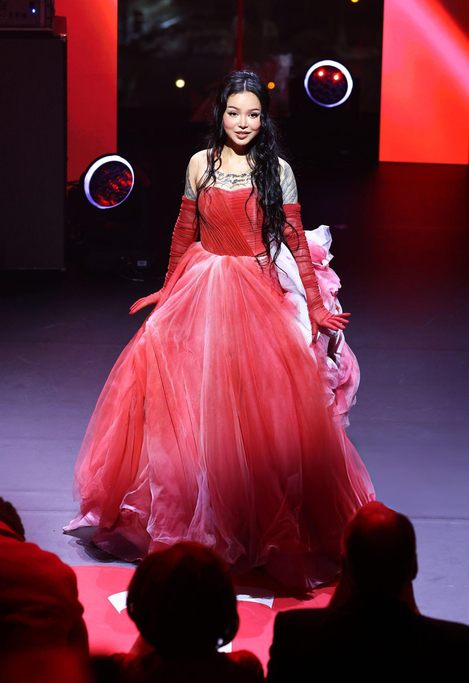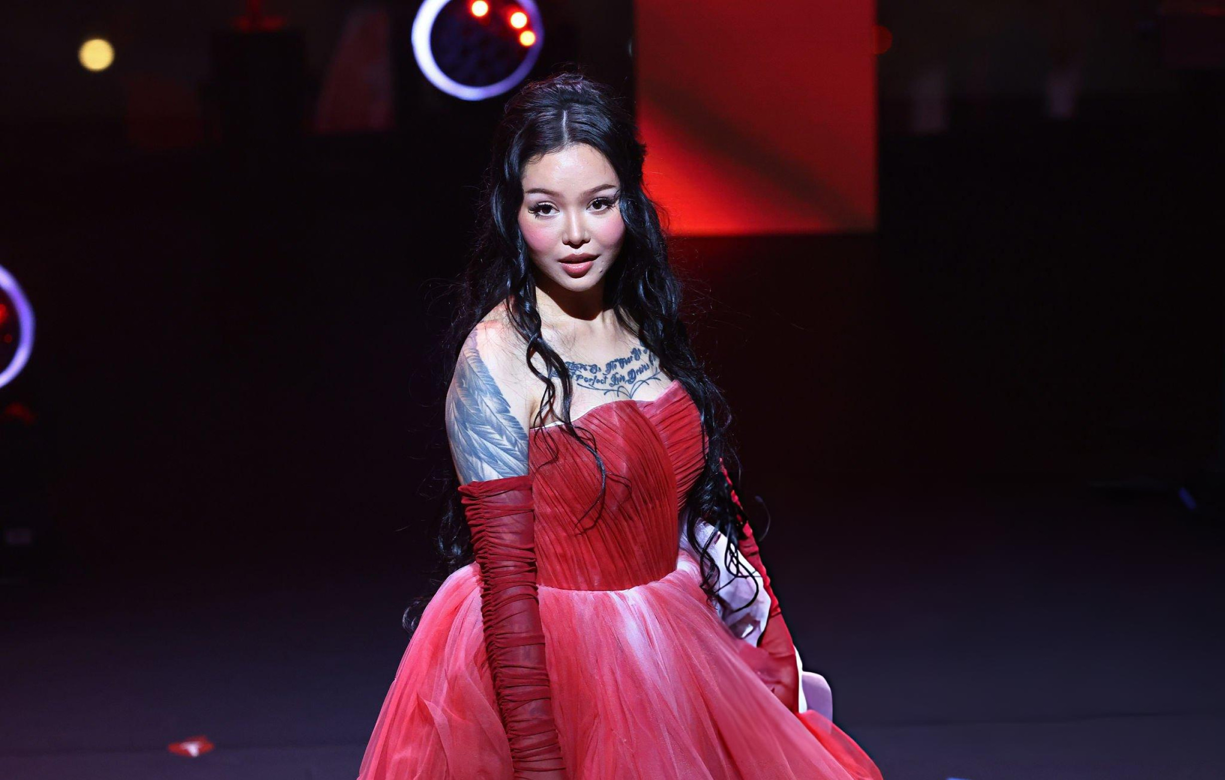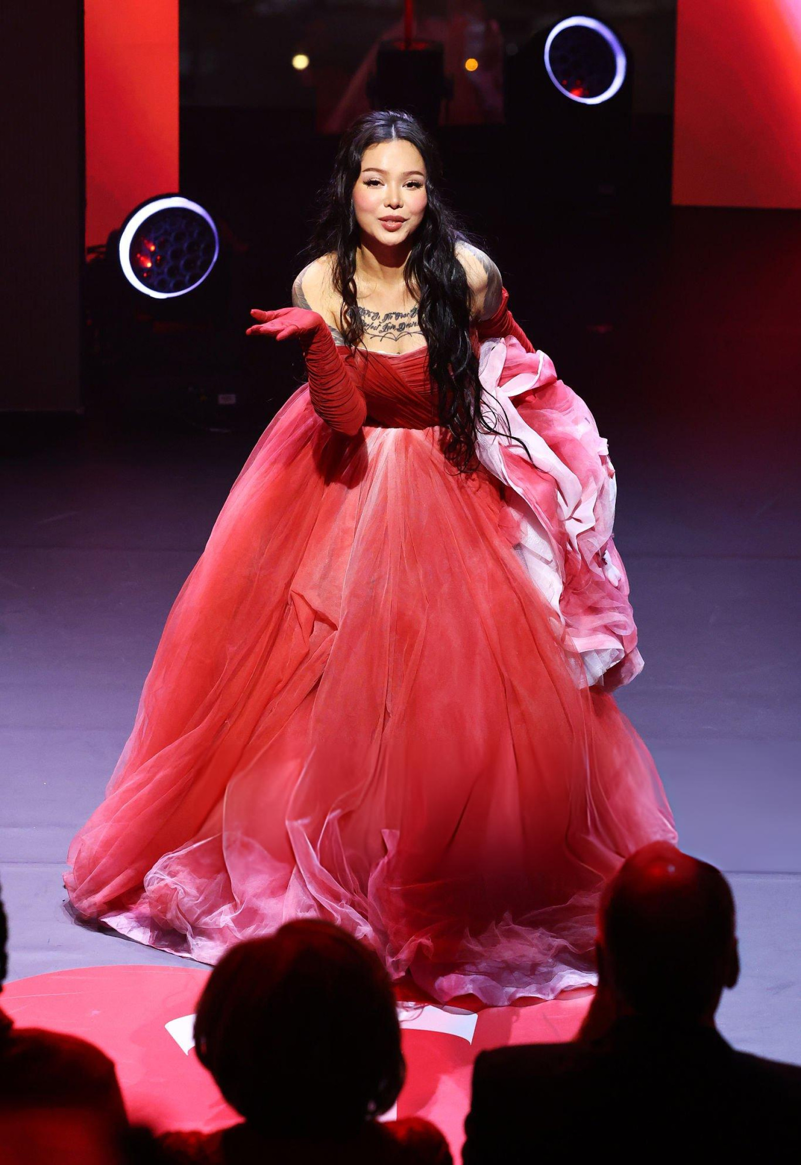 Bella Poarch débarque en robe rouge gonflée, corset serré et jupe XXL qui prend plus de place que le discours. Elle envoie un baiser, l’air sage, mais la silhouette occupe toute la scène. Même le rouge du tapis semble timide.