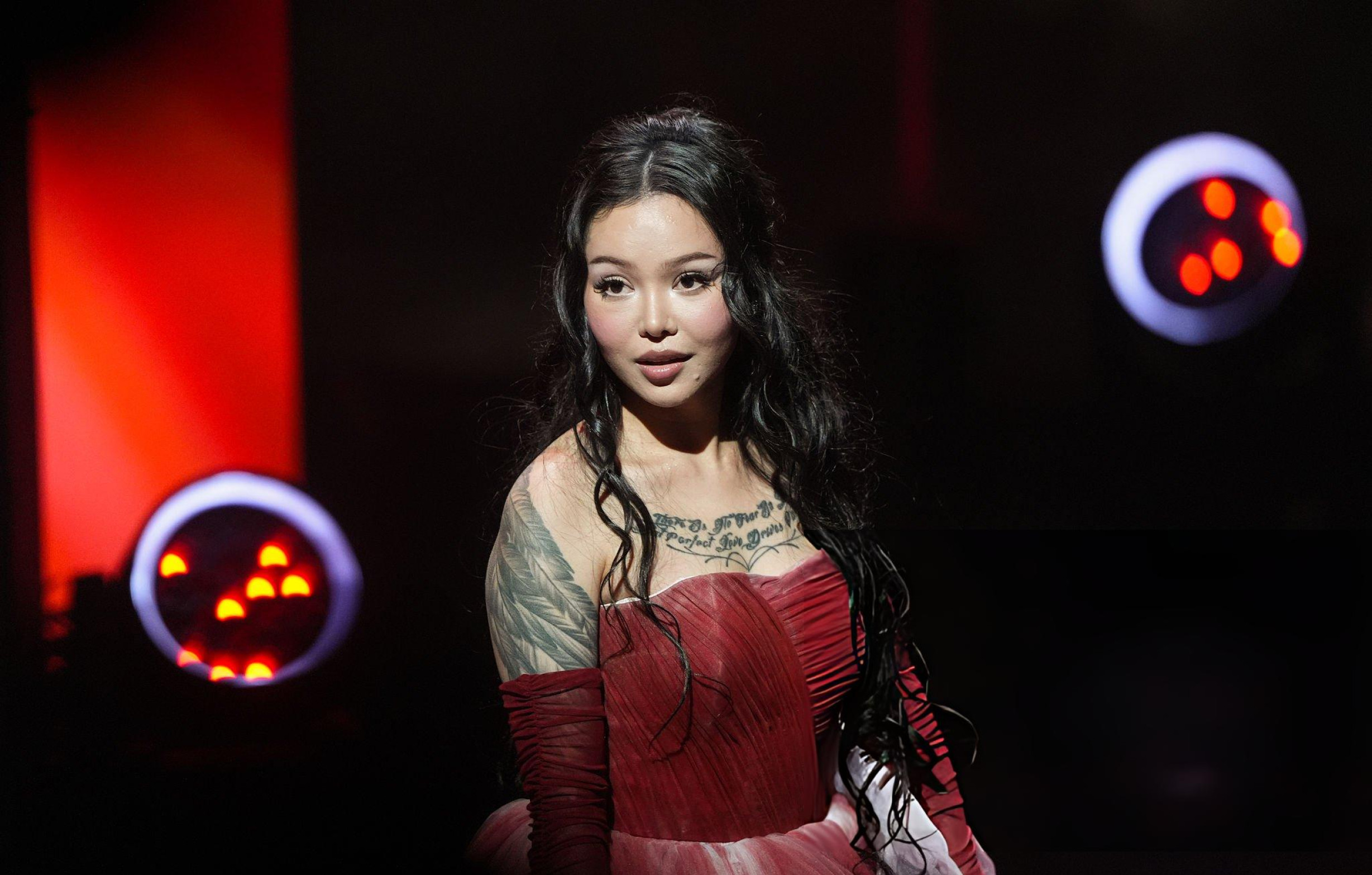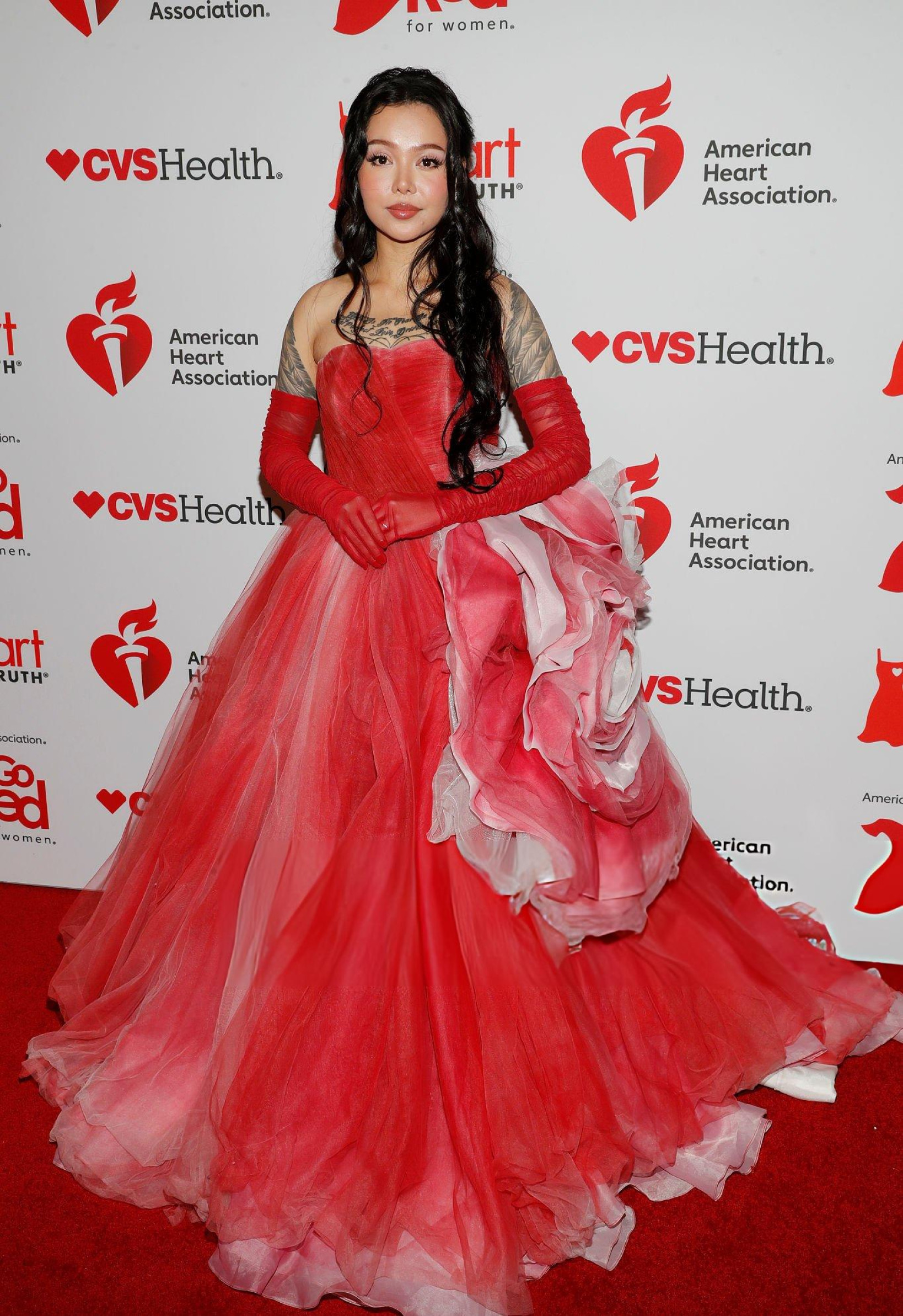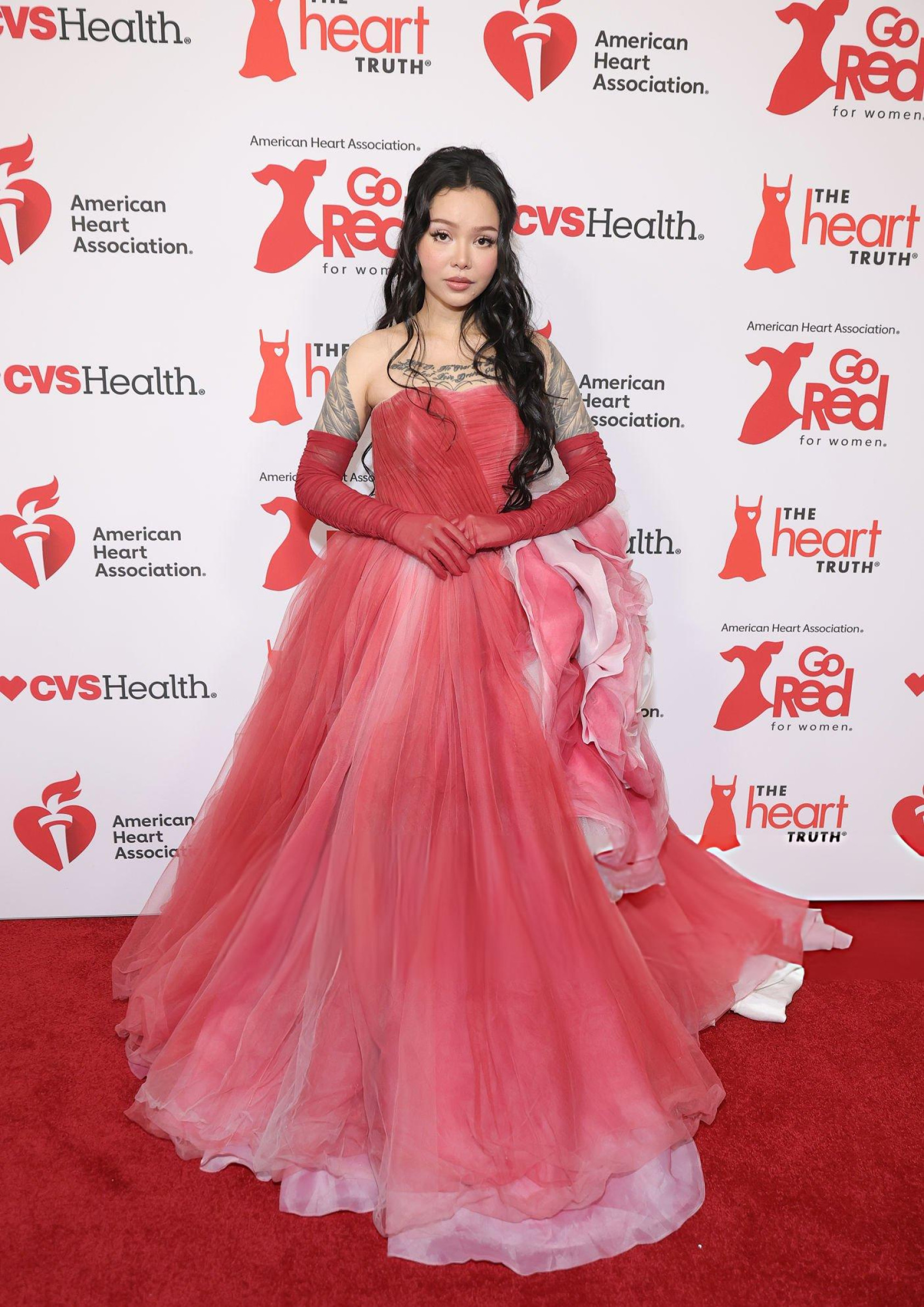 Bella Poarch débarque en robe rouge gonflée, corset serré et jupe XXL qui prend plus de place que le discours. Elle envoie un baiser, l’air sage, mais la silhouette occupe toute la scène. Même le rouge du tapis semble timide.