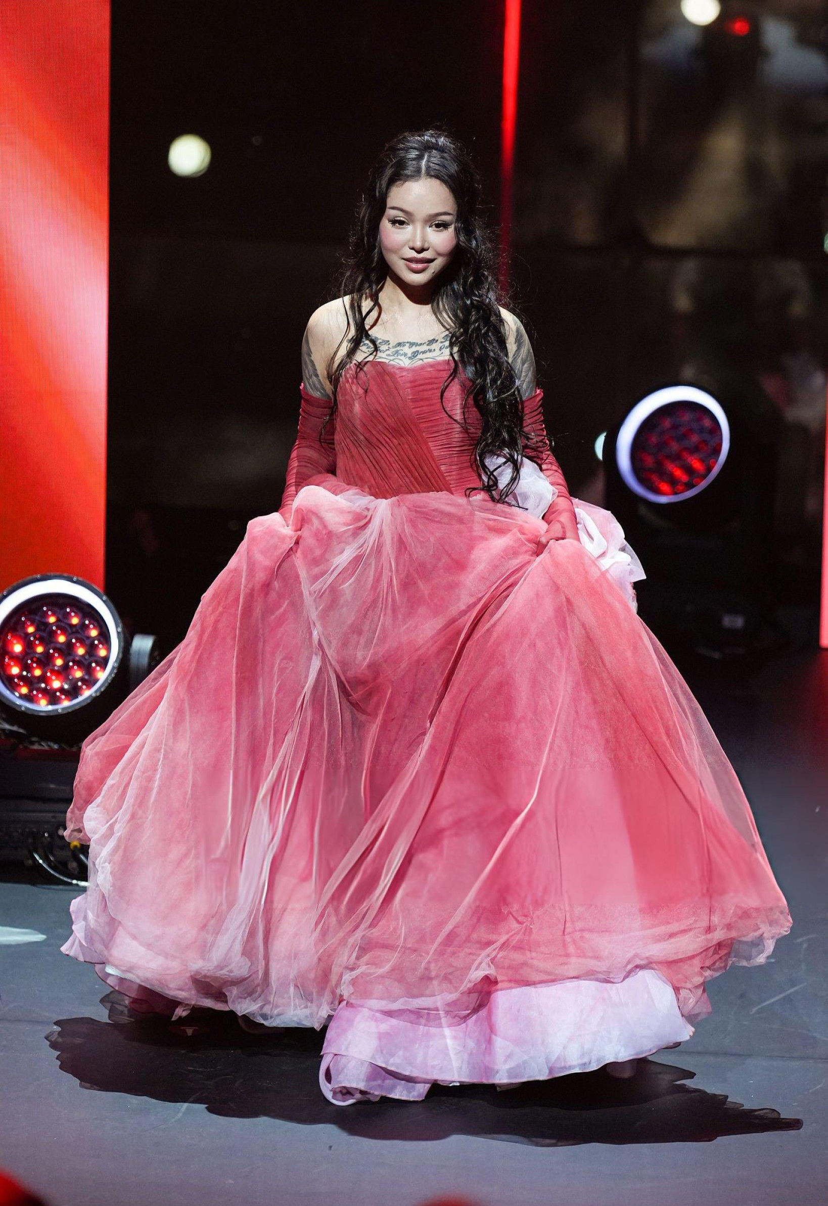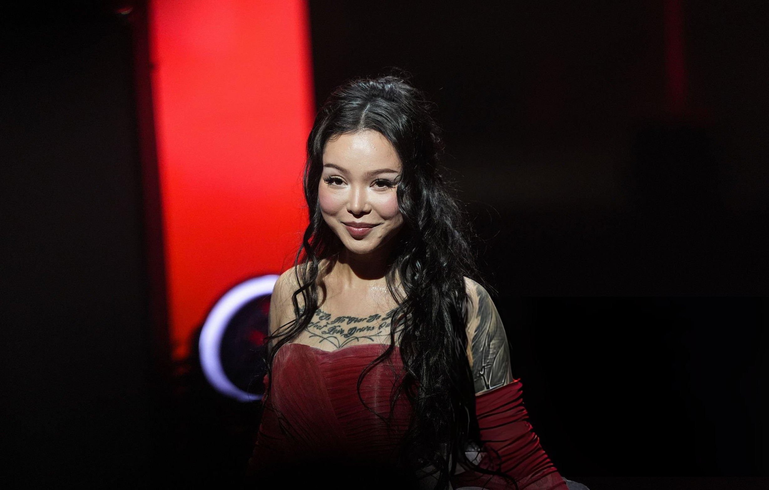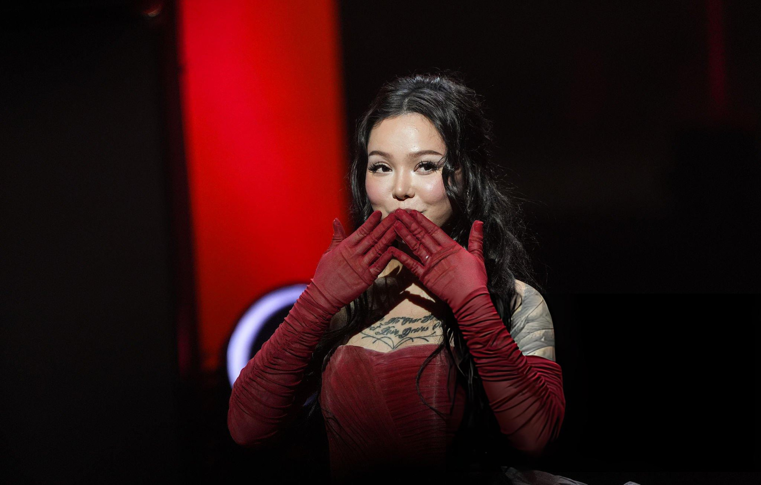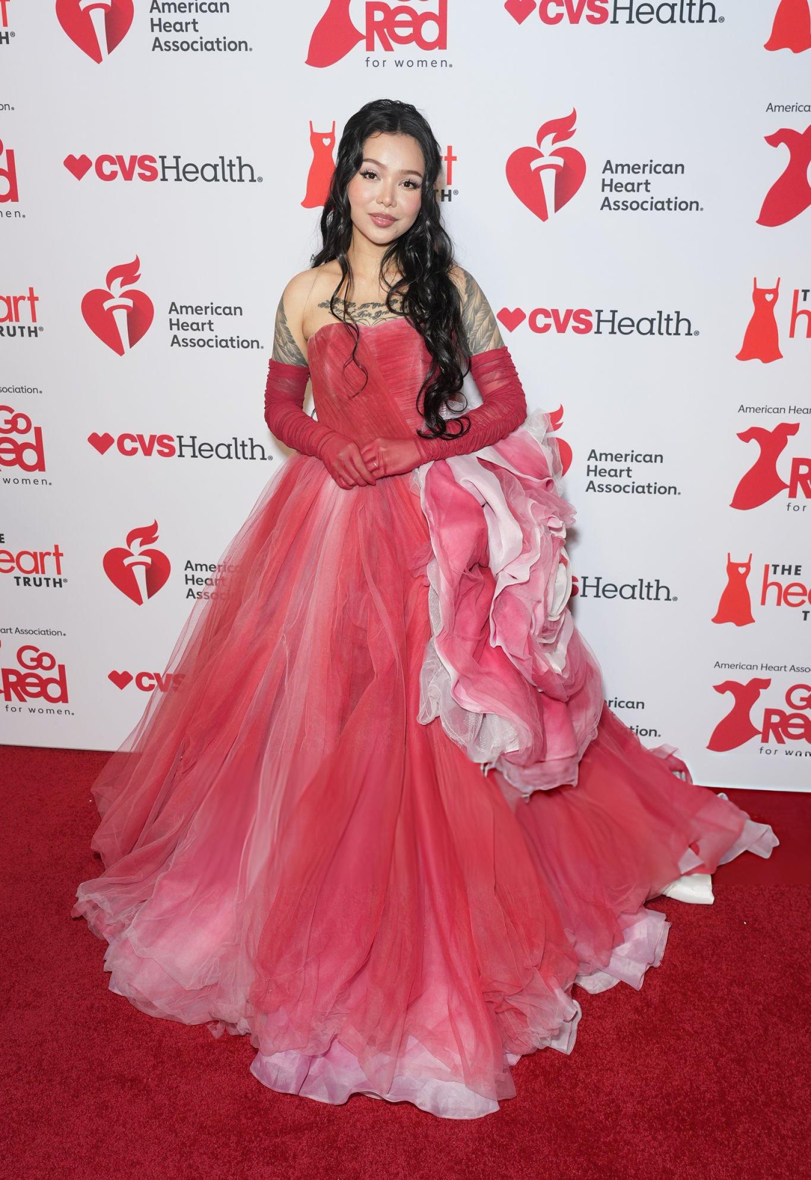 Bella Poarch débarque en robe rouge gonflée, corset serré et jupe XXL qui prend plus de place que le discours. Elle envoie un baiser, l’air sage, mais la silhouette occupe toute la scène. Même le rouge du tapis semble timide.