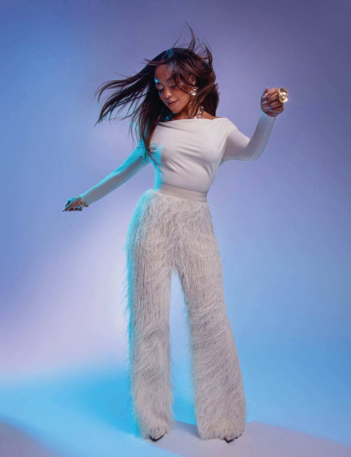 Allongée en sequins ou sculptée en sirène blanche, elle pose si intensément que même la lumière demande une autorisation écrite.