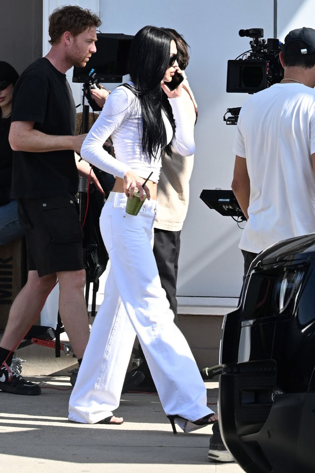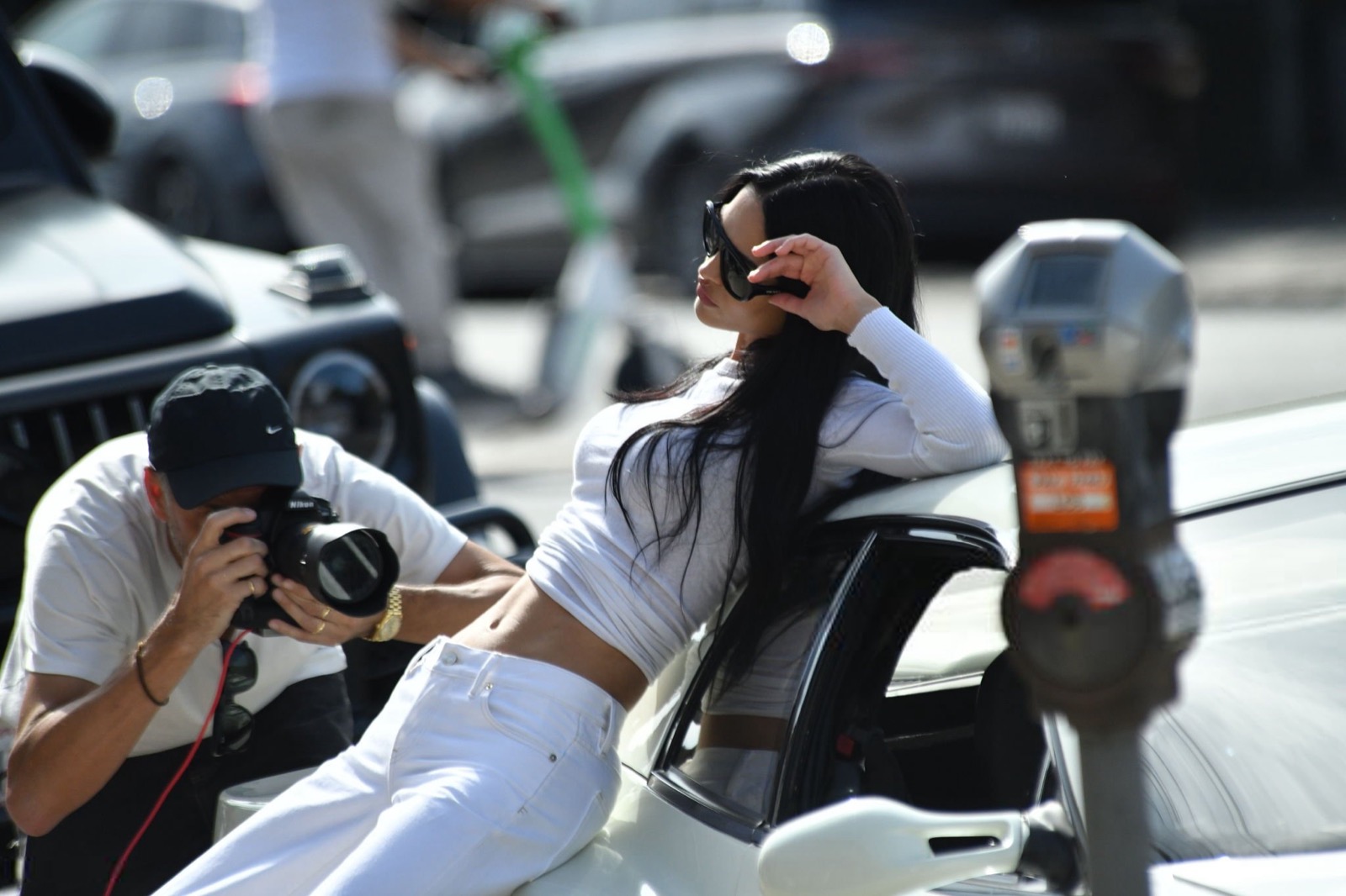 Repérée à West Hollywood pour un shooting street-style. La mannequin téléphone, coordonne l’équipe. Clin d’œil: fille de reality-TV, devenue visage fashion qui fait travailler les trottoirs.