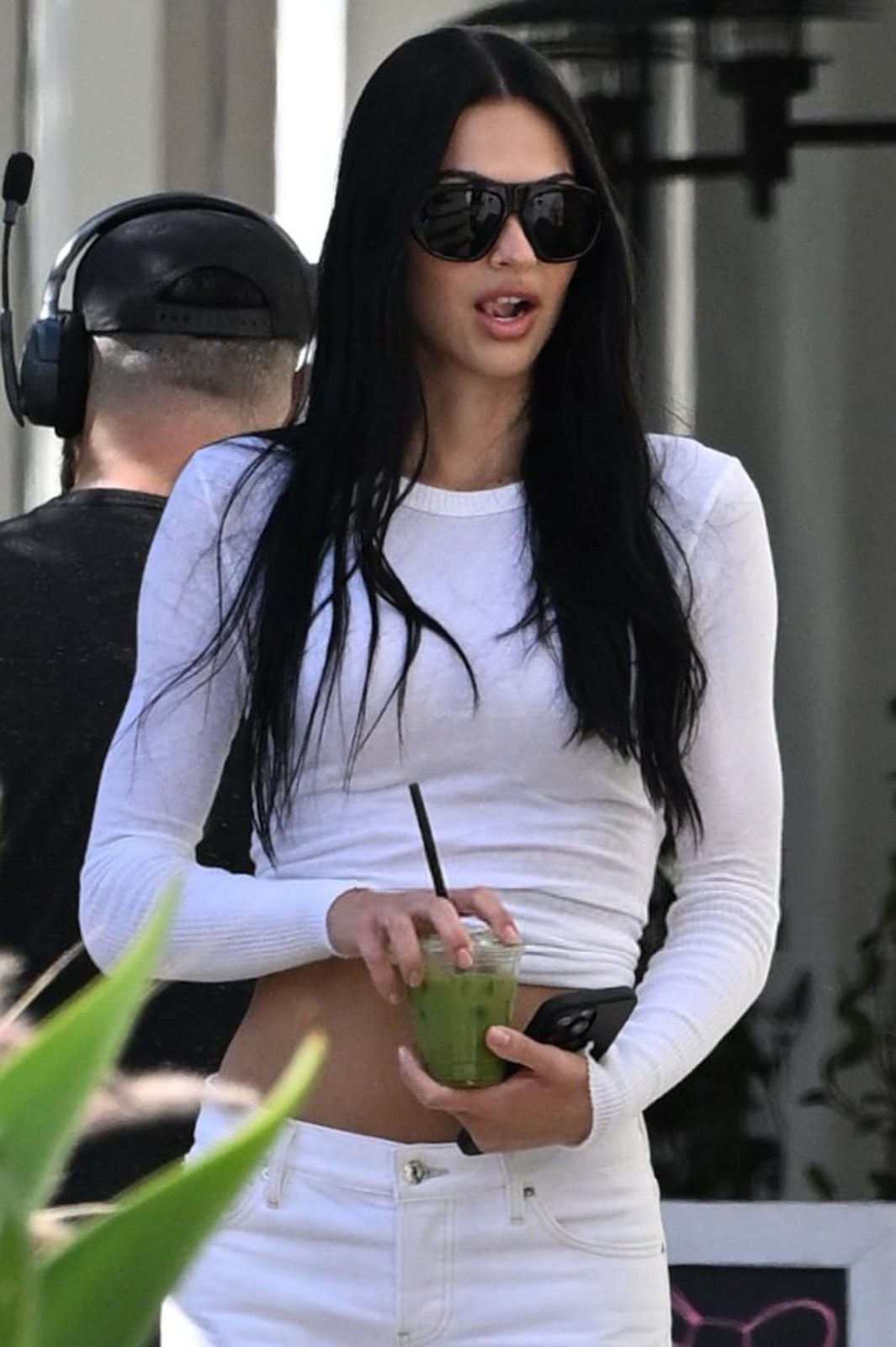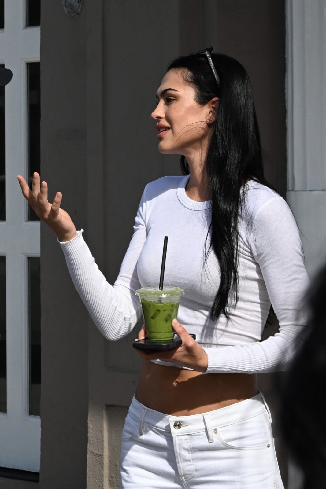 Total look blanc moulant, crop-top discipliné, pantalon taille basse rebelle. Elle se penche: la gravité demande un rendez-vous. Les lunettes restent stoïques, la rue perd sa productivité.