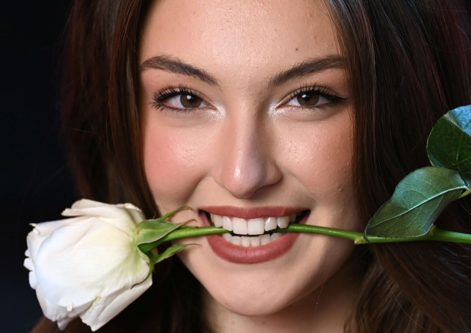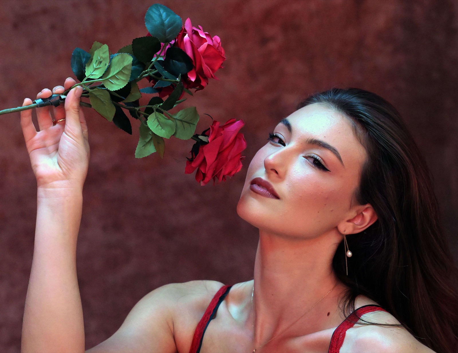 Dans sa robe rouge pleine de cœurs et bottes hautes, Rachel Pizzolato envahit le studio de pétales. Pour le shoot Saint-Valentin, les techniciens deviennent soudain très romantiques.