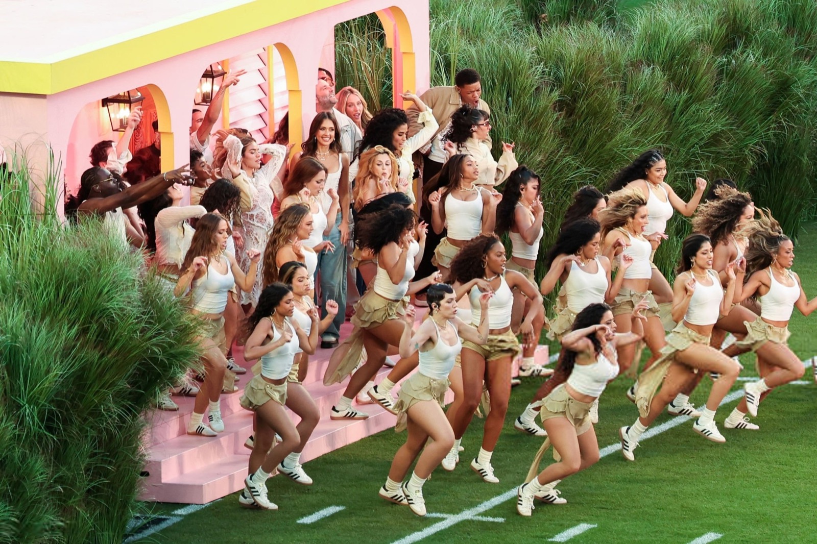 Pendant le Super Bowl, invitée dans la perf de Bad Bunny, l’actrice transforme le décor pastel en cours pratique : choré validée, public distrait, football momentanément hors service.