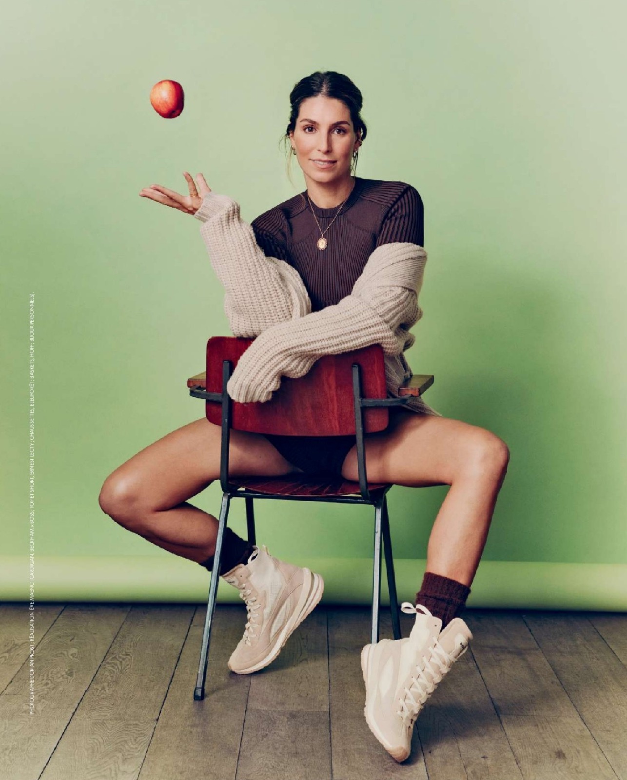 Dernière pose sur une chaise : tenue sport, jambes pliées, baskets roses. Elle balance la tête en riant… et quelqu’un souffle : « OK, même le citron veut son agent. »