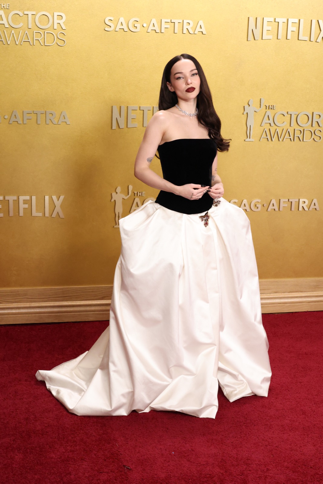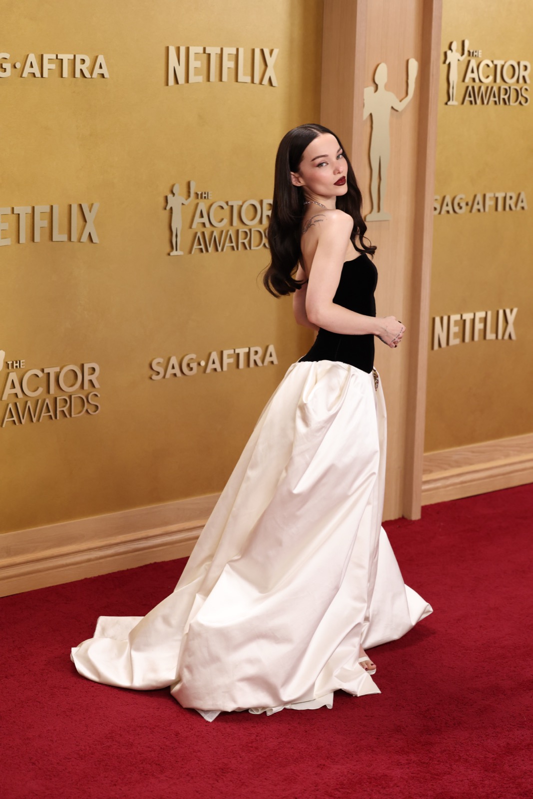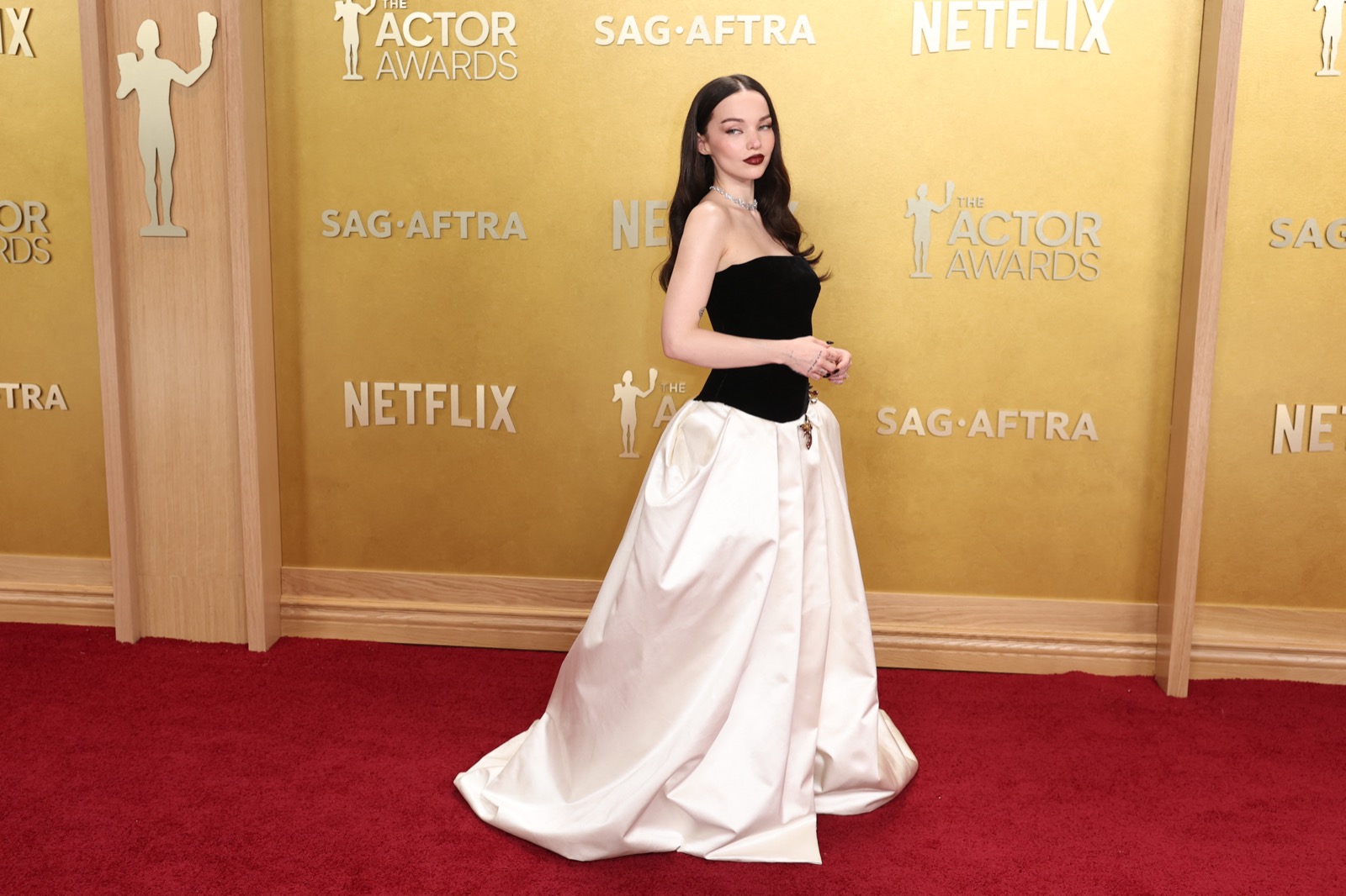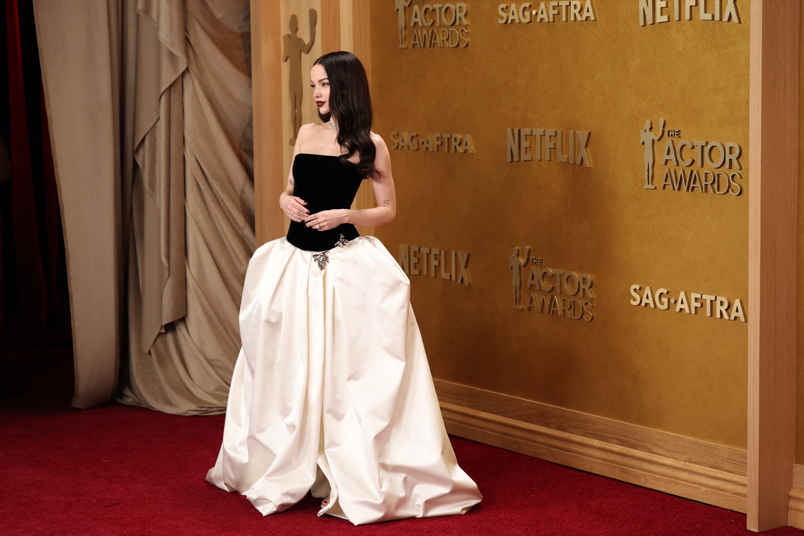 Arrivée aux SAG Awards, Dove Cameron glisse sur le tapis rouge dans une robe noir et ivoire digne d’un conte chic version Hollywood.