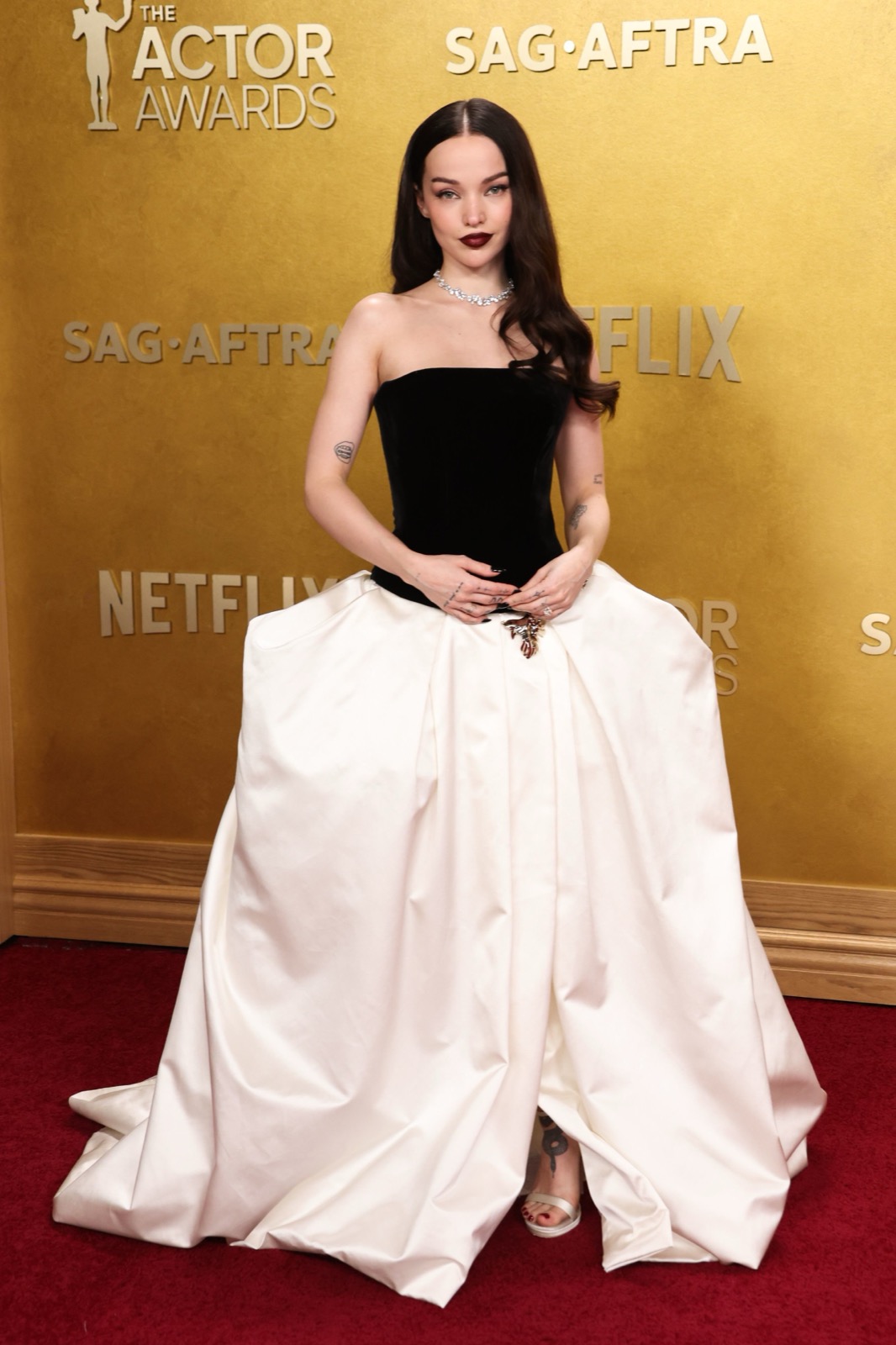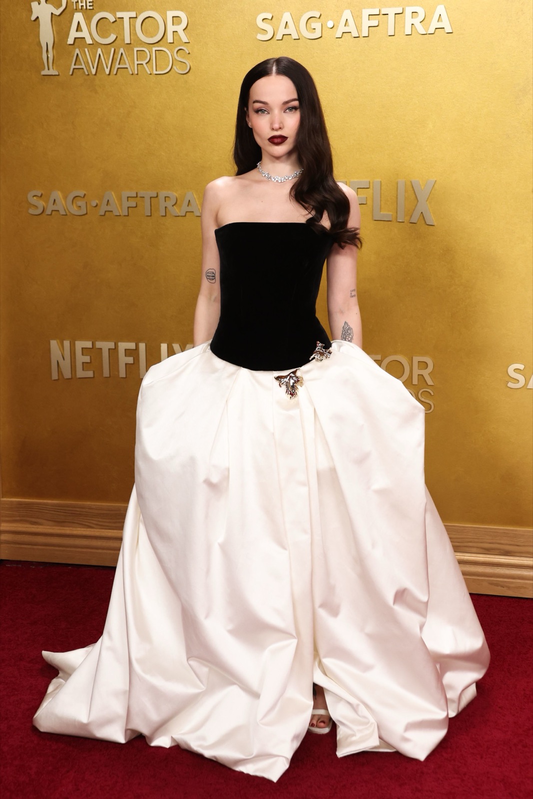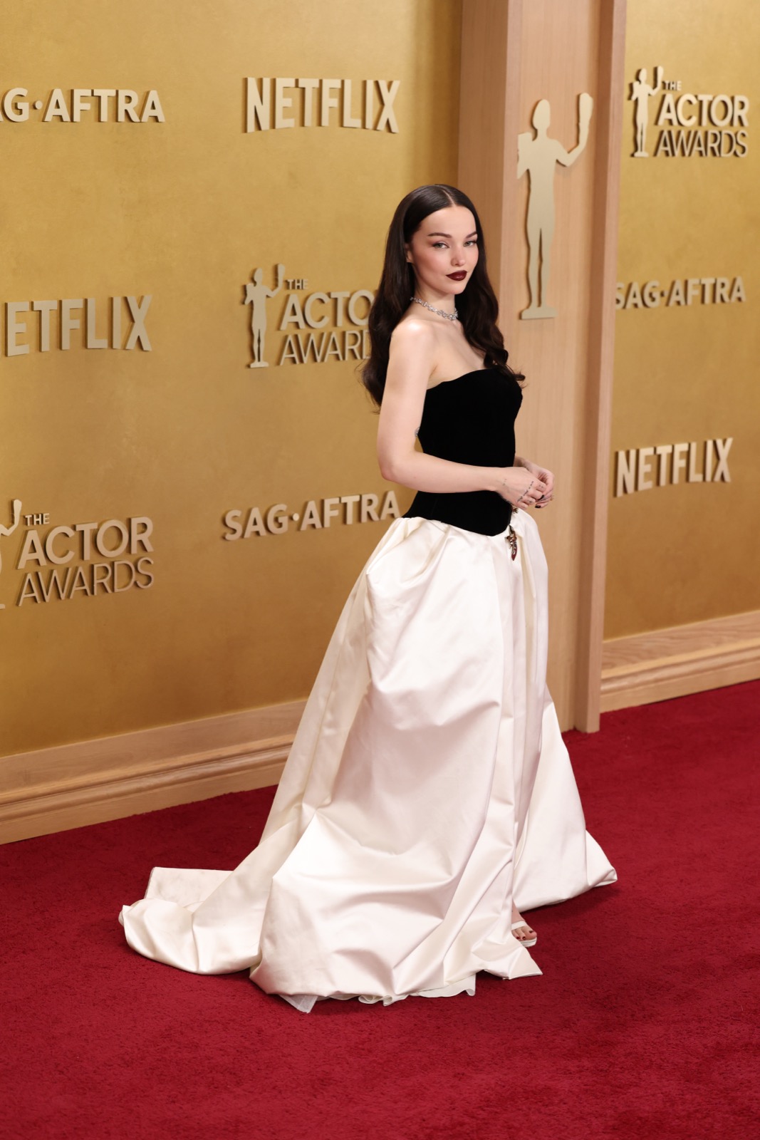 Arrivée aux SAG Awards, Dove Cameron glisse sur le tapis rouge dans une robe noir et ivoire digne d’un conte chic version Hollywood.