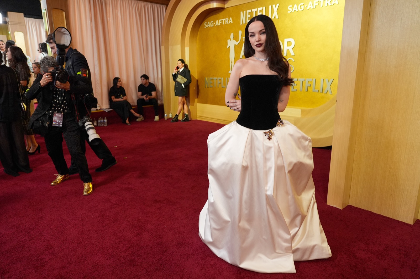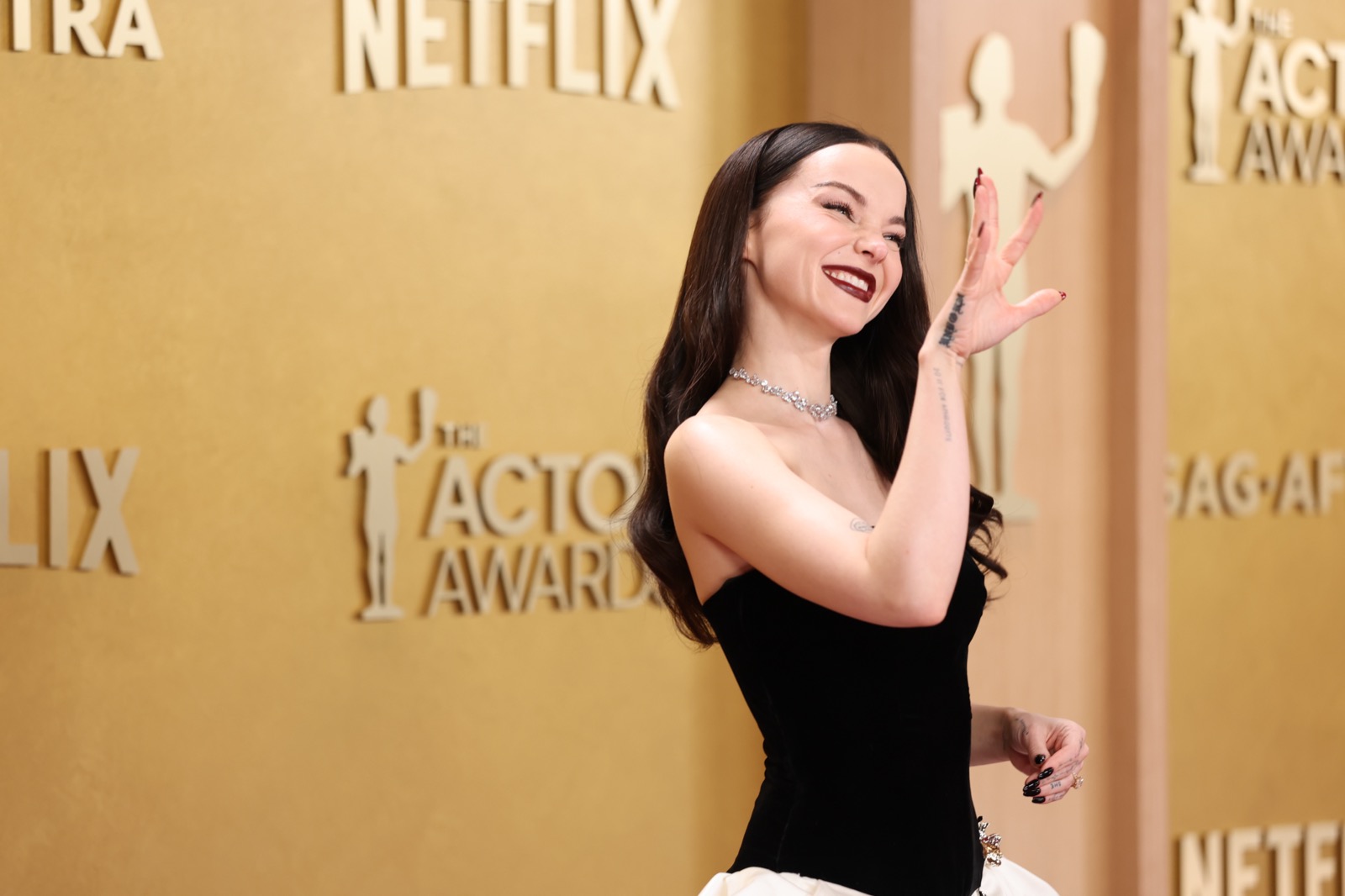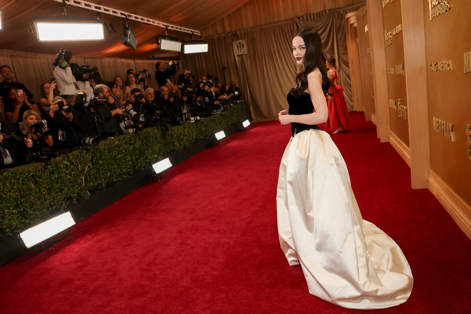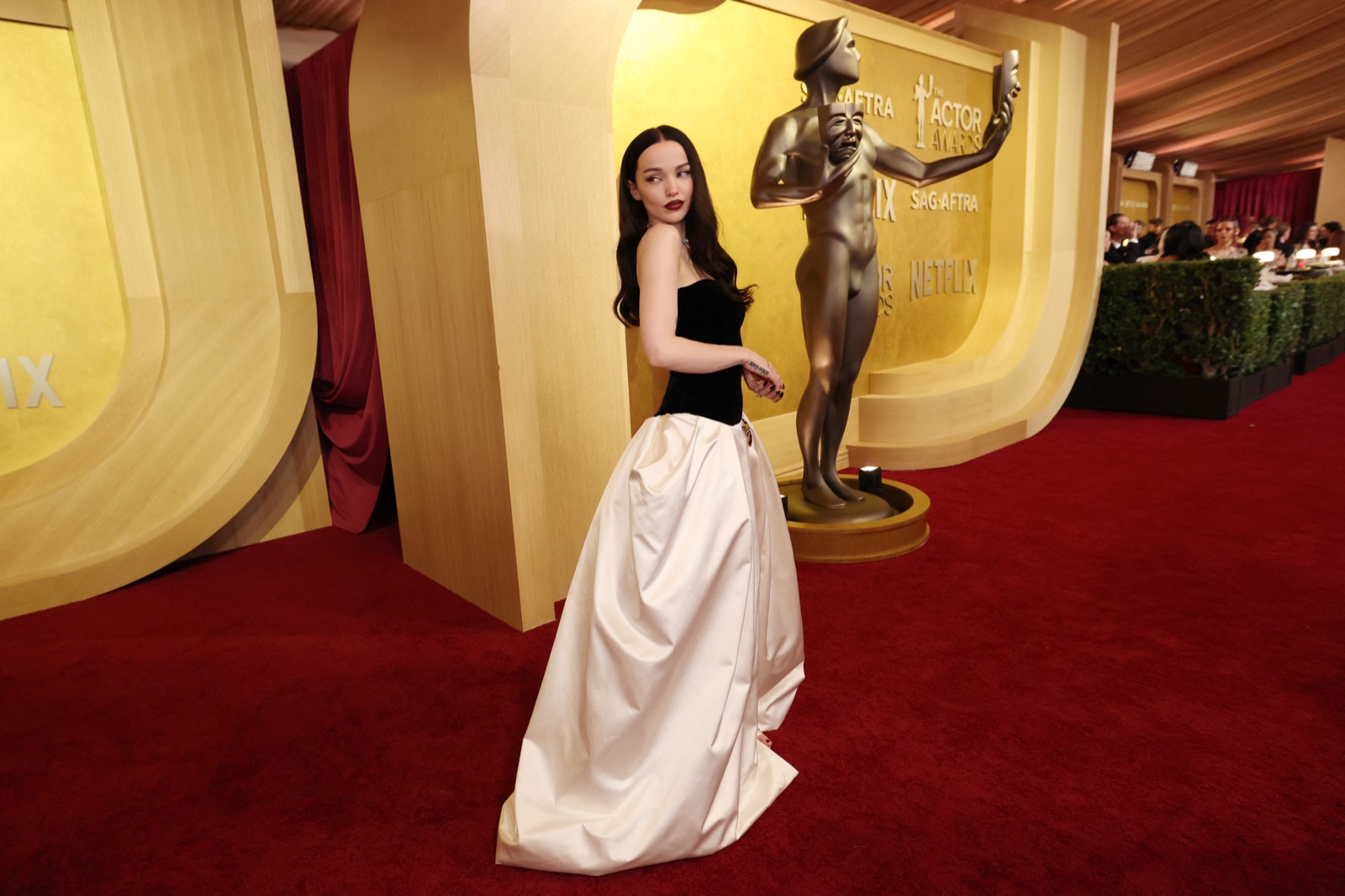 Arrivée aux SAG Awards, Dove Cameron glisse sur le tapis rouge dans une robe noir et ivoire digne d’un conte chic version Hollywood.