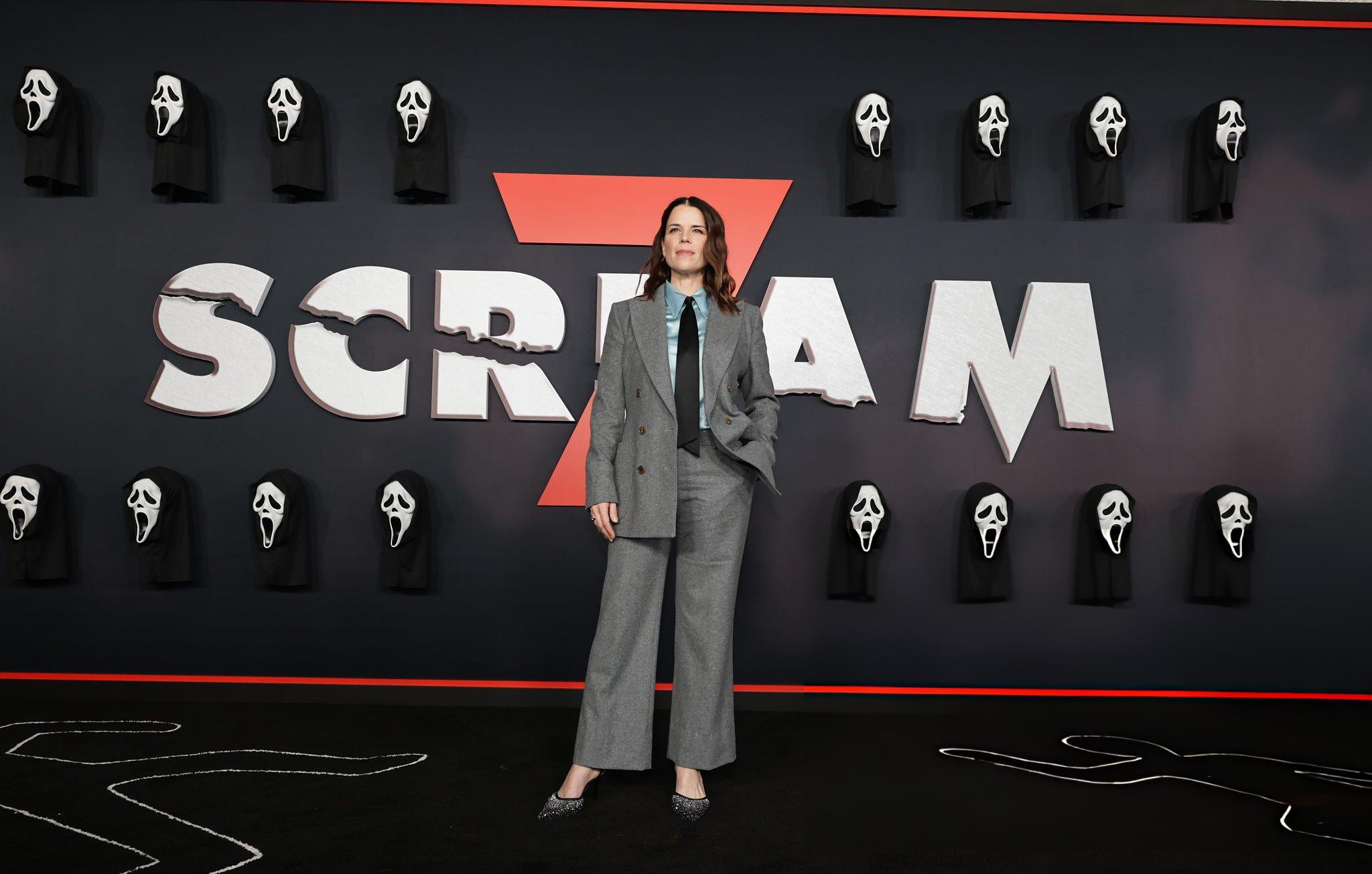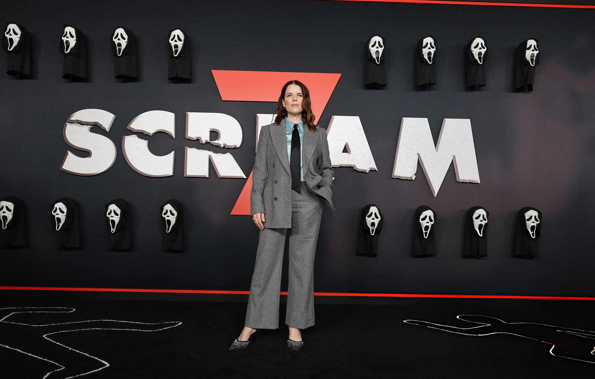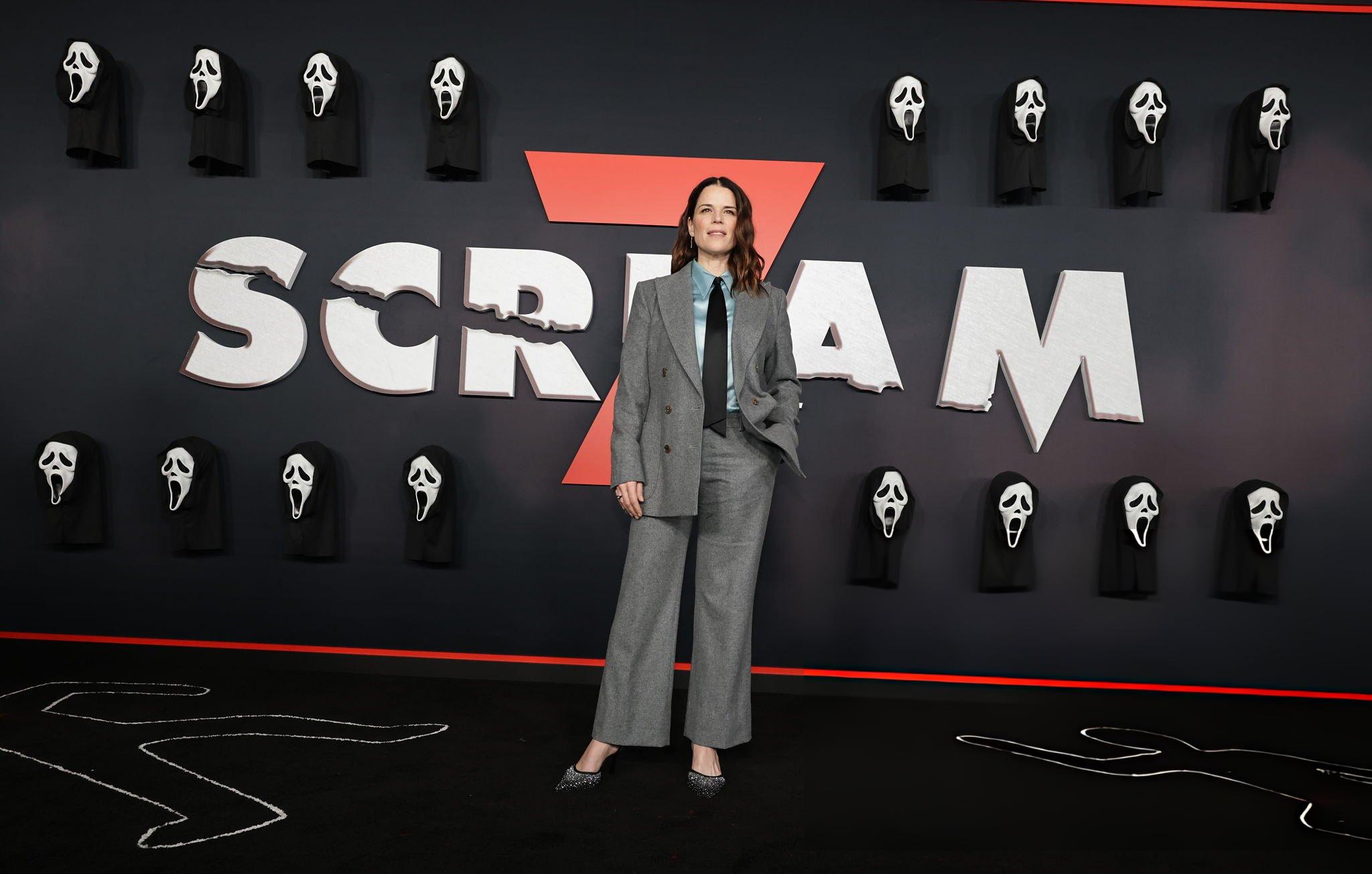 Devant l’avant-première de Scream 7 à Hollywood, Neve Campbell arrive en tailleur gris ultra net, chemise bleu clair et cravate fine. Oui, Sidney Prescott version patronne. Les fans applaudissent, les masques de Ghostface derrière elle semblent soudain beaucoup moins courageux.
