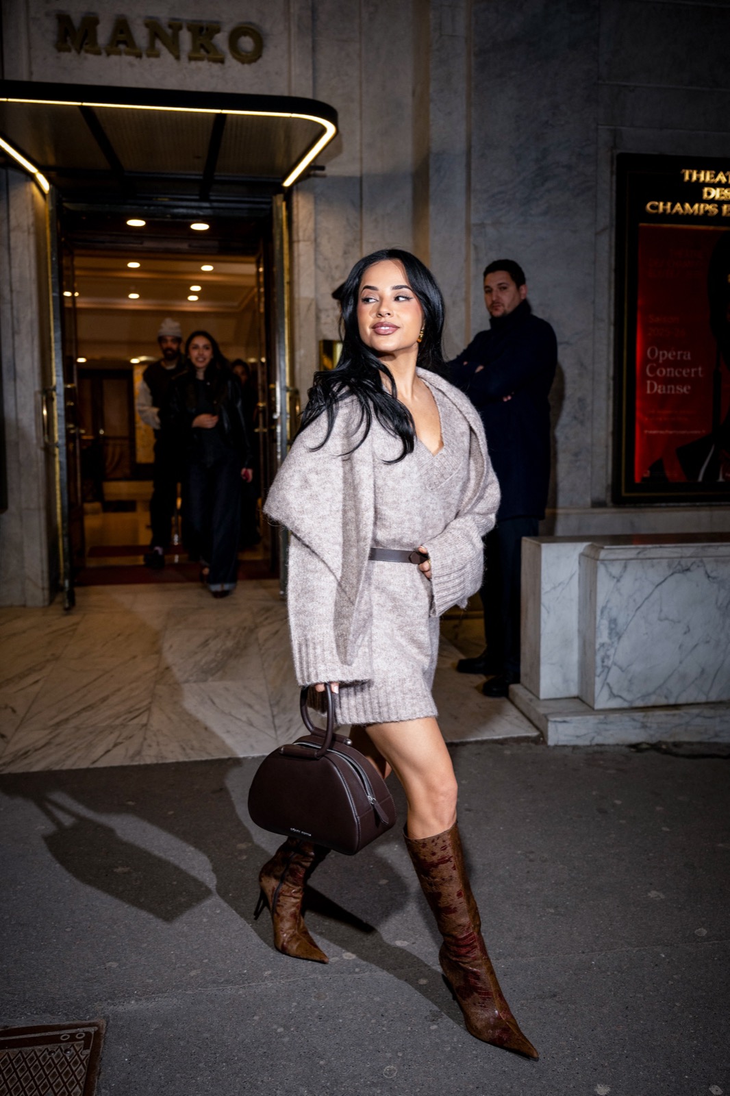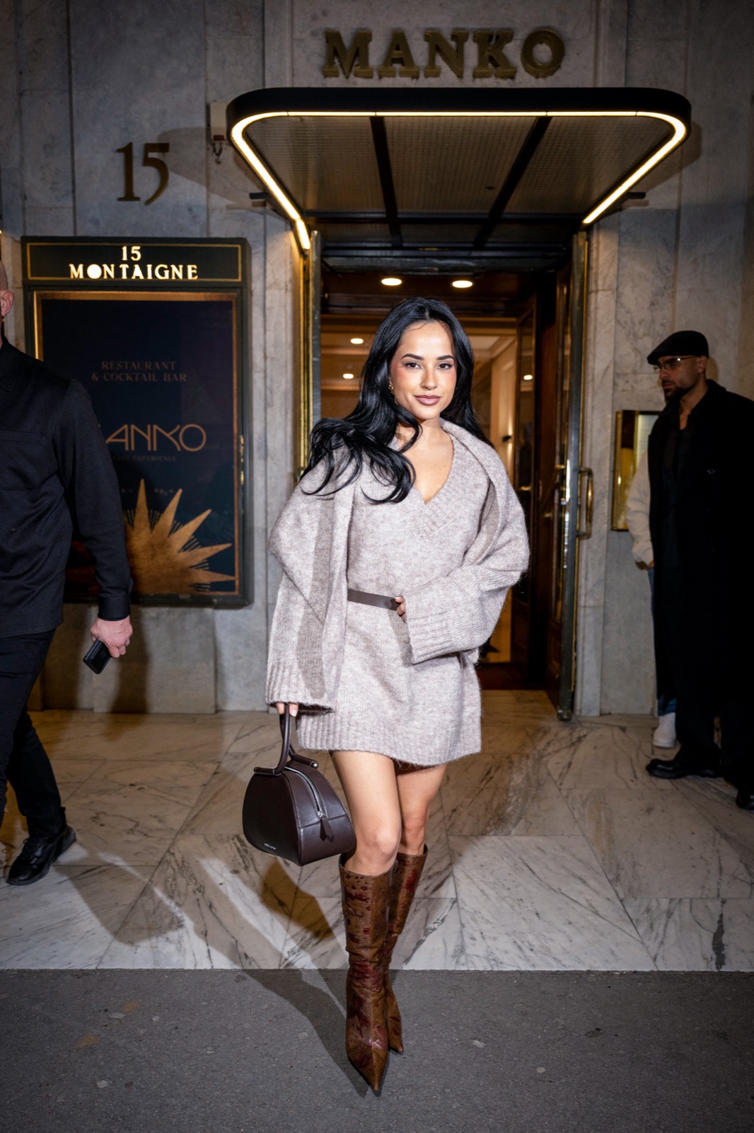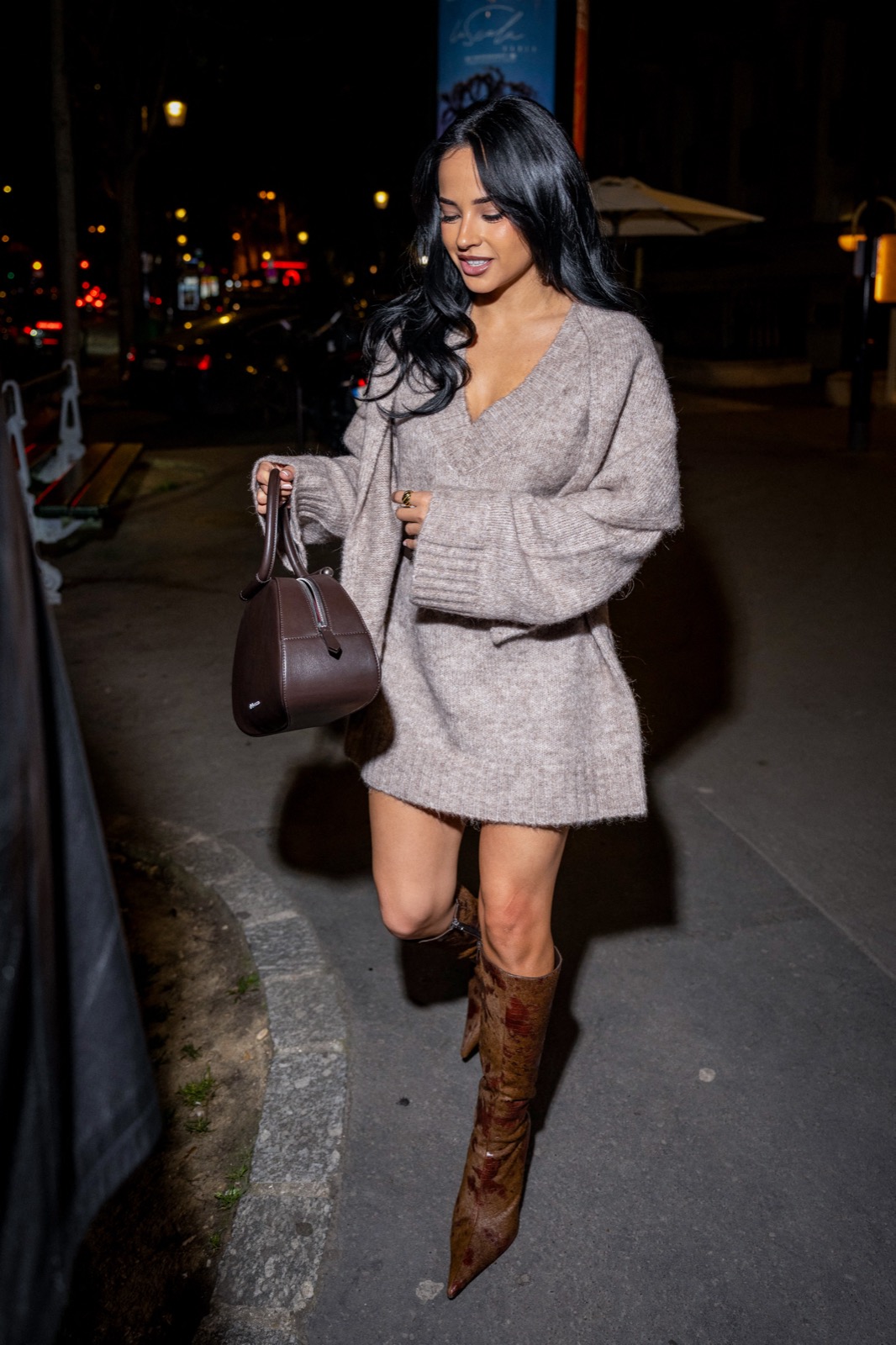 Devant le restaurant Manko à Paris, Becky G sort tranquillement dans un pull oversize couleur crème et des bottes hautes ultra affûtées. La rue semble soudain se transformer en mini podium nocturne.
