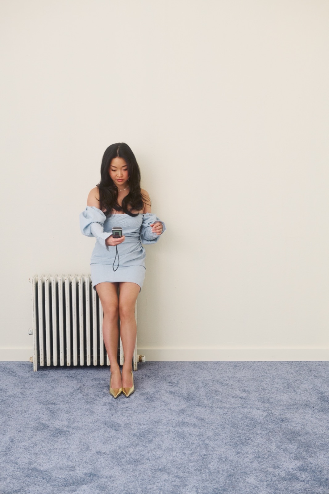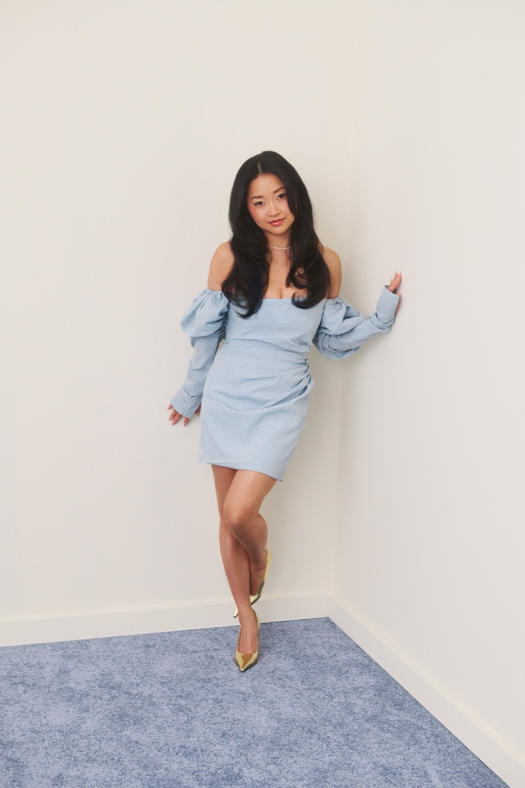 Dans une séance photo pour le magazine PopSugar, Lana Condor débarque en mini-robe bleu ciel, épaules dénudées et talons dorés. Le décor minimaliste devient soudain beaucoup plus intéressant.