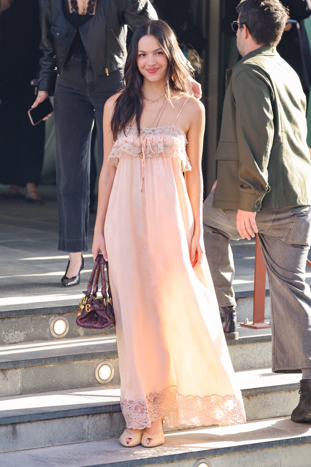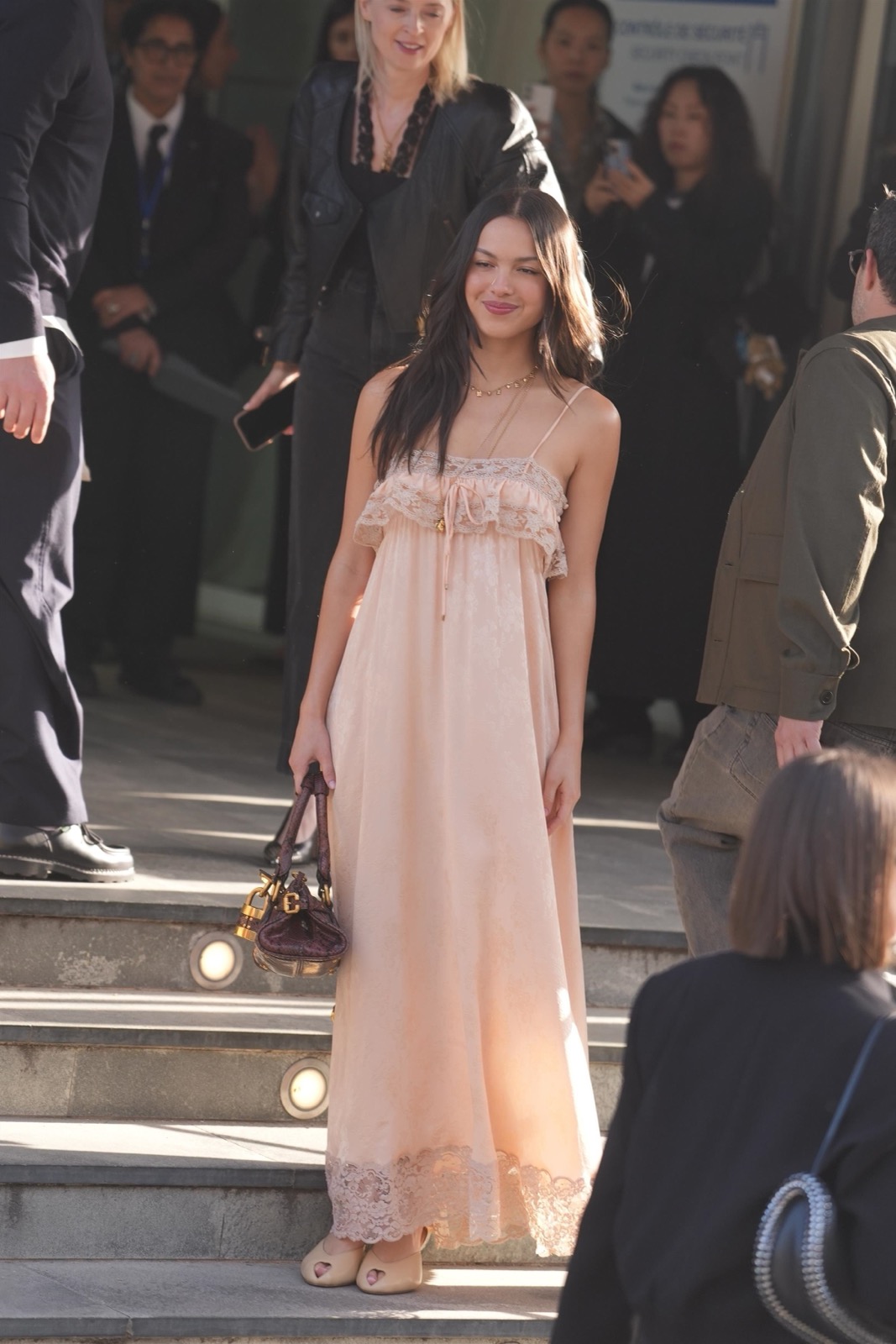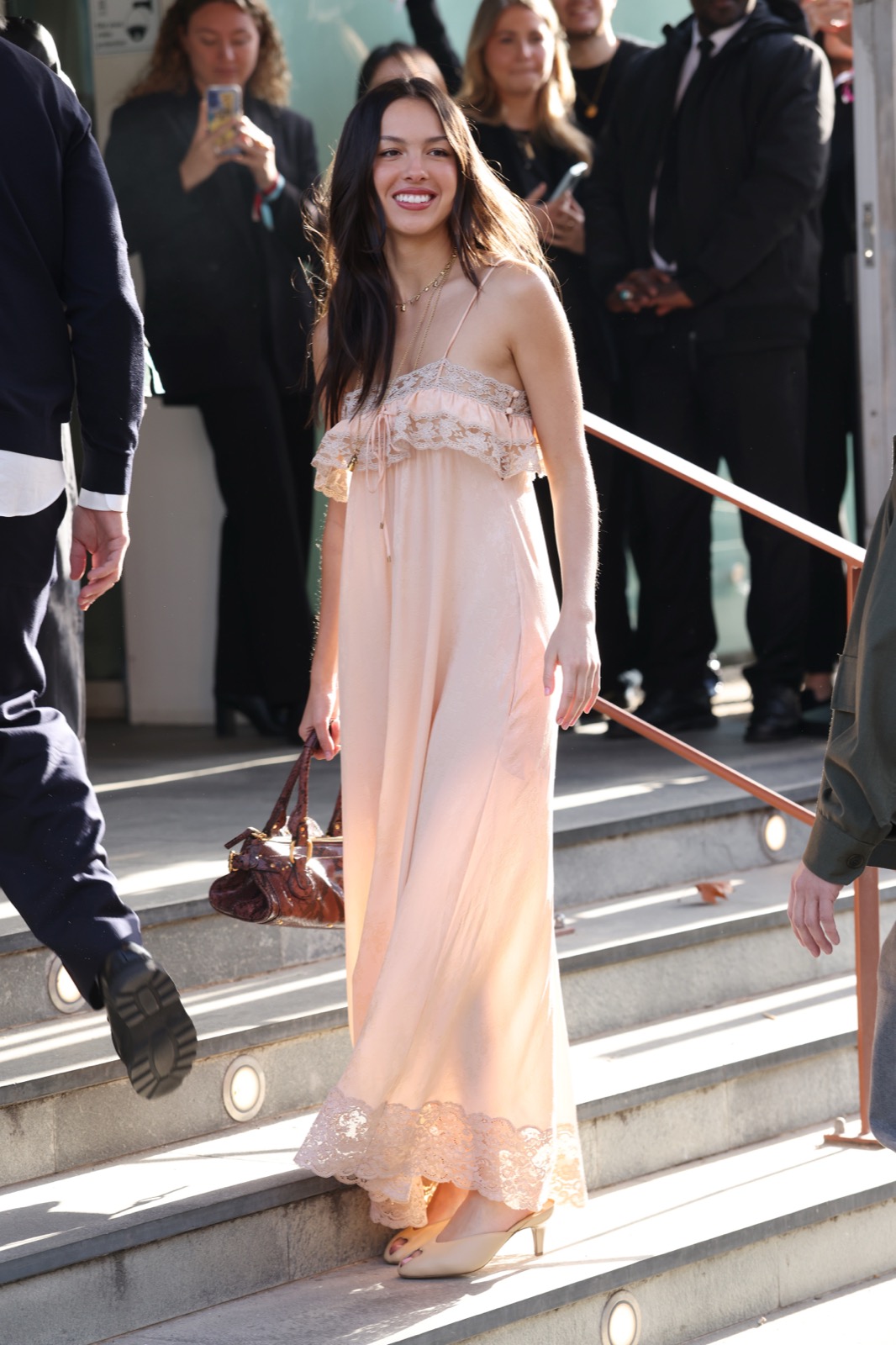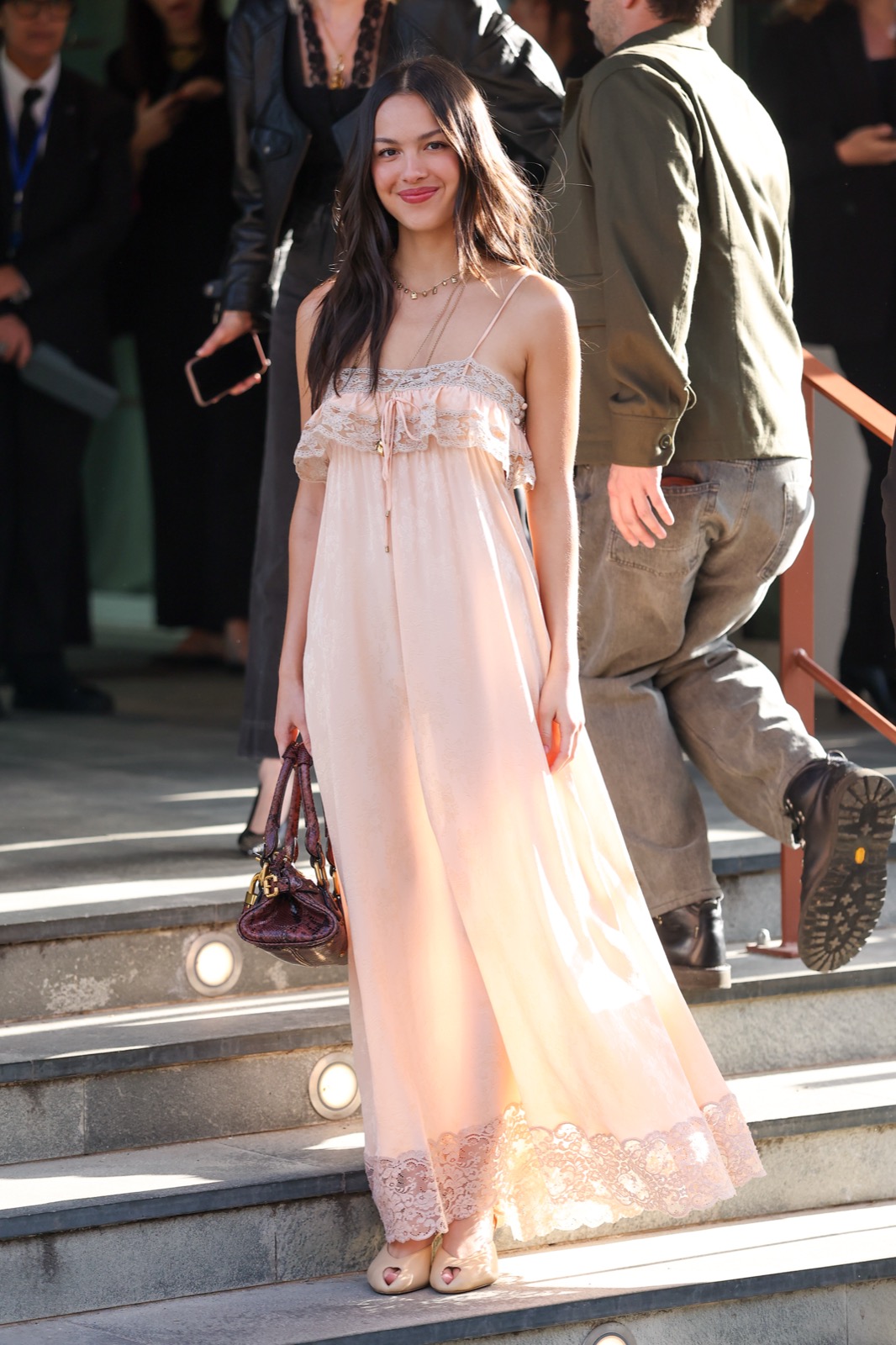 À l’arrivée du défilé Chloé, Olivia descend les escaliers comme dans un clip secret de GUTS, sourire espiègle et fans figés en mode pause.