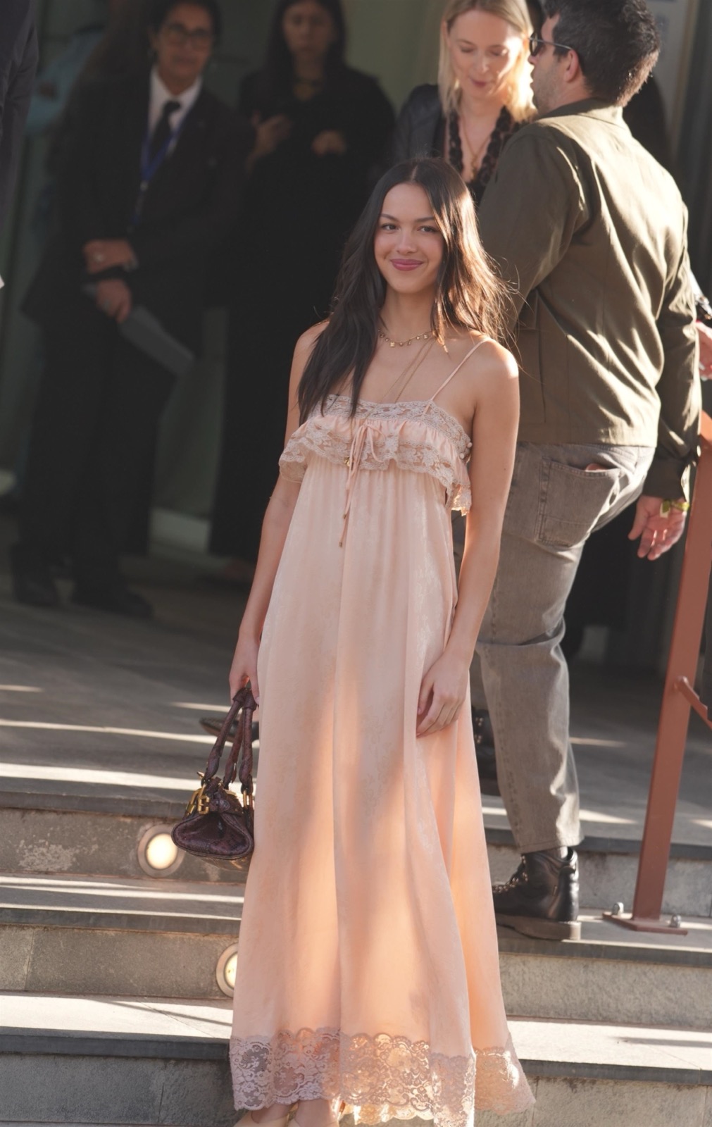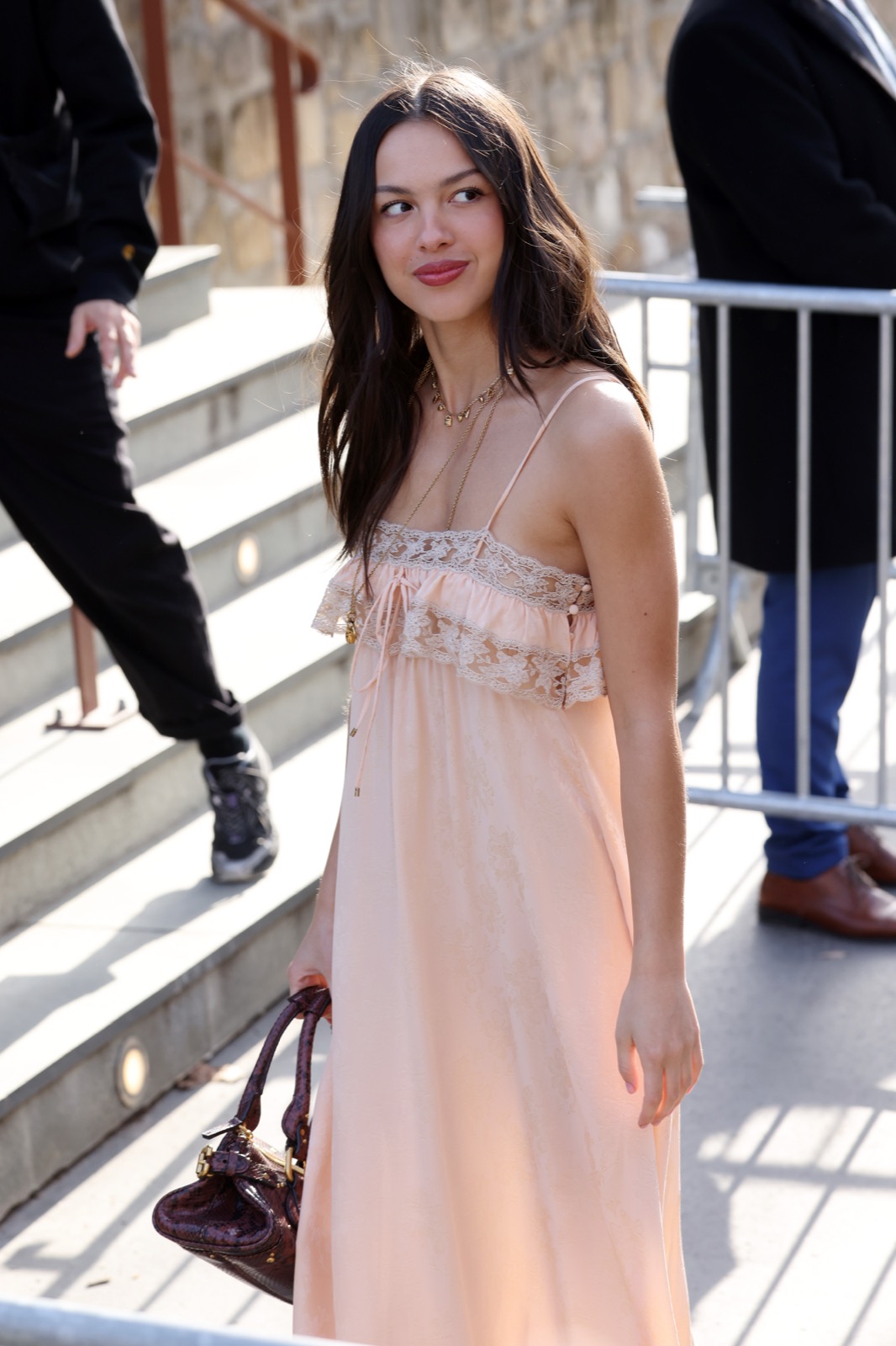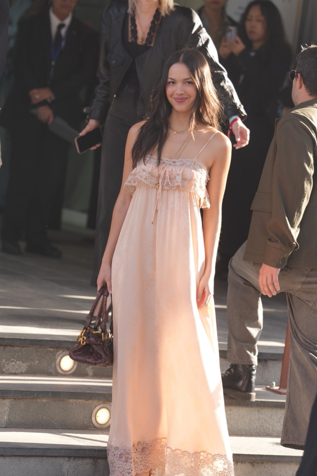 À l’arrivée du défilé Chloé, Olivia descend les escaliers comme dans un clip secret de GUTS, sourire espiègle et fans figés en mode pause.