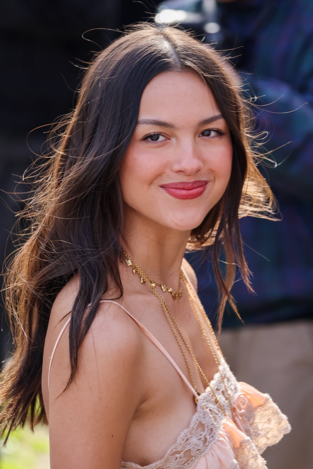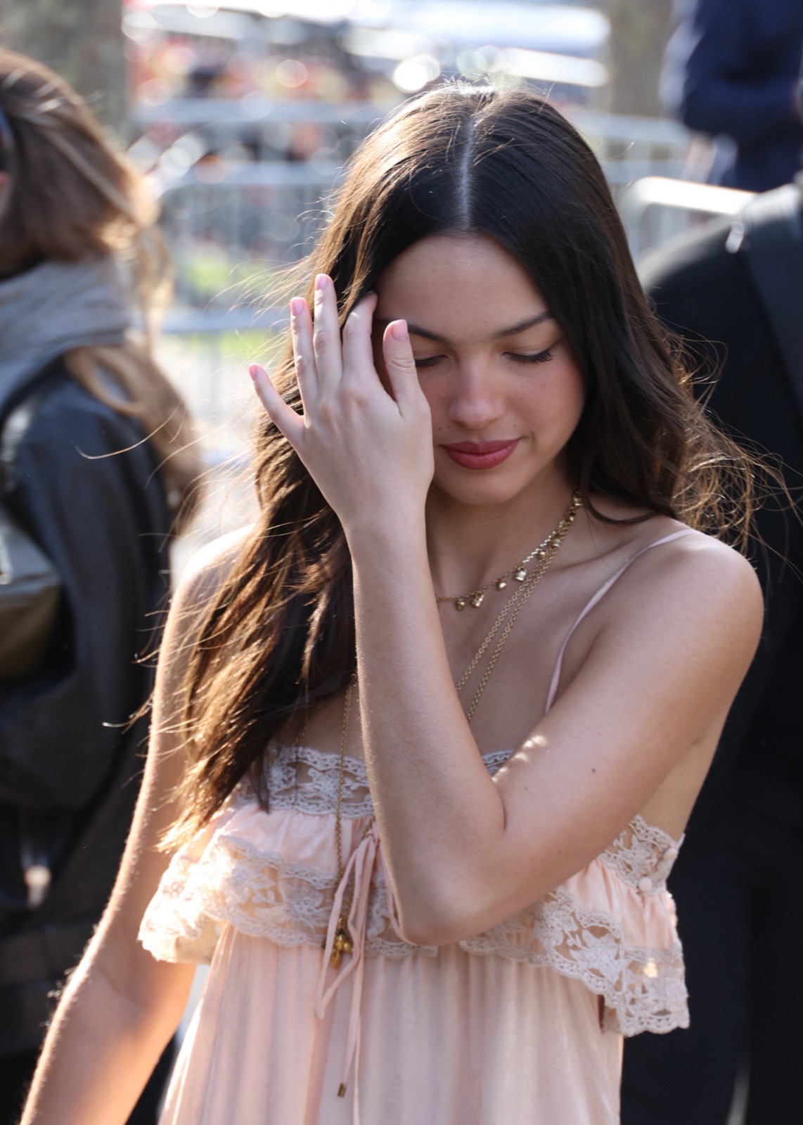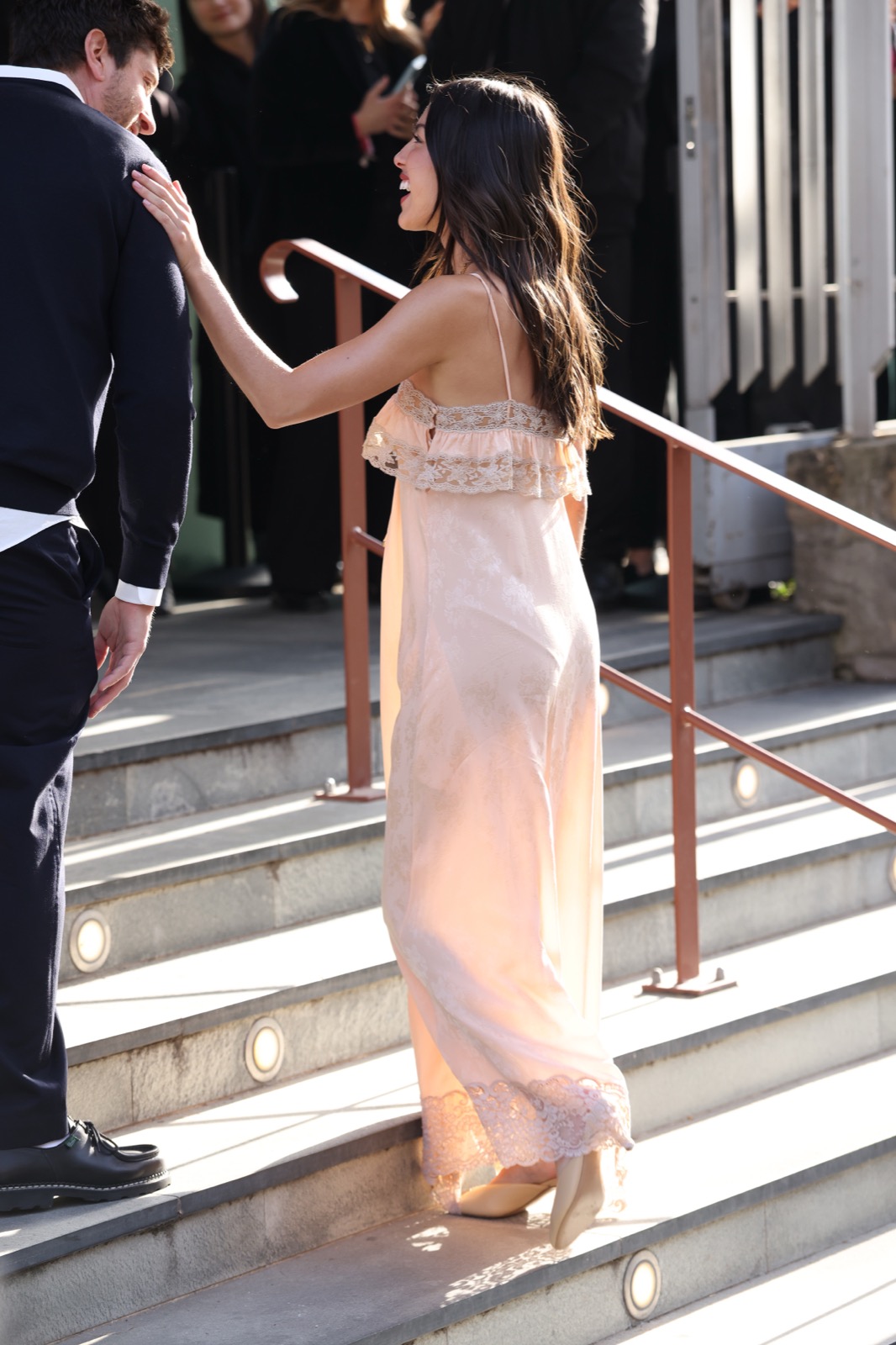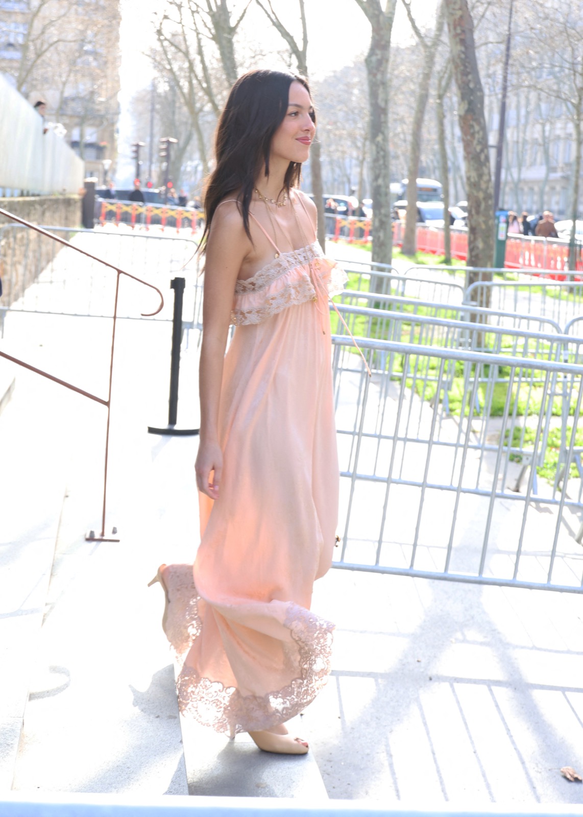 À l’arrivée du défilé Chloé, Olivia descend les escaliers comme dans un clip secret de GUTS, sourire espiègle et fans figés en mode pause.