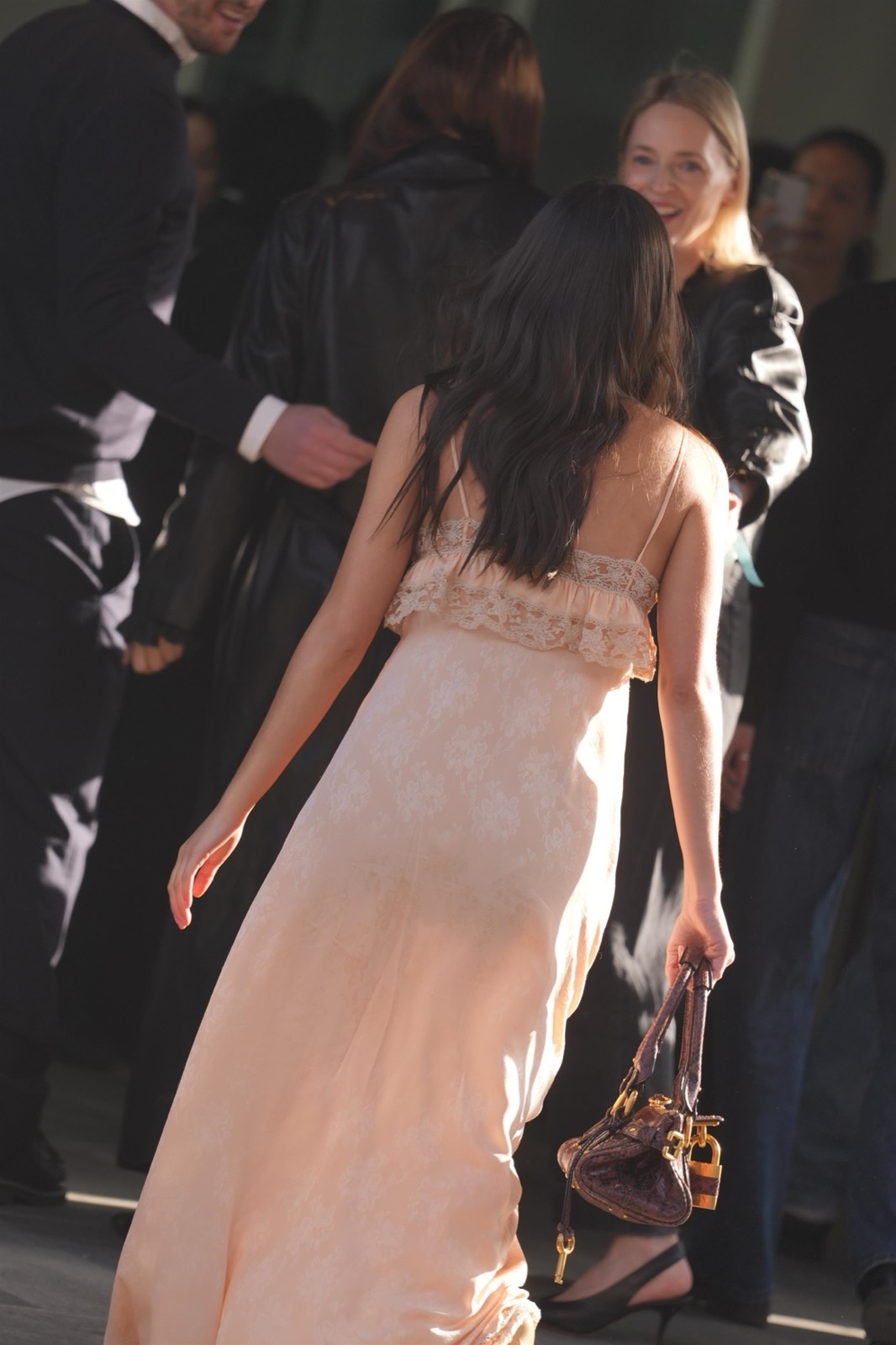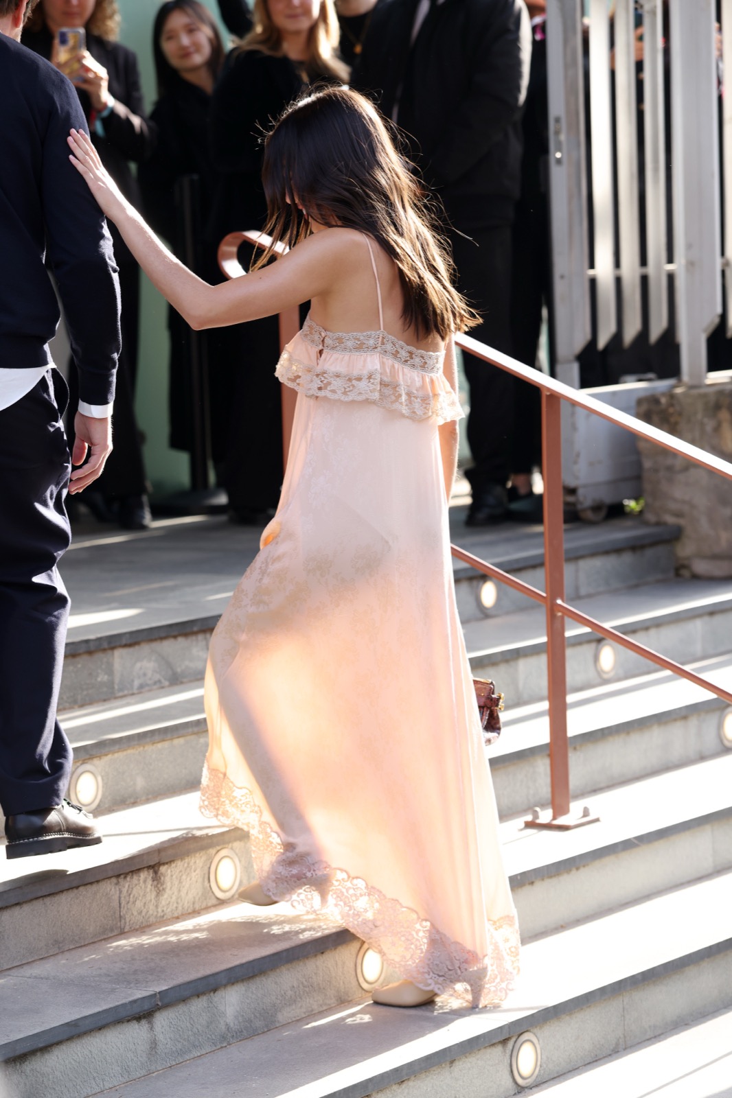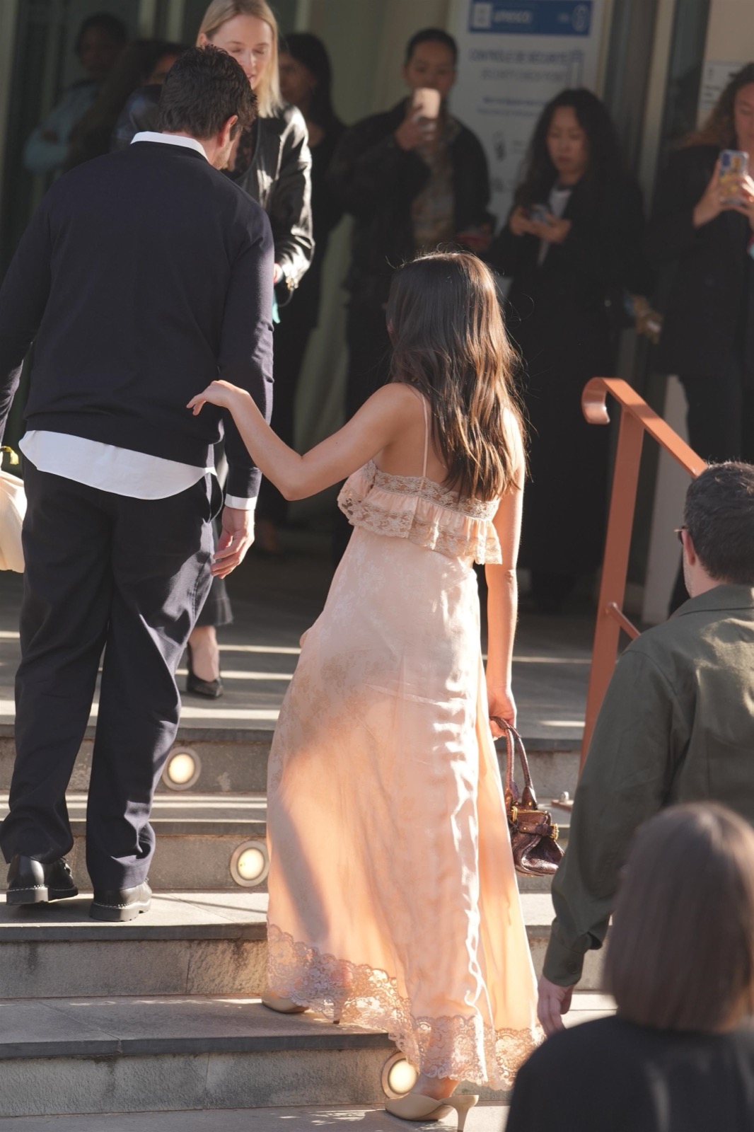 Sa robe nude en dentelle ondule doucement, sa silhouette délicate capte tous les regards. Un photographe a failli applaudir… par réflexe esthétique.