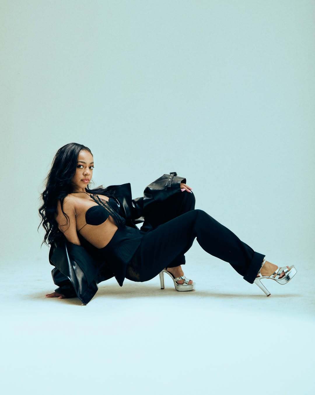 Son manteau noir oversize glisse sur ses épaules, sa silhouette sculptée joue avec les angles. Un photographe a brièvement oublié comment respirer.