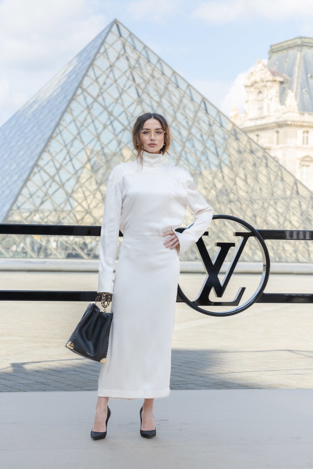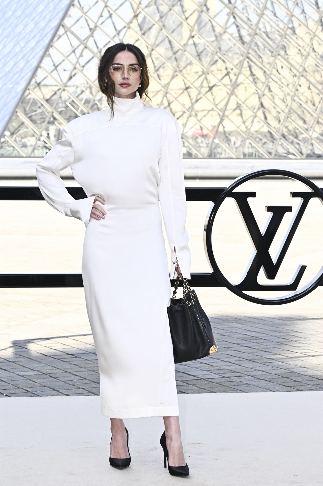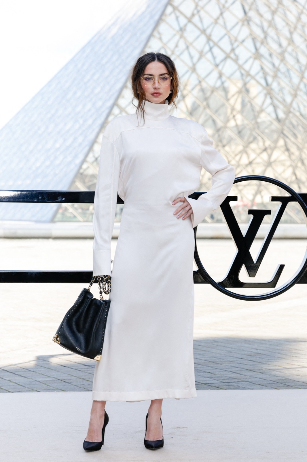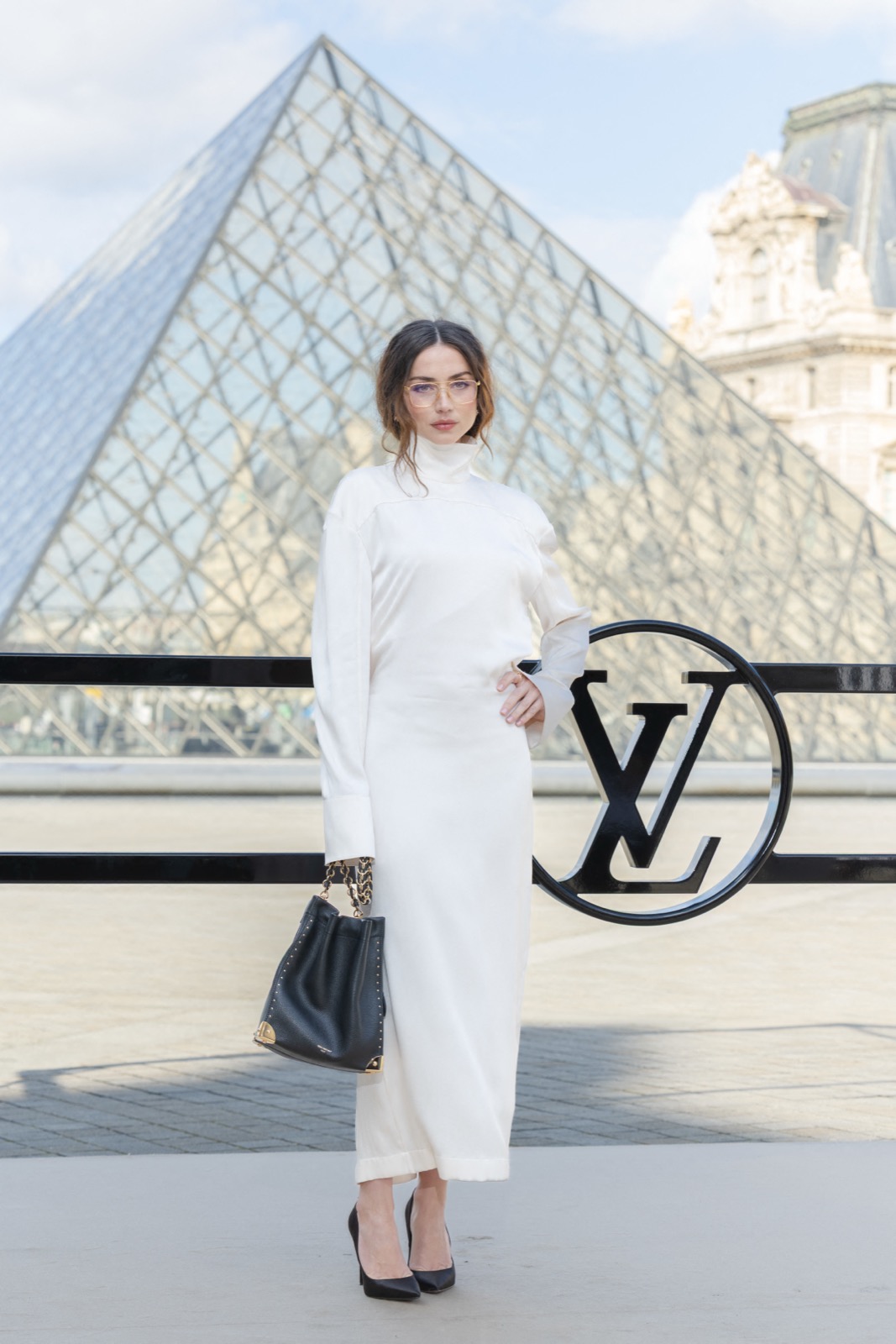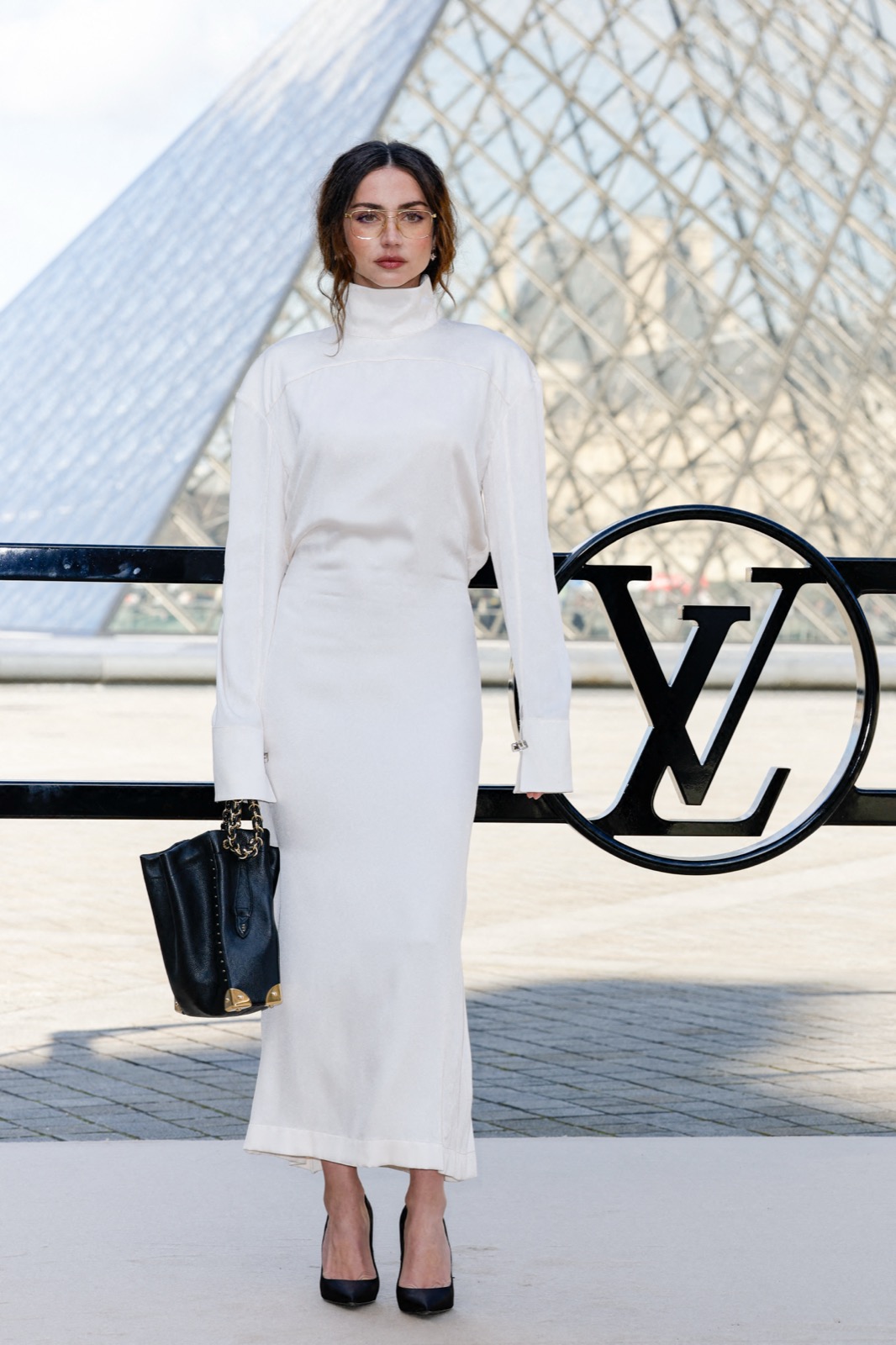 Devant la pyramide du Louvre au défilé Louis Vuitton, Ana de Armas pose façon statue chic. Regard froid, sac noir serré… même les pigeons marchent au ralenti.