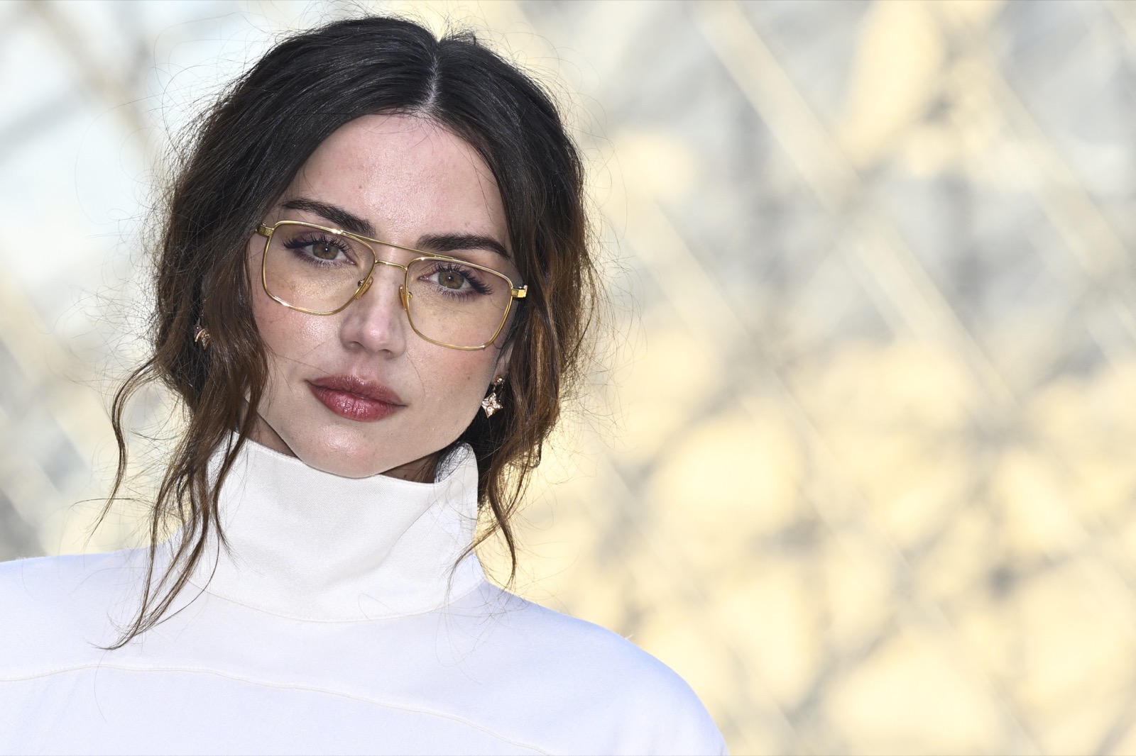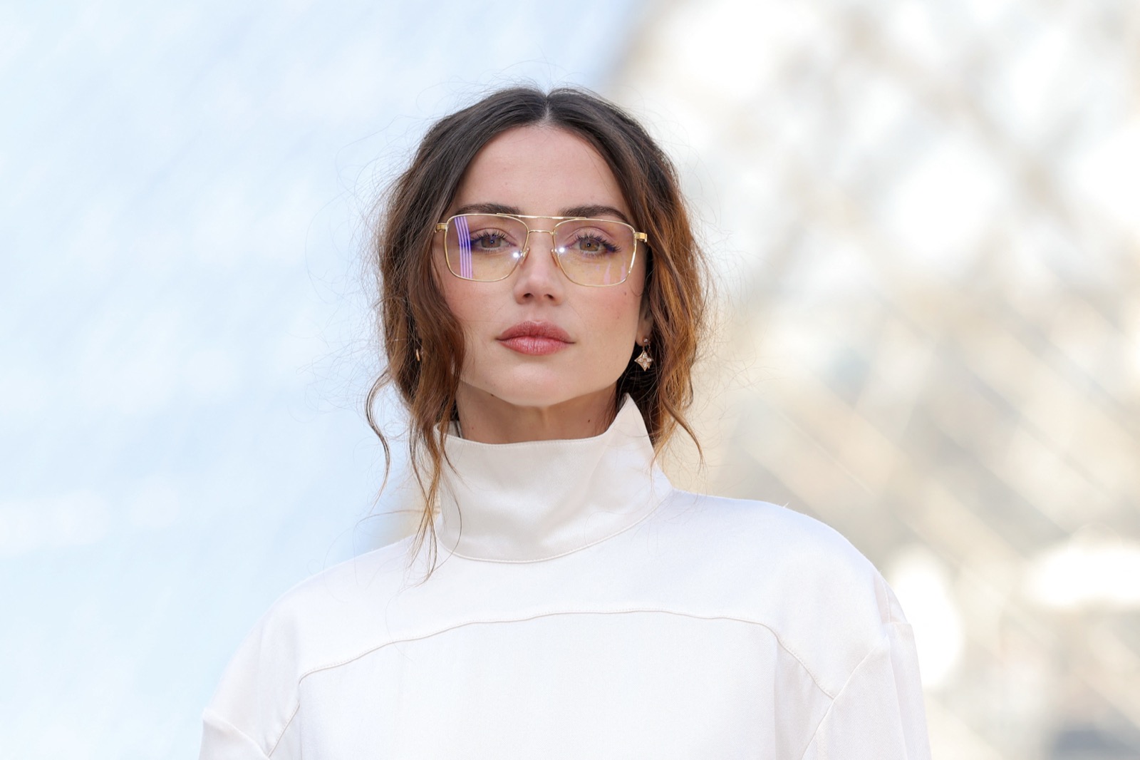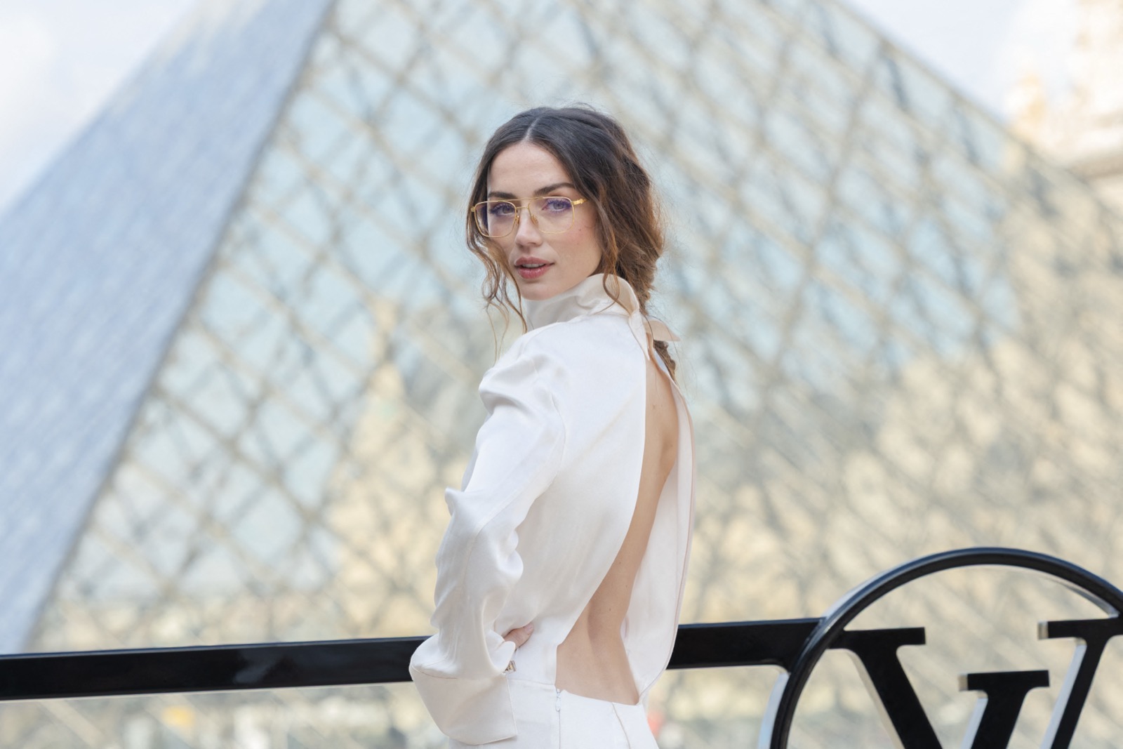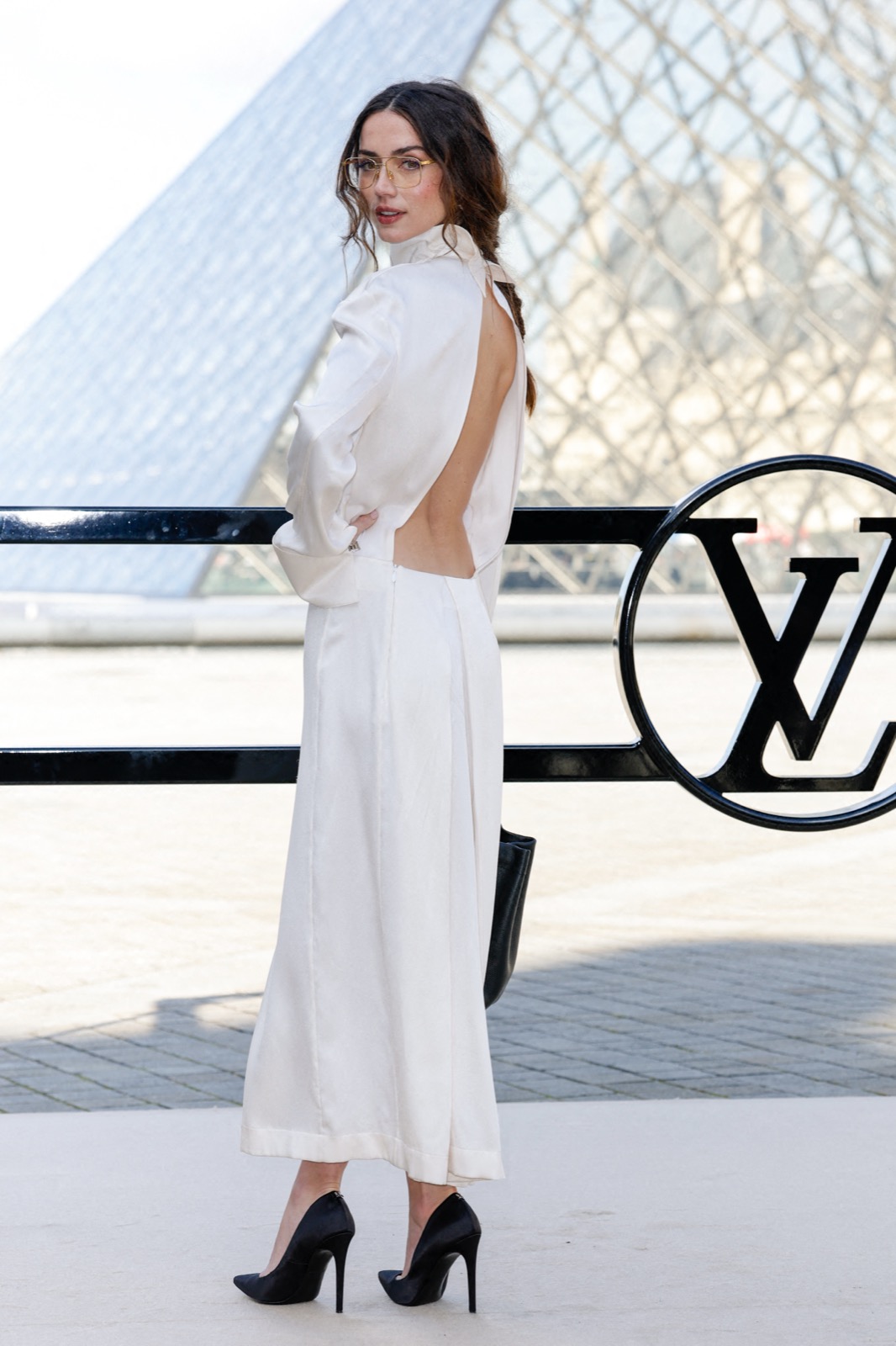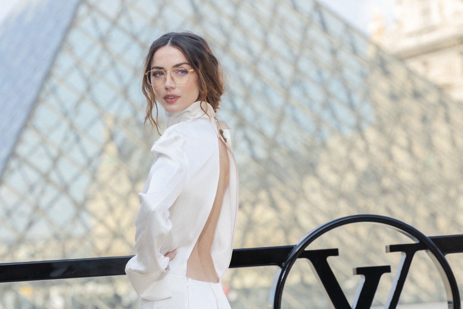 Devant la pyramide du Louvre au défilé Louis Vuitton, Ana de Armas pose façon statue chic. Regard froid, sac noir serré… même les pigeons marchent au ralenti.