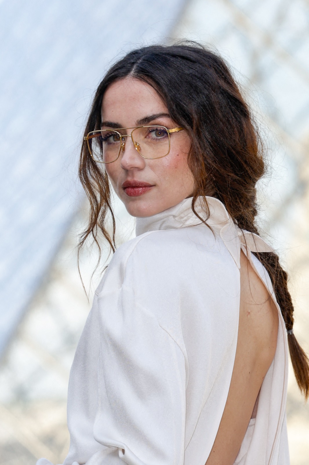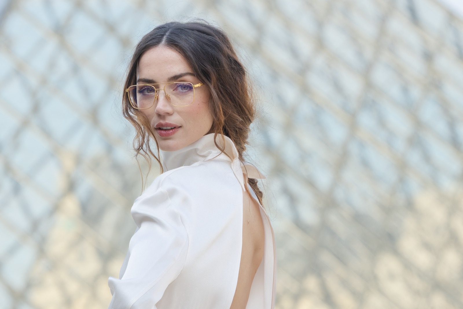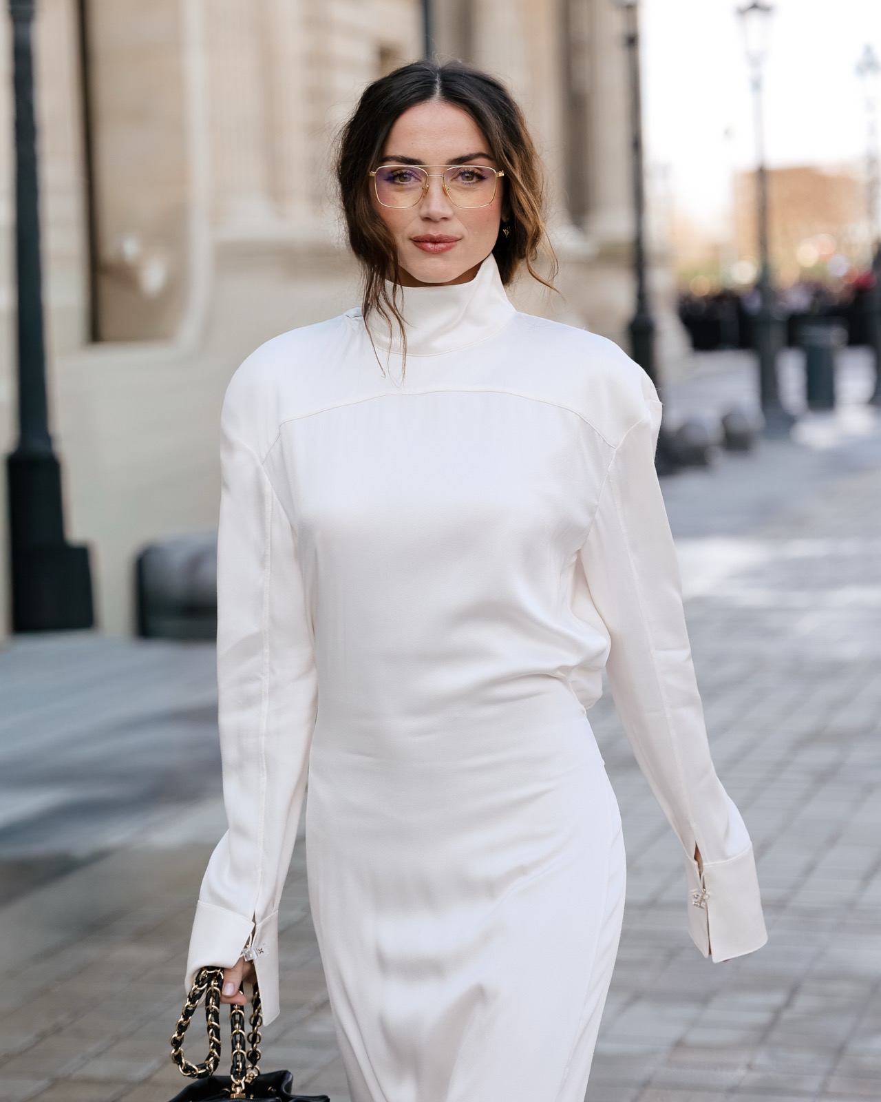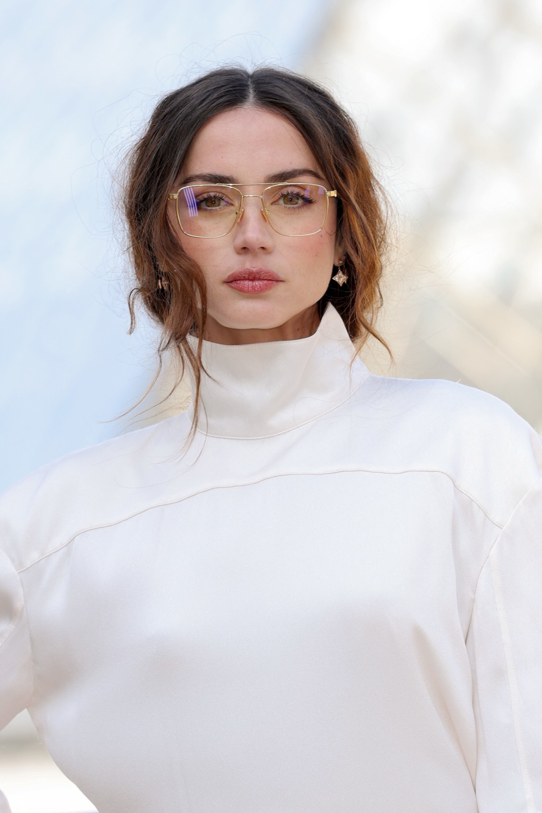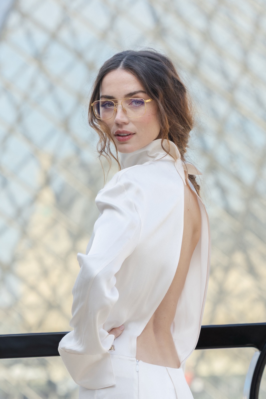 Devant la pyramide du Louvre au défilé Louis Vuitton, Ana de Armas pose façon statue chic. Regard froid, sac noir serré… même les pigeons marchent au ralenti.