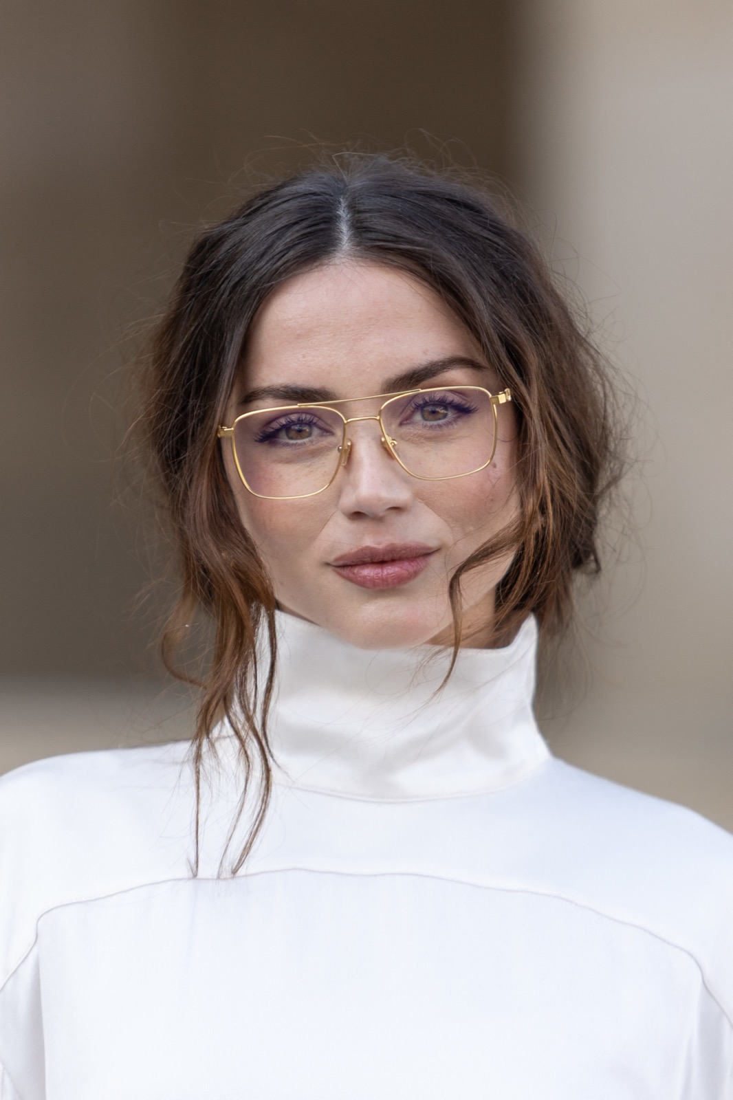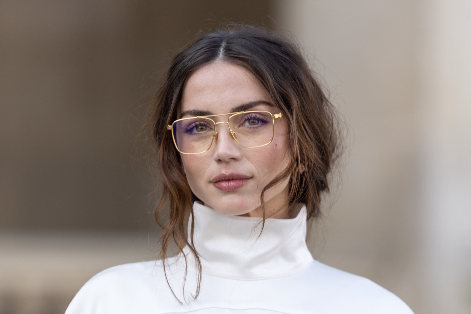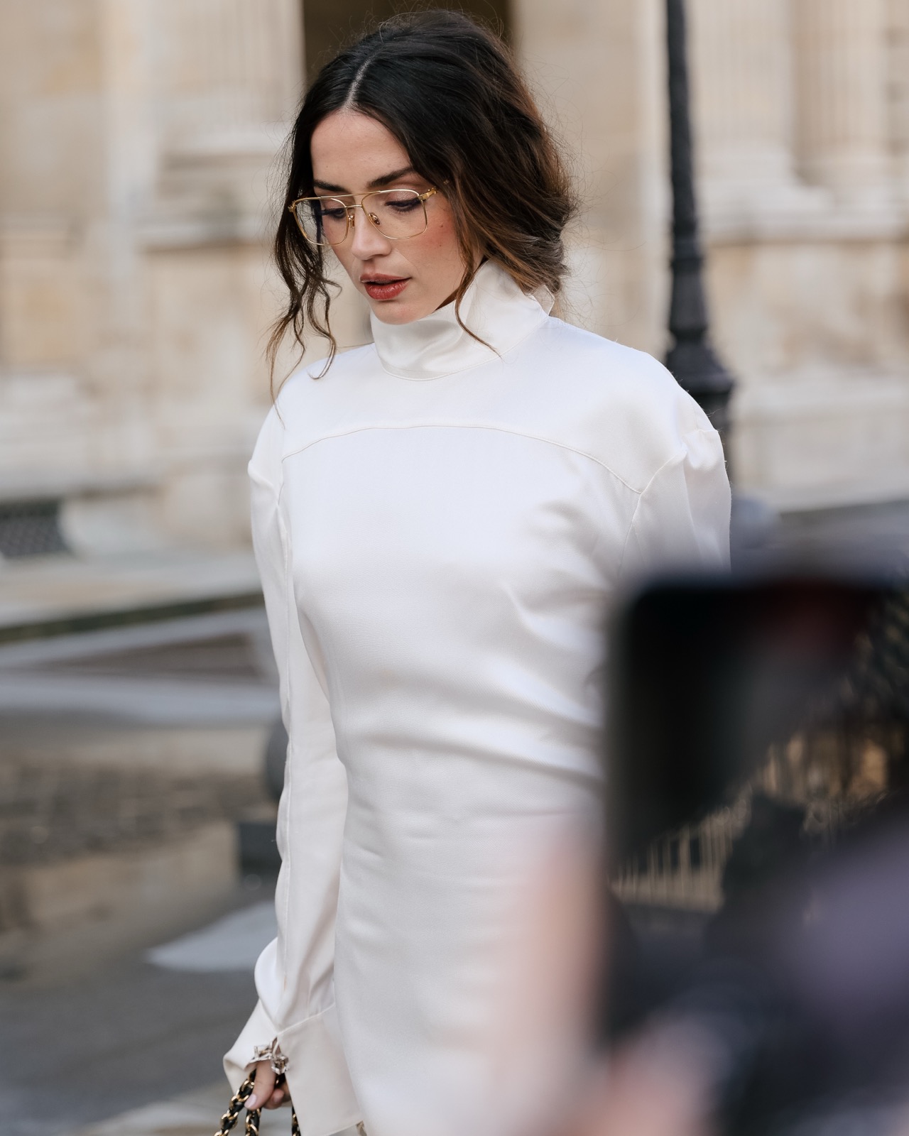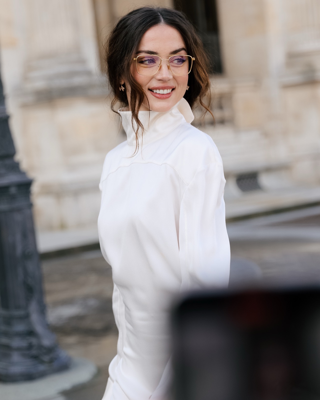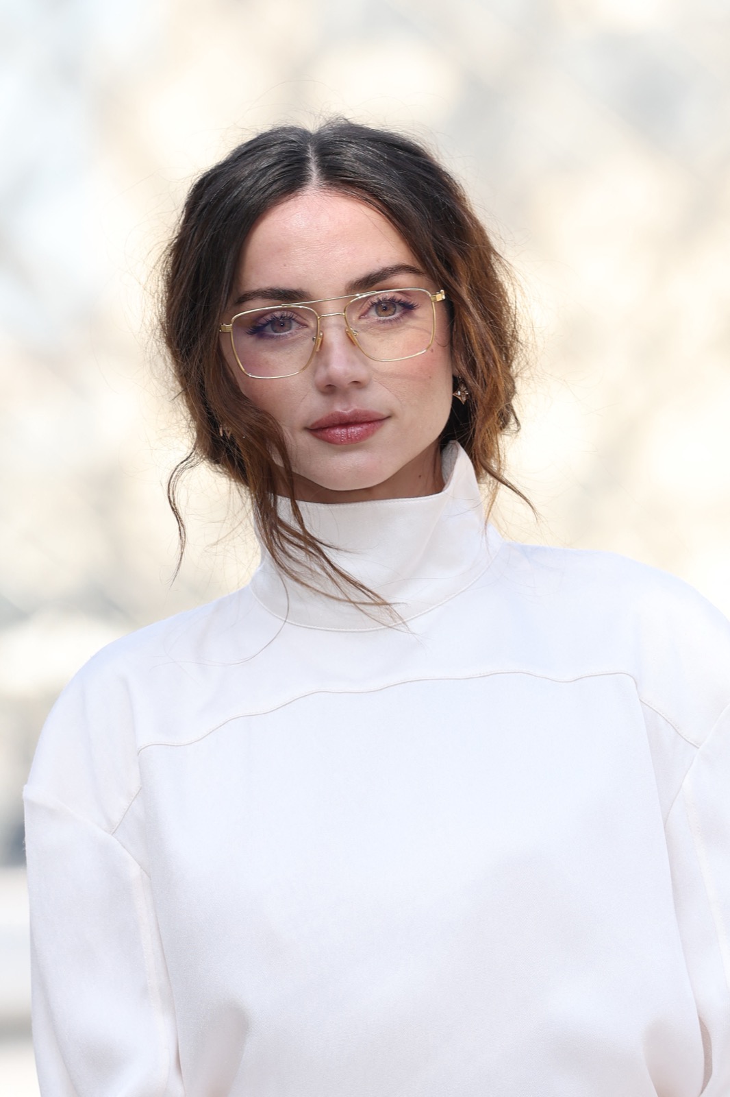 Devant la pyramide du Louvre au défilé Louis Vuitton, Ana de Armas pose façon statue chic. Regard froid, sac noir serré… même les pigeons marchent au ralenti.