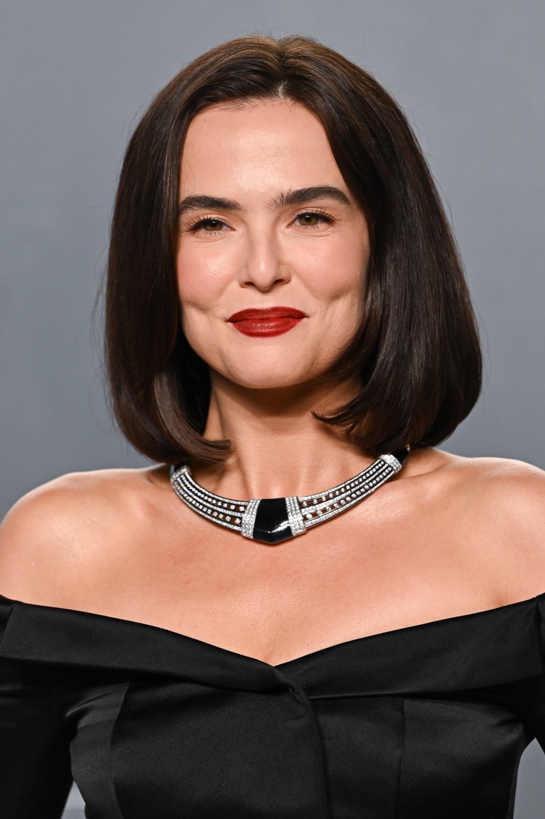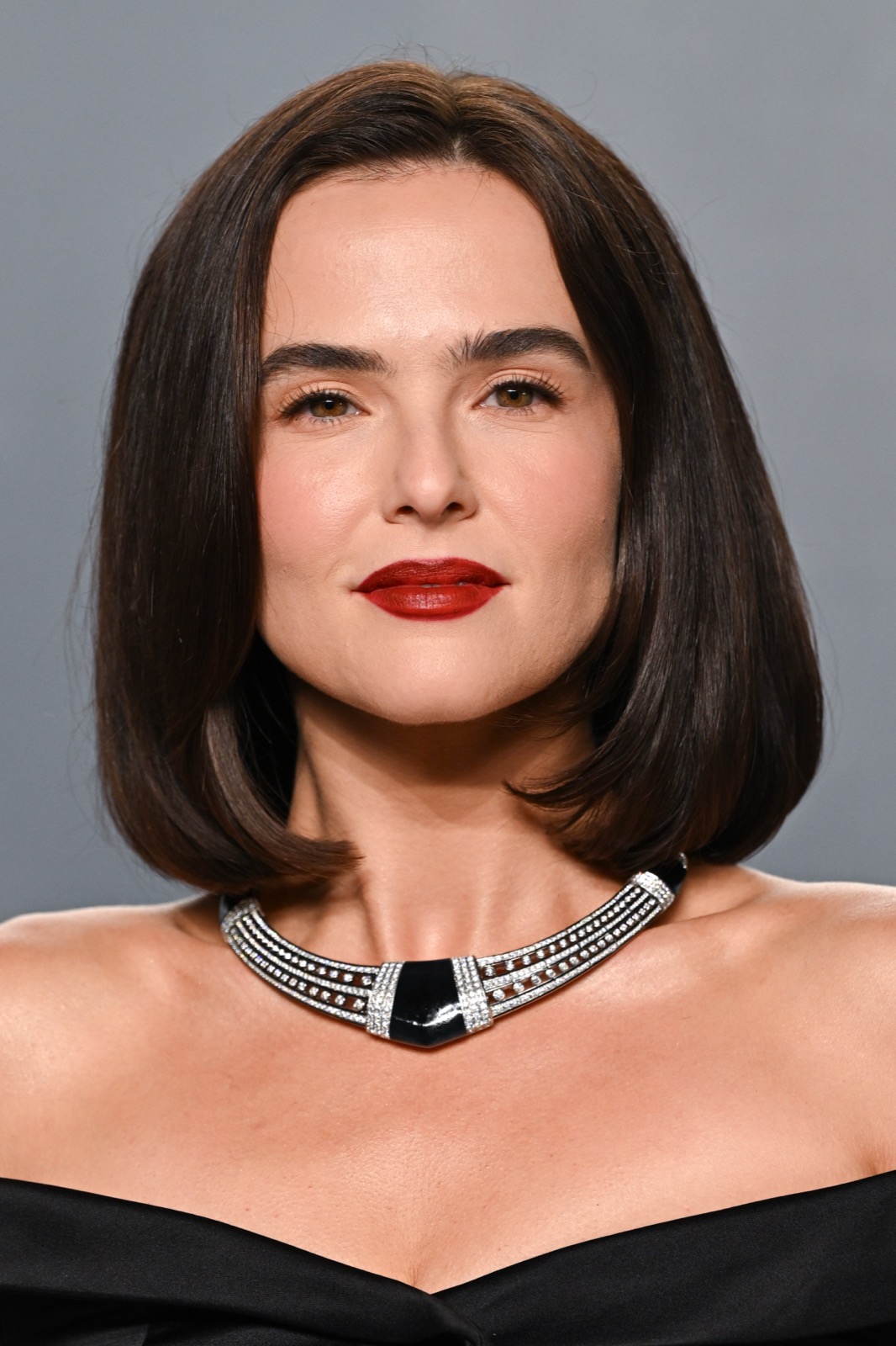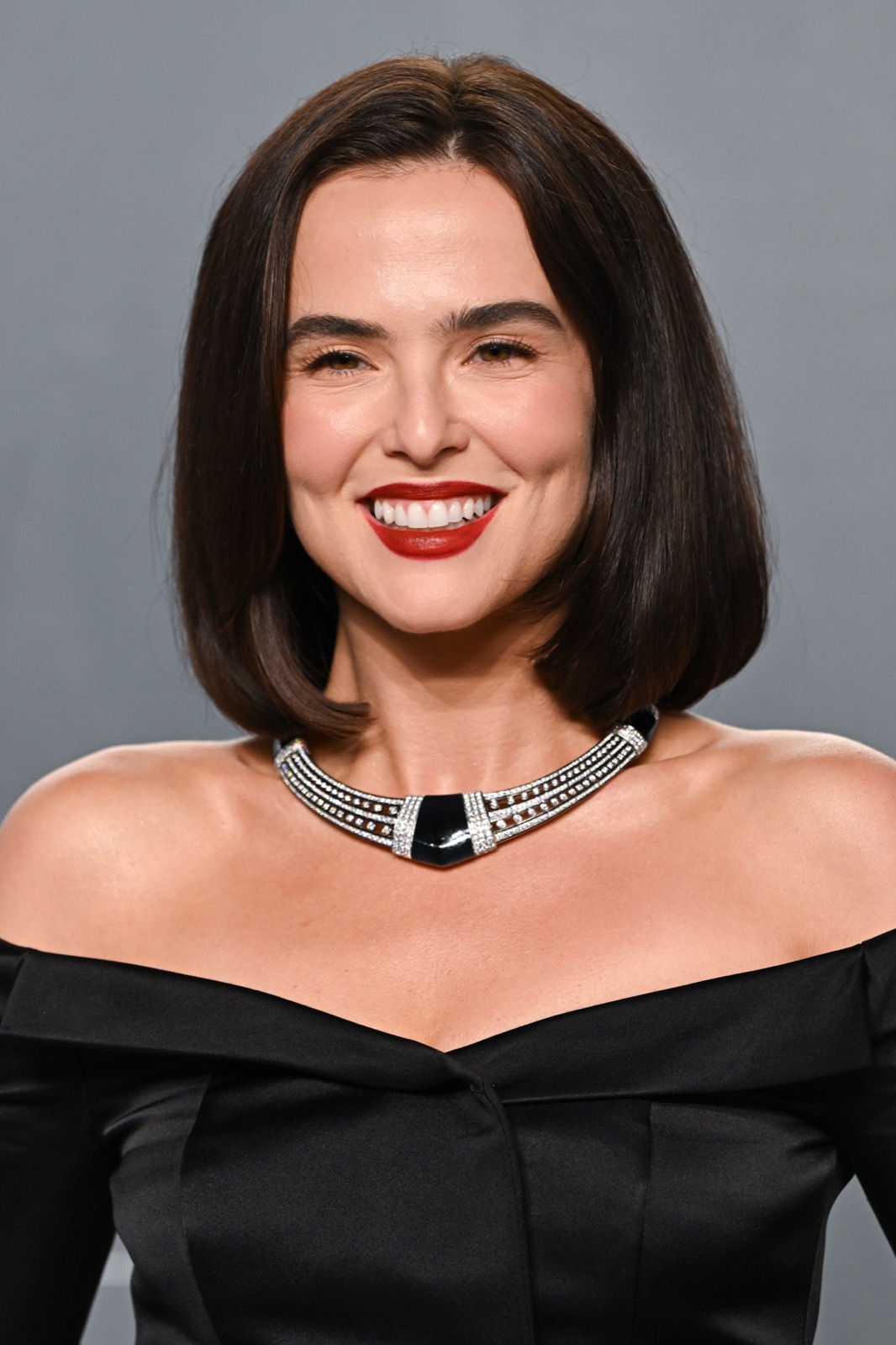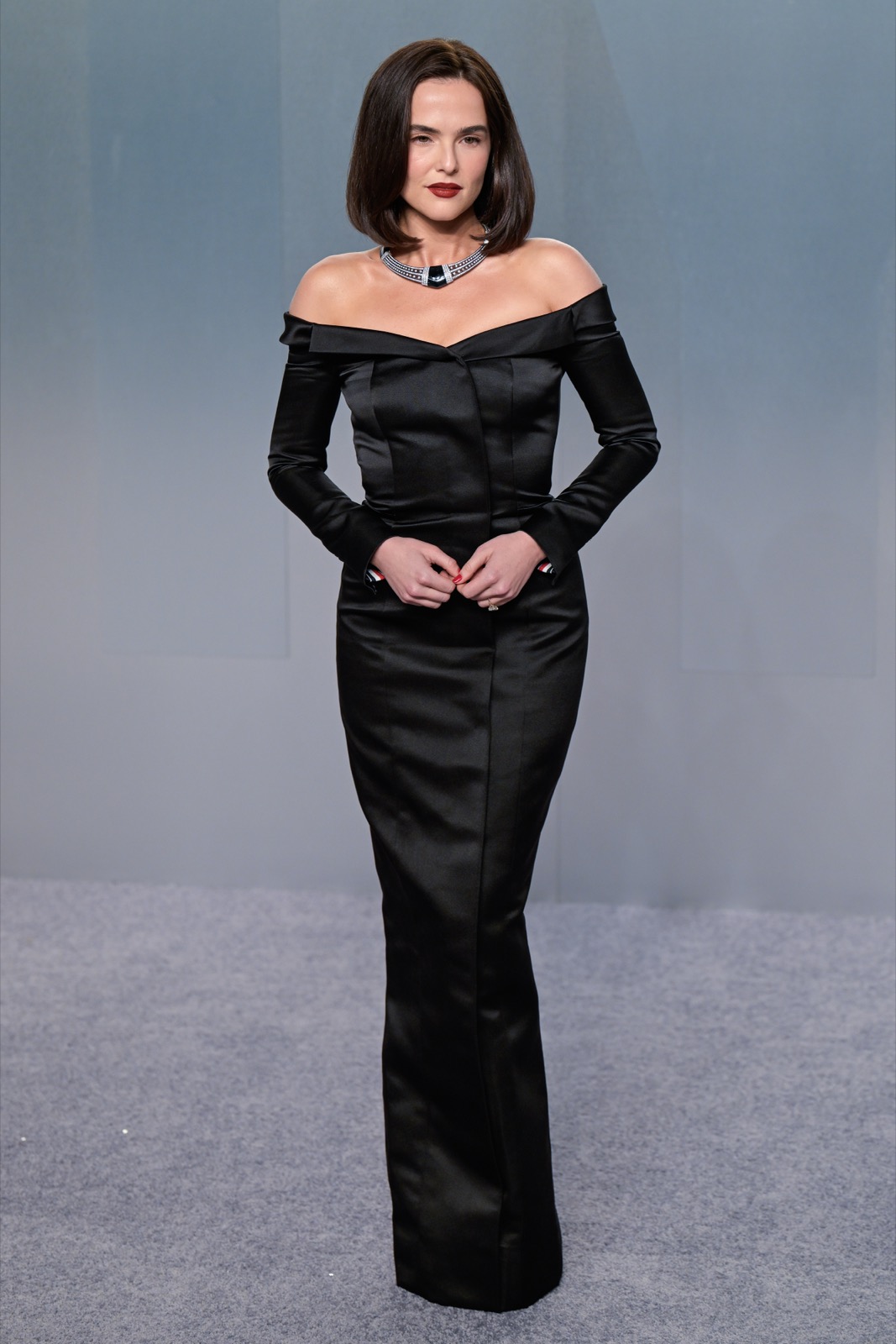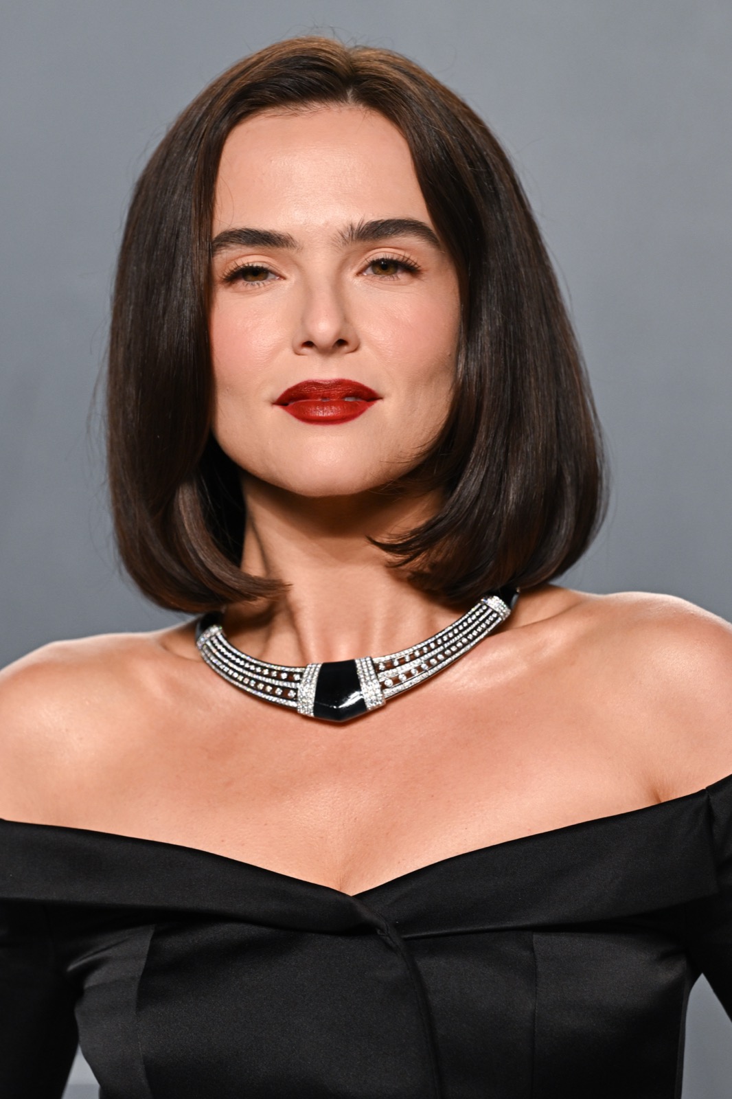 À la soirée Vanity Fair, Zoey Deutch débarque en robe noire épaules nues, collier graphique au cou et carré impeccable, l’air de venir licencier la banalité.